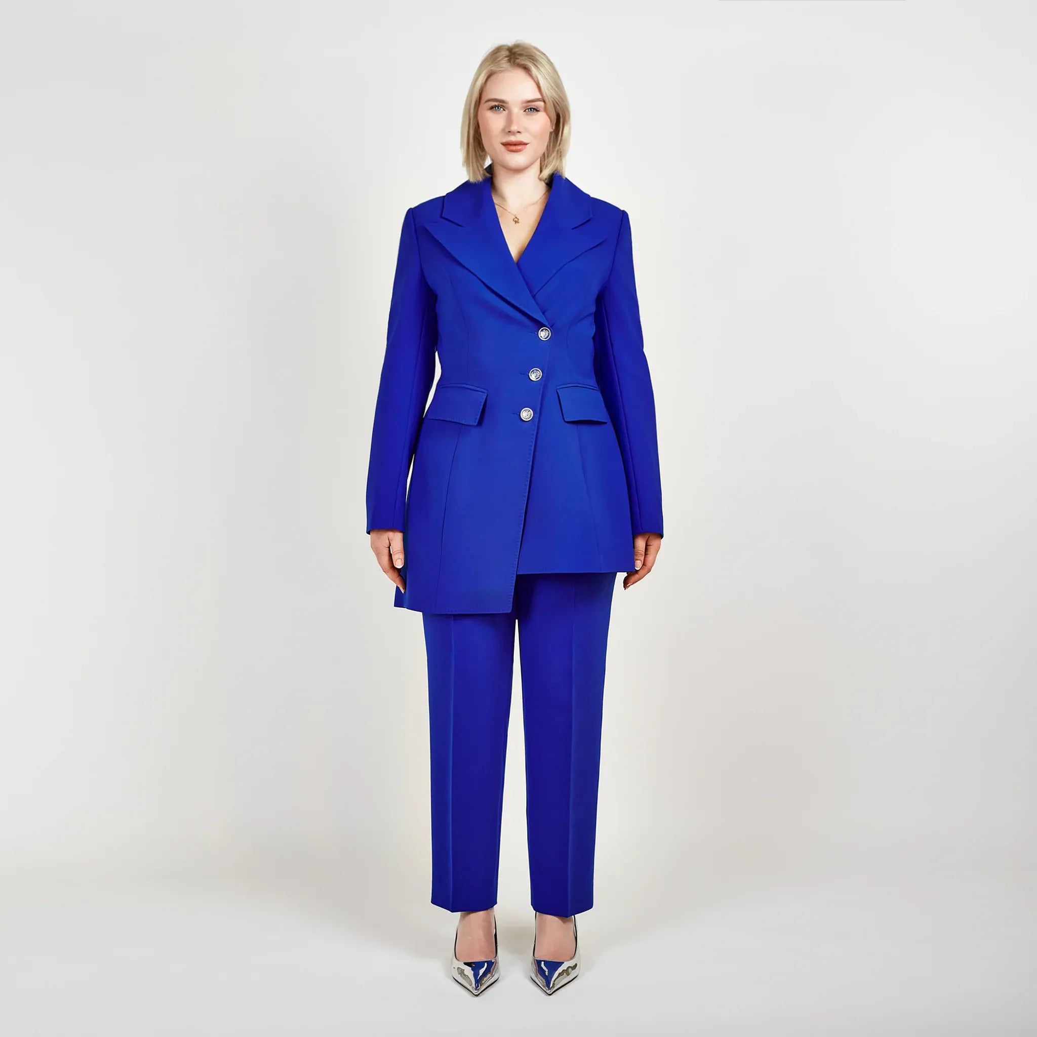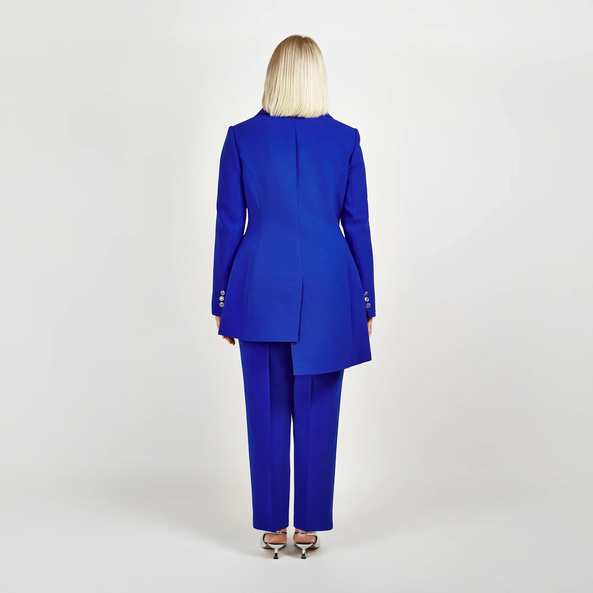 Versatile for dressing up or down, the Femponiq Asymmetric Double Breasted Tailored Blazer in Royal Blue is a standout piece for your wardrobe. Crafted from medium-weight crepe fabric, this chic blazer offers timeless elegance and refined luxury.