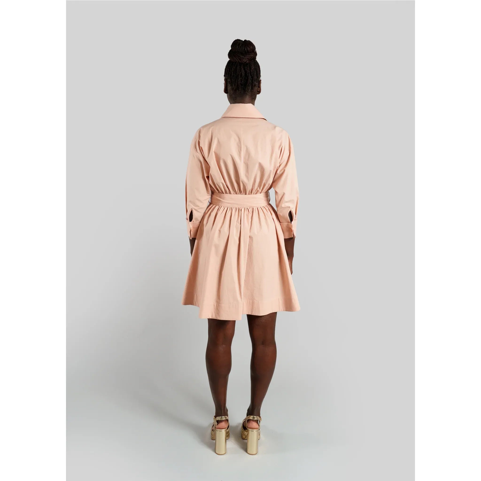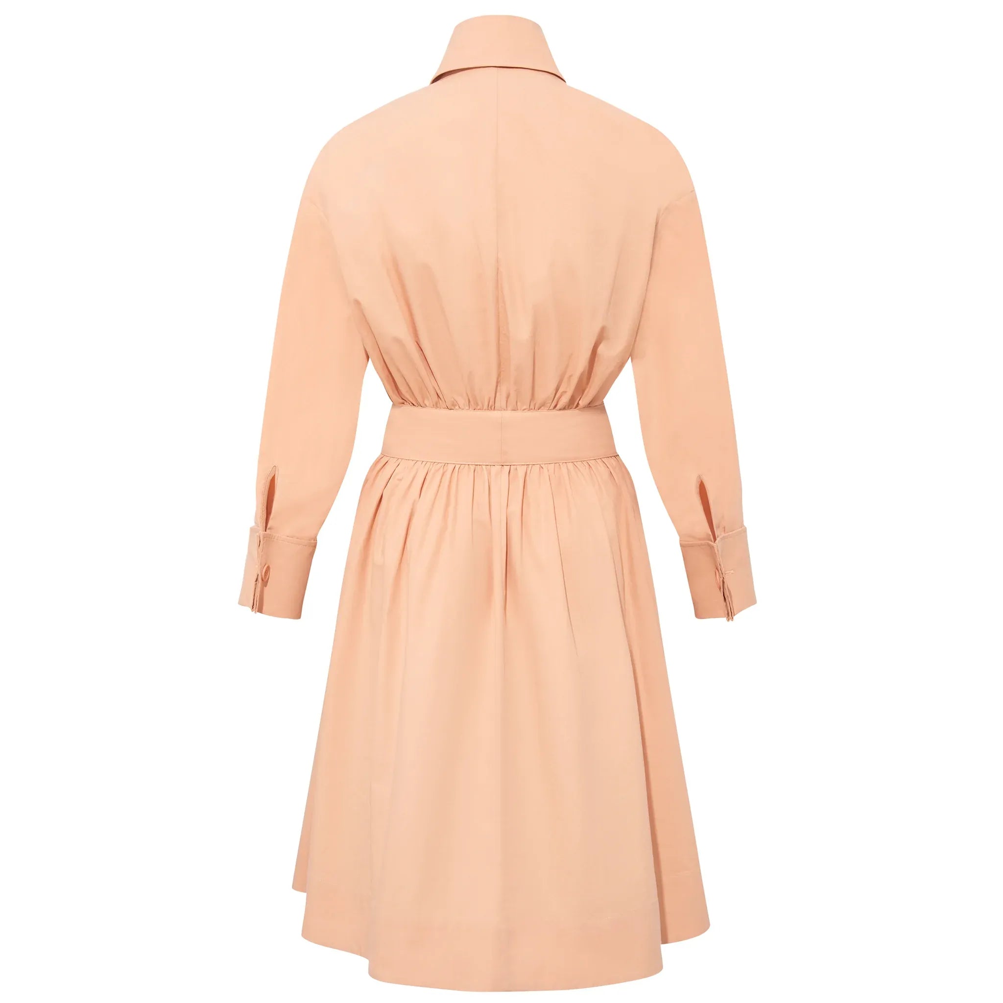 Discover the allure of the Femponiq Peach Belted Shirt Dress, where effortless style meets impeccable craftsmanship. Designed for a relaxed fit, it has a smart pointed collar and is crafted in London from a medium-weight cotton fabric which ensures supreme comfort with its adjustable waist tie-belt. The sculptural bow detail elevates its chic appeal while its silhouette embraces femininity in maximum bloom. It is adorned with 2 unique buttons on each double French cuff and features a concealed placket fastening with lined buttons, cropped length sleeves, dropped shoulders, a gathered rear waistline and above-knee length.