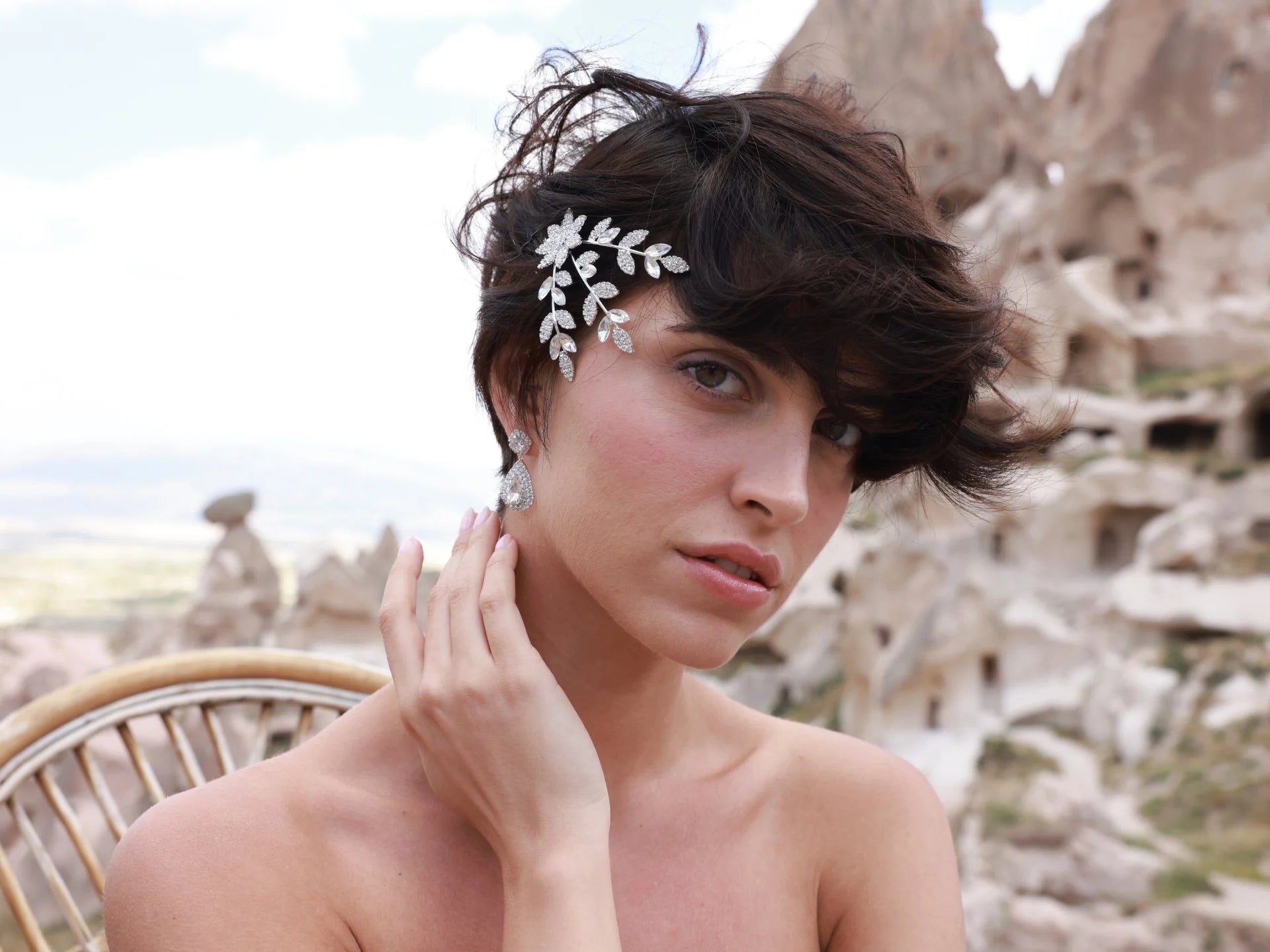 The material of the product is high quality brass with rhodium plating. The materials of the stones on it are crystal stone and zircon stone. It is recommended not to contact with chemicals such as perfume and detergent for long-term use and not to lose its shine.