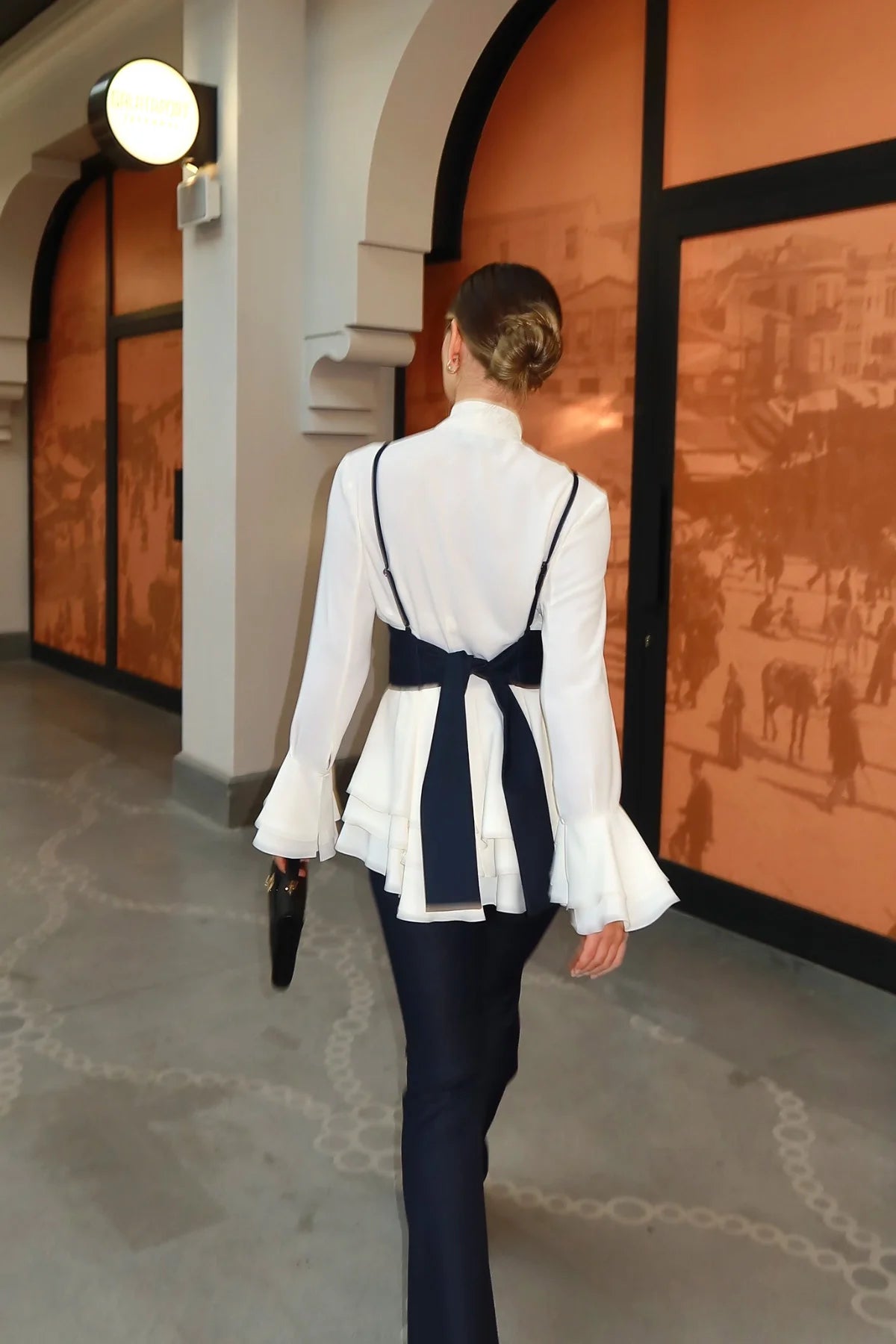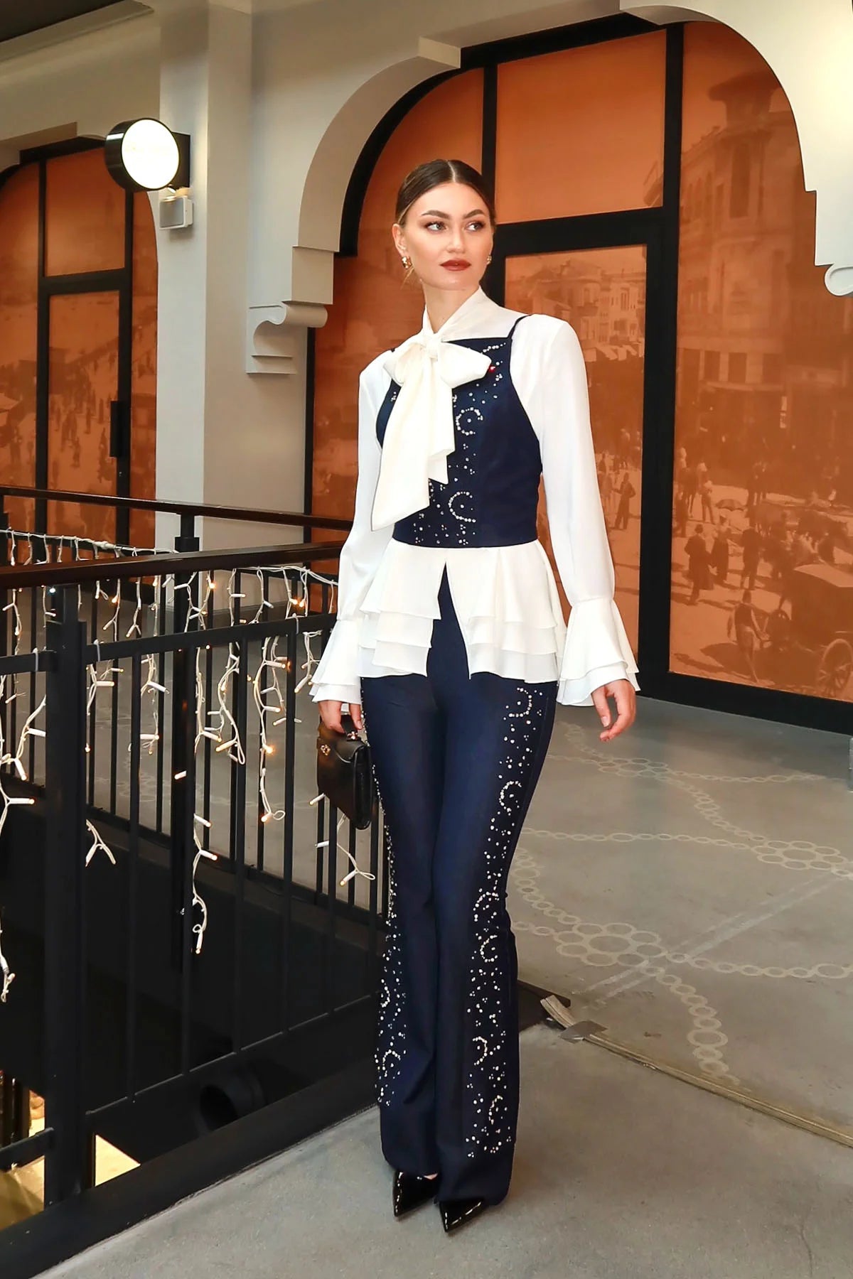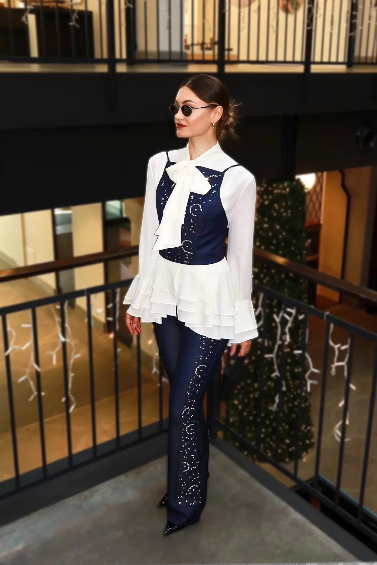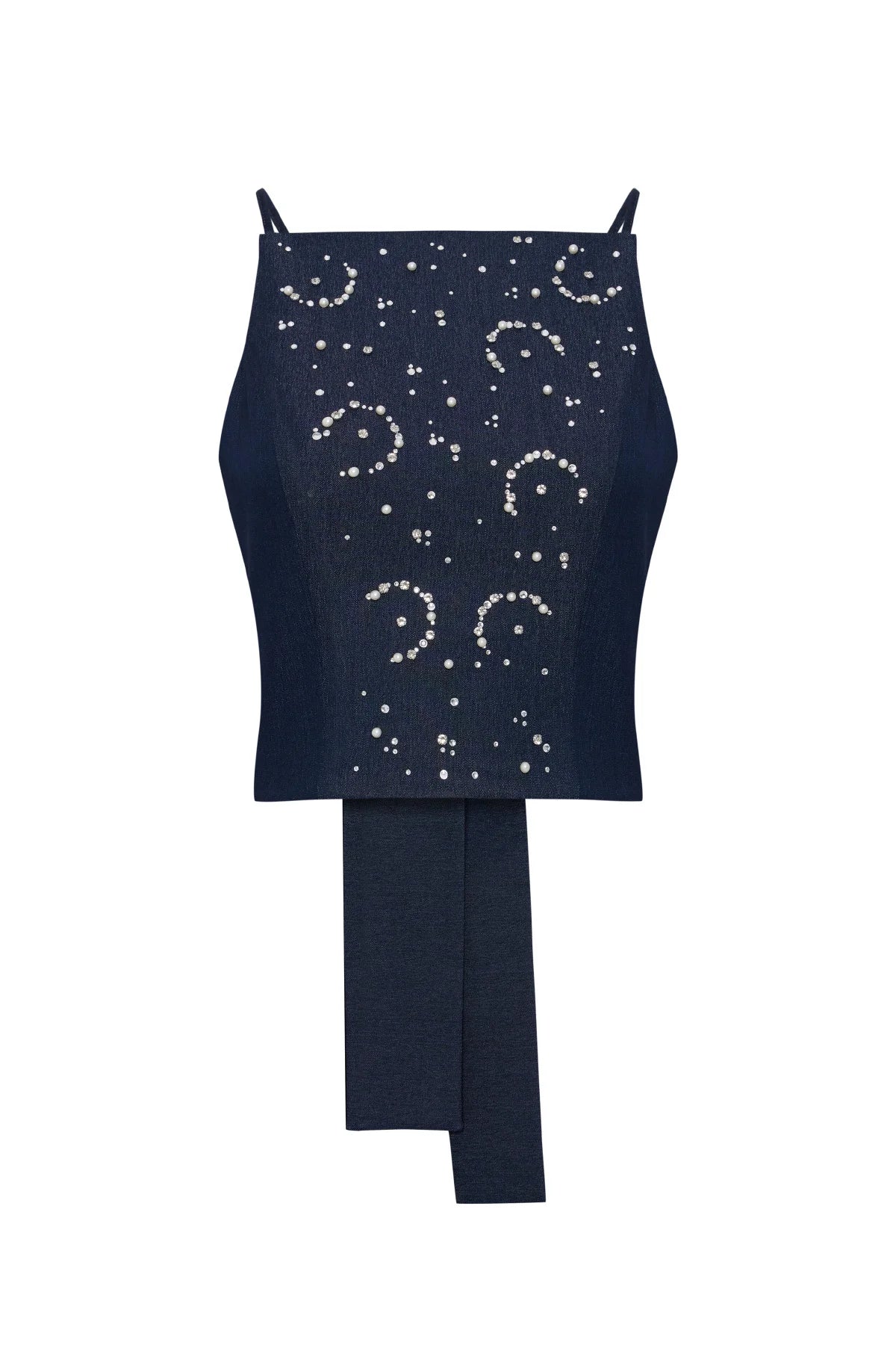 The Northstar Belted Blouse in Navy is a stylish, versatile piece with a flattering design. Made from high-quality denim fabric, this blouse features a unique stone-embellished design that adds a touch of glamour. The adjustable straps and back tie closure ensure a perfect fit, while the belted waist creates a defined silhouette. Ideal for both formal and casual occasions, this blouse is a perfect addition to any wardrobe.