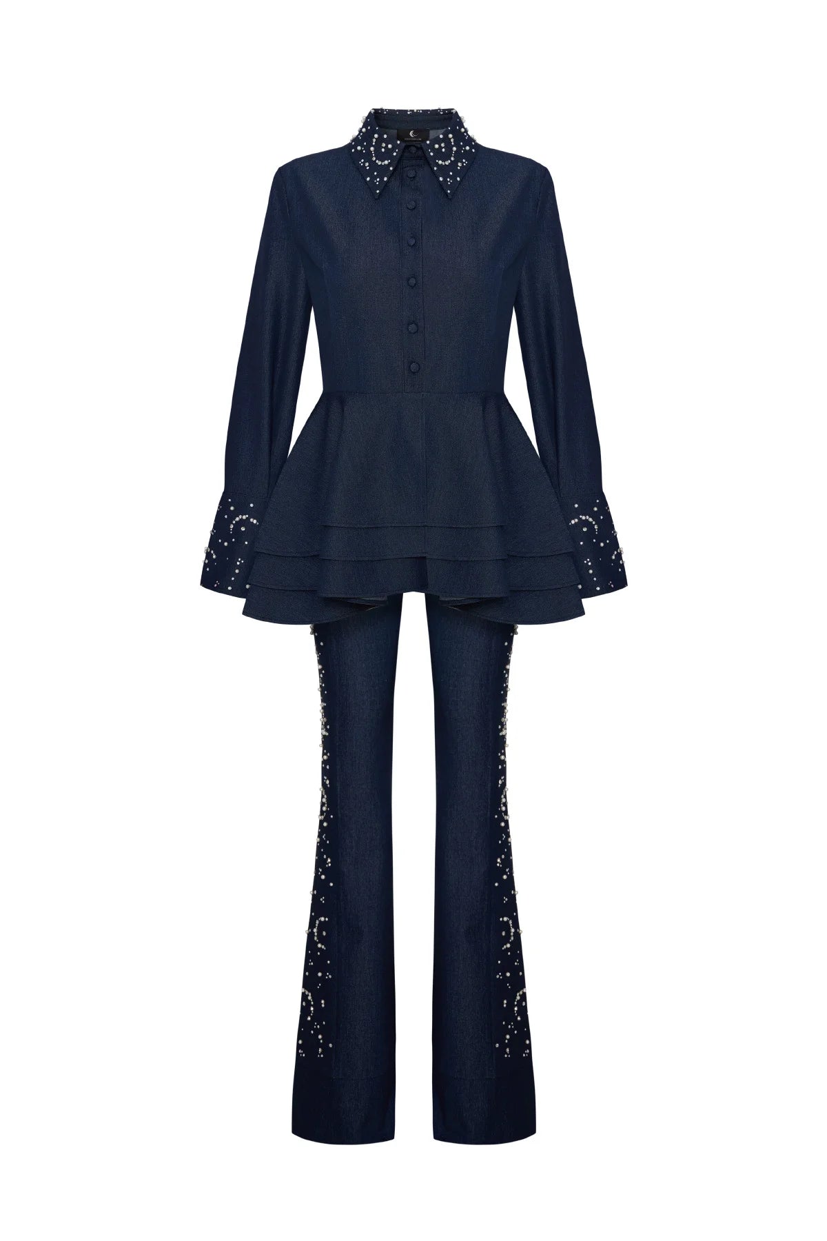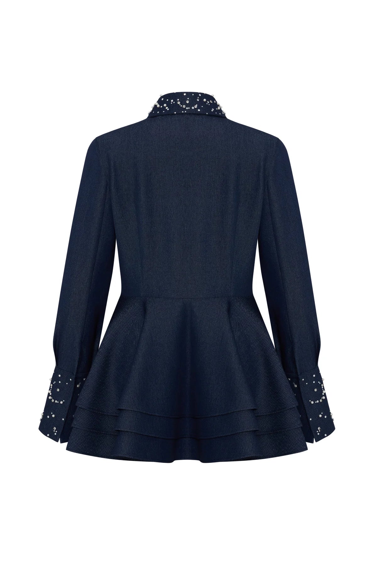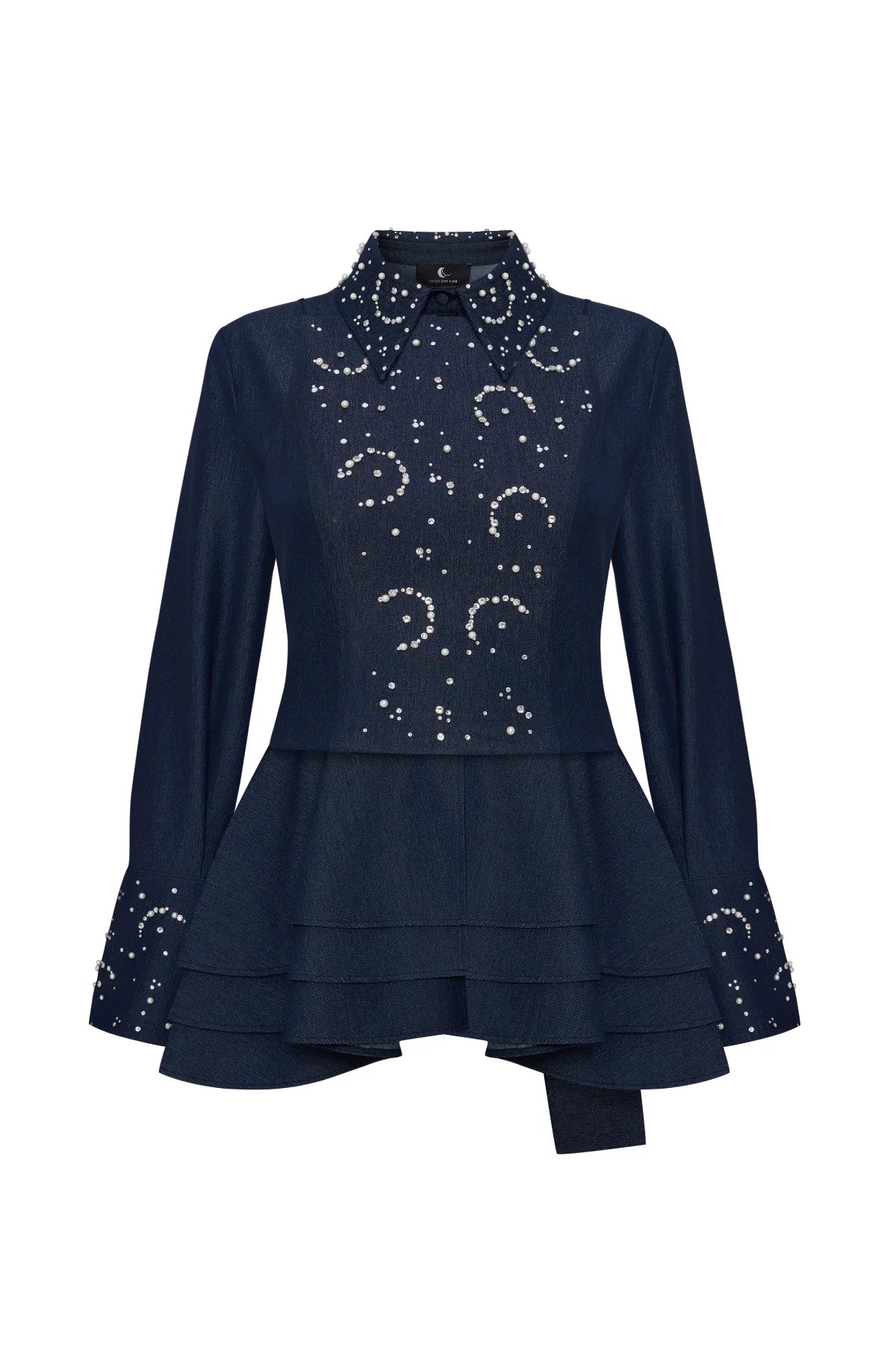 The Northstar Shirt Blouse in Navy is a sophisticated and stylish addition to your wardrobe, designed as part of the Northstar Set. This blouse features beautifully crafted design stone embellishments on the collar and cuffs, adding a touch of glamour to its classic shirt style. The front features a button-down closure with matching fabric-covered buttons made from high-quality denim, giving it a sleek and seamless finish. The three-tiered ruffled hem adds a feminine flair, making it a standout piece for both formal and casual occasions.