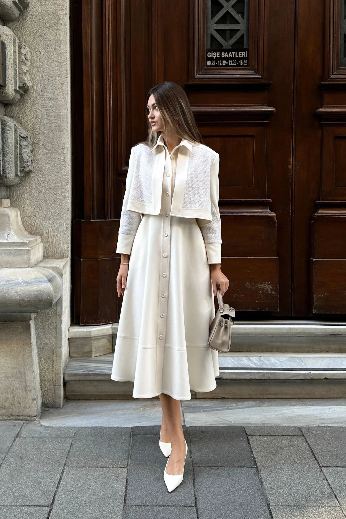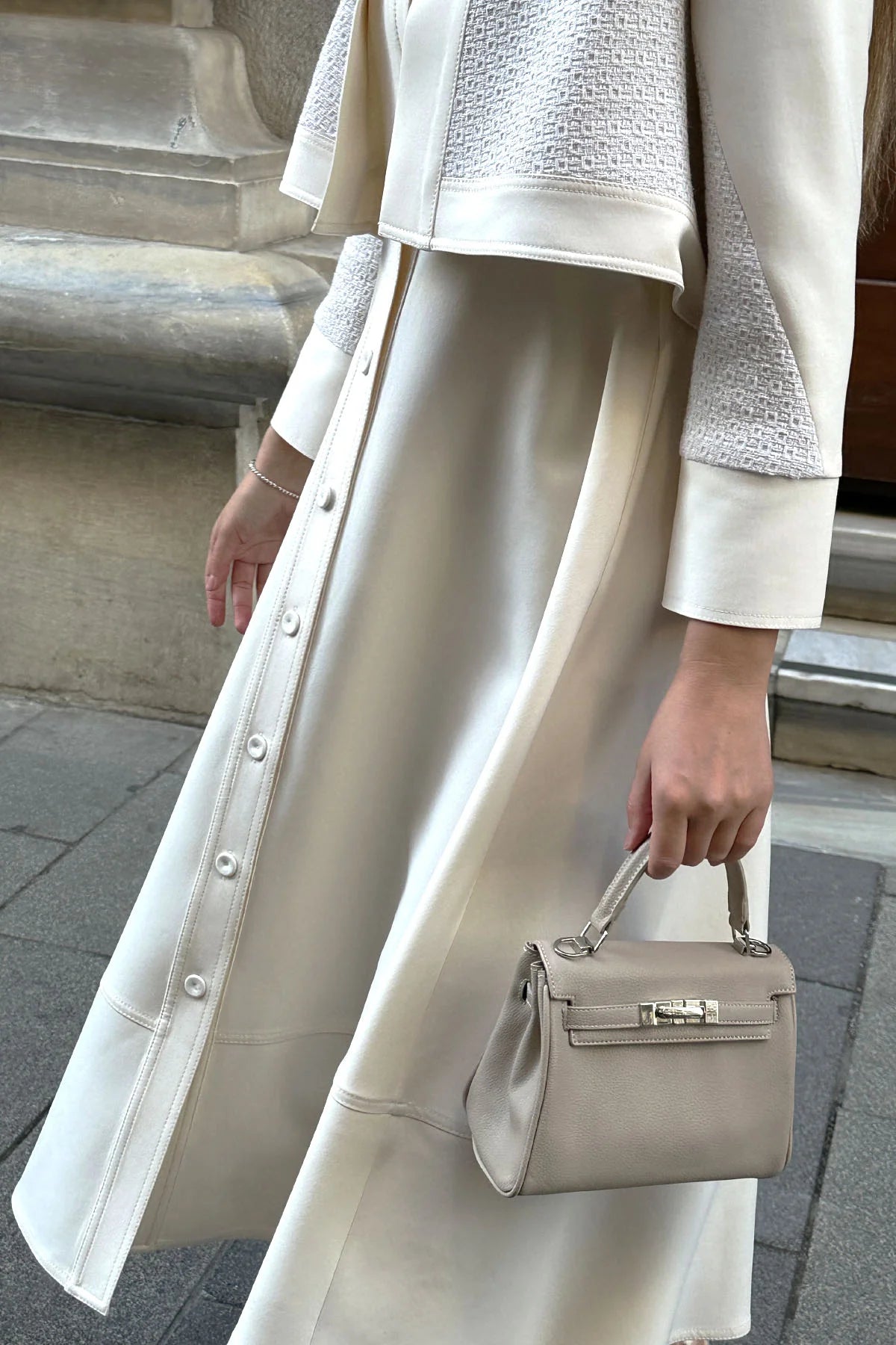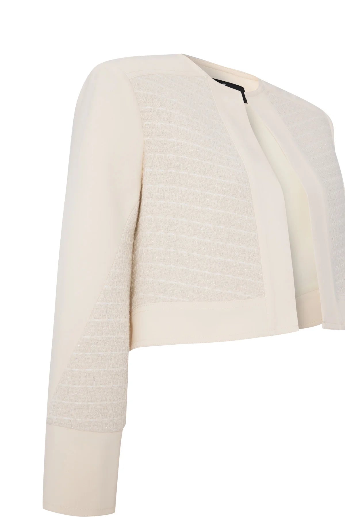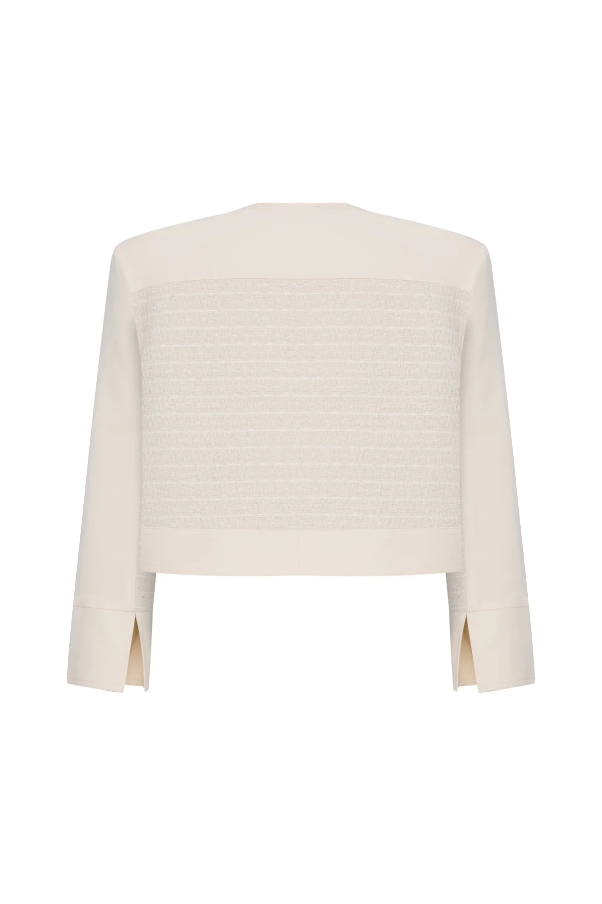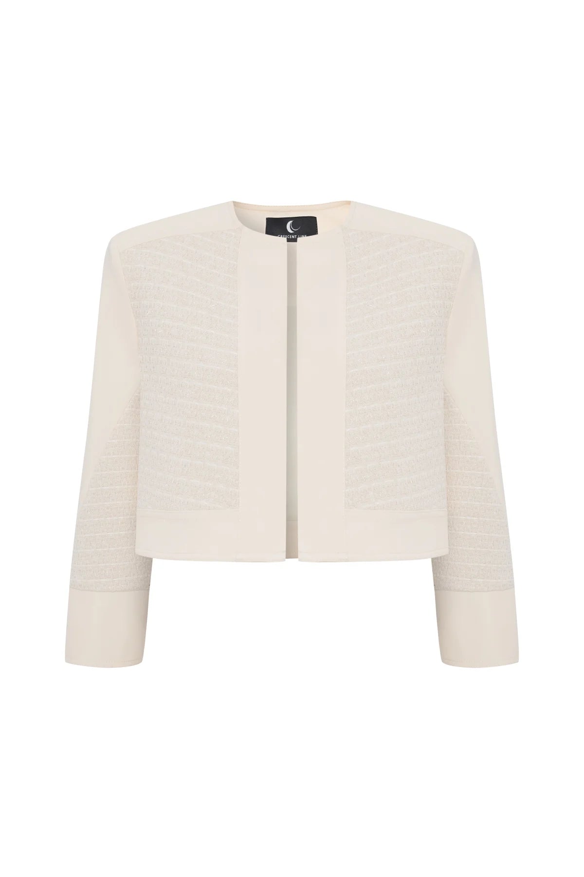 Elevate your wardrobe with the Wintry Tweed Crop Jacket in Cream — a timeless piece blending classic textures with a modern silhouette. Crafted from a luxurious mix of tweed and suiting fabrics, this jacket features a cropped cut, structured shoulders with padding, and elegant seam detailing for a refined finish. The front hook-and-eye closure and clean, collarless design enhance its minimal yet sophisticated style. Fully lined for comfort and durability, this jacket is perfect for year-round wear, from office chic to casual elegance.