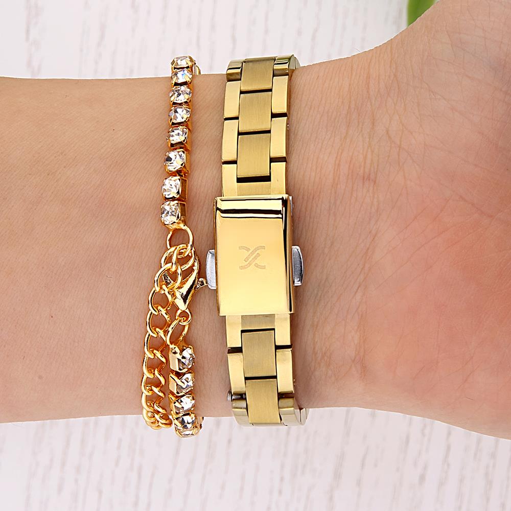 Kasa Çapı: 23 mm - Kasa Şekli: Kare - Kasa Materyali: Metal - Kasa Rengi: Altın Rengi - Kordon Materyali: Çelik - Kordon Rengi: Altın Rengi- Kadran Rengi: Gümüş Tonu - Kadran Işığı: Yok - Taş: Yok - Çalışma Şekli: Analog - Teknolojisi: Quartz - Takvim: Yok - Kronometre: Yok - Alarm: Yok - Cam Özelliği: Mineral - Özellik: Bileklik Hediyeli - Su Geçirmezlik: 3 ATM - Garanti Süresi: 2 YIL - Cinsiyet: Kadın