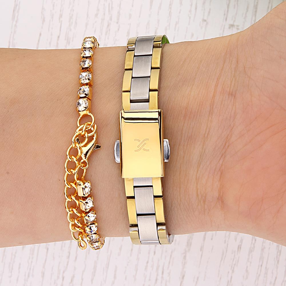 Kasa Çapı: 23 mm - Kasa Şekli: Kare - Kasa Materyali: Metal - Kasa Rengi: Altın Rengi - Kordon Materyali: Çelik - Kordon Rengi: Metalik Gri/Altın Rengi- Kadran Rengi: Gümüş Tonu - Kadran Işığı: Yok - Taş: Yok - Çalışma Şekli: Analog - Teknolojisi: Quartz - Takvim: Yok - Kronometre: Yok - Alarm: Yok - Cam Özelliği: Mineral - Özellik: Bileklik Hediyeli - Su Geçirmezlik: 3 ATM - Garanti Süresi: 2 YIL - Cinsiyet: Kadın