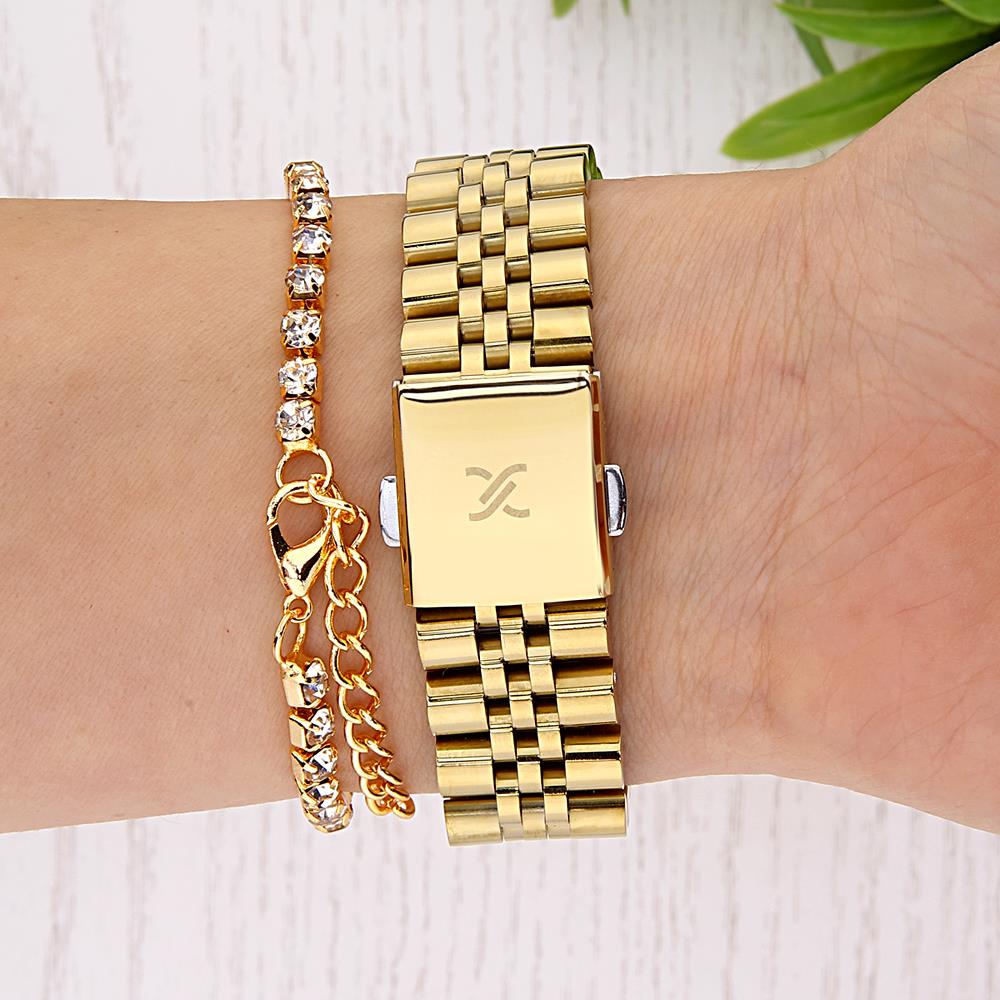 Kasa Çapı: 27 mm - Kasa Şekli: Dikdörtgen - Kasa Materyali: Metal - Kasa Rengi: Altın Rengi - Kordon Materyali: Çelik - Kordon Rengi: Altın Rengi- Kadran Rengi: Gümüş Tonu - Kadran Işığı: Yok - Taş: Var - Çalışma Şekli: Analog - Teknolojisi: Quartz - Takvim: Yok - Kronometre: Yok - Alarm: Yok - Cam Özelliği: Mineral - Özellik: Bileklik Hediyeli - Su Geçirmezlik: 3 ATM - Garanti Süresi: 2 YIL - Cinsiyet: Kadın