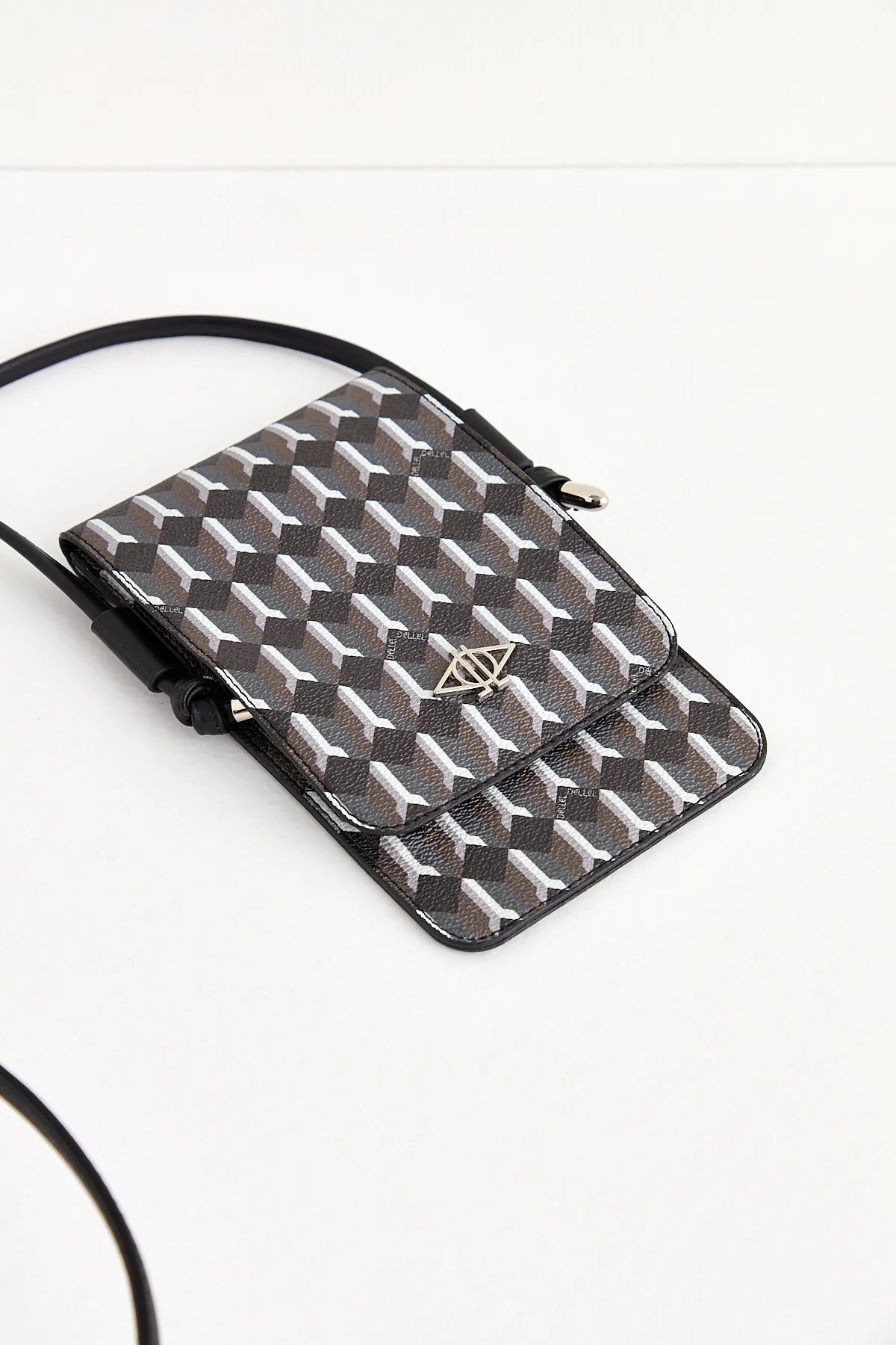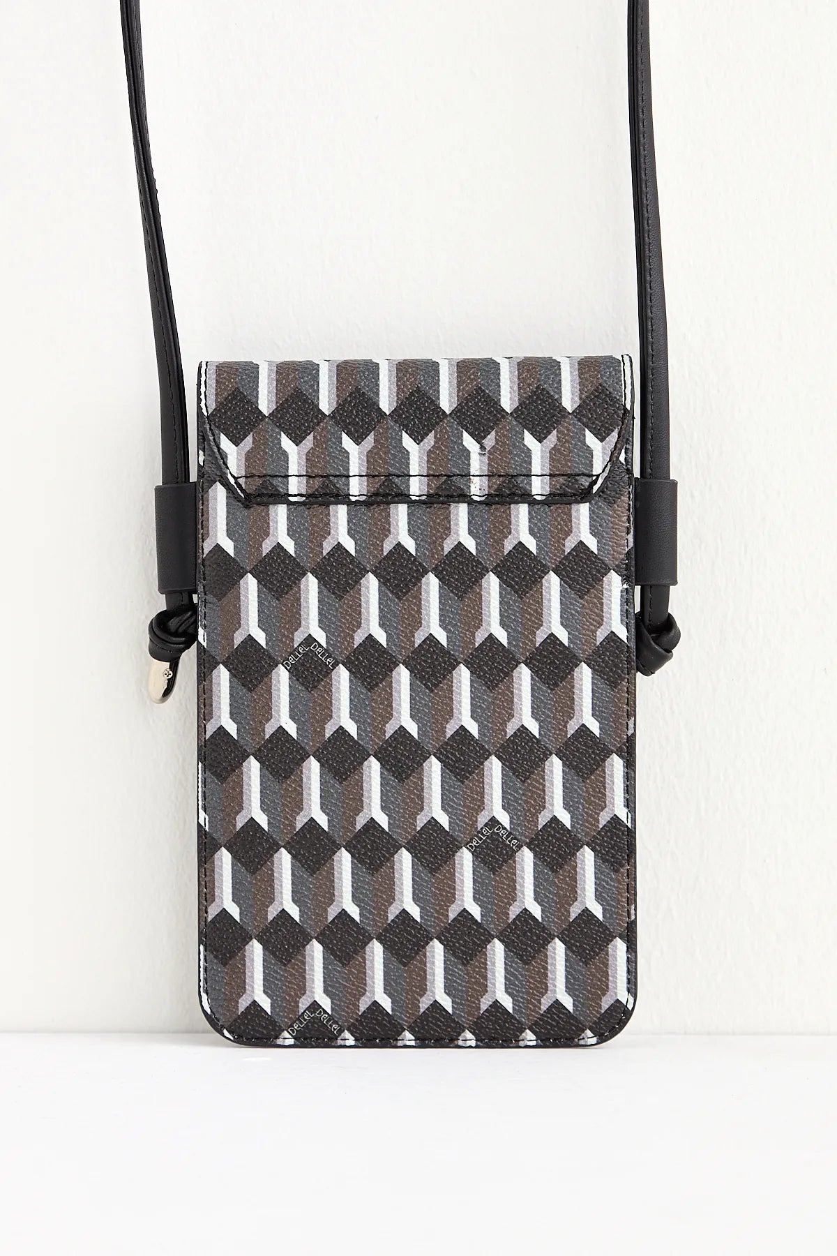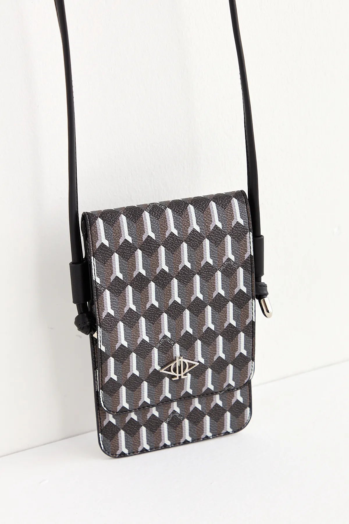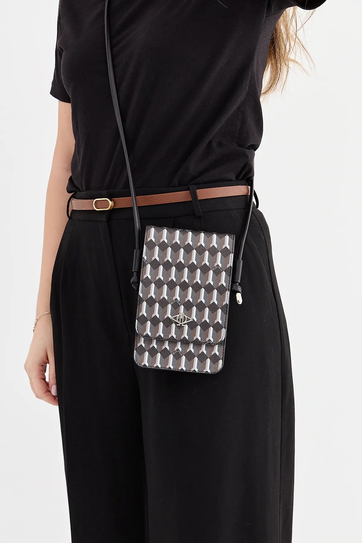It features an adjustable shoulder strap and a metal snap closure. The bag has a single compartment. The front includes a three-slot cardholder and a zippered pocket.