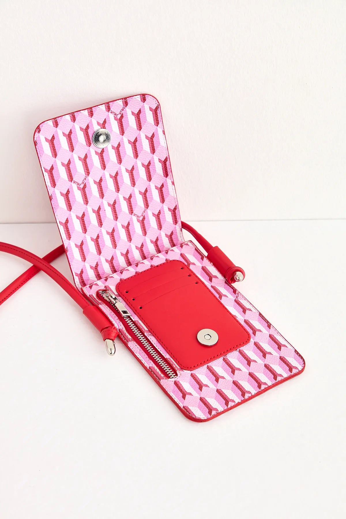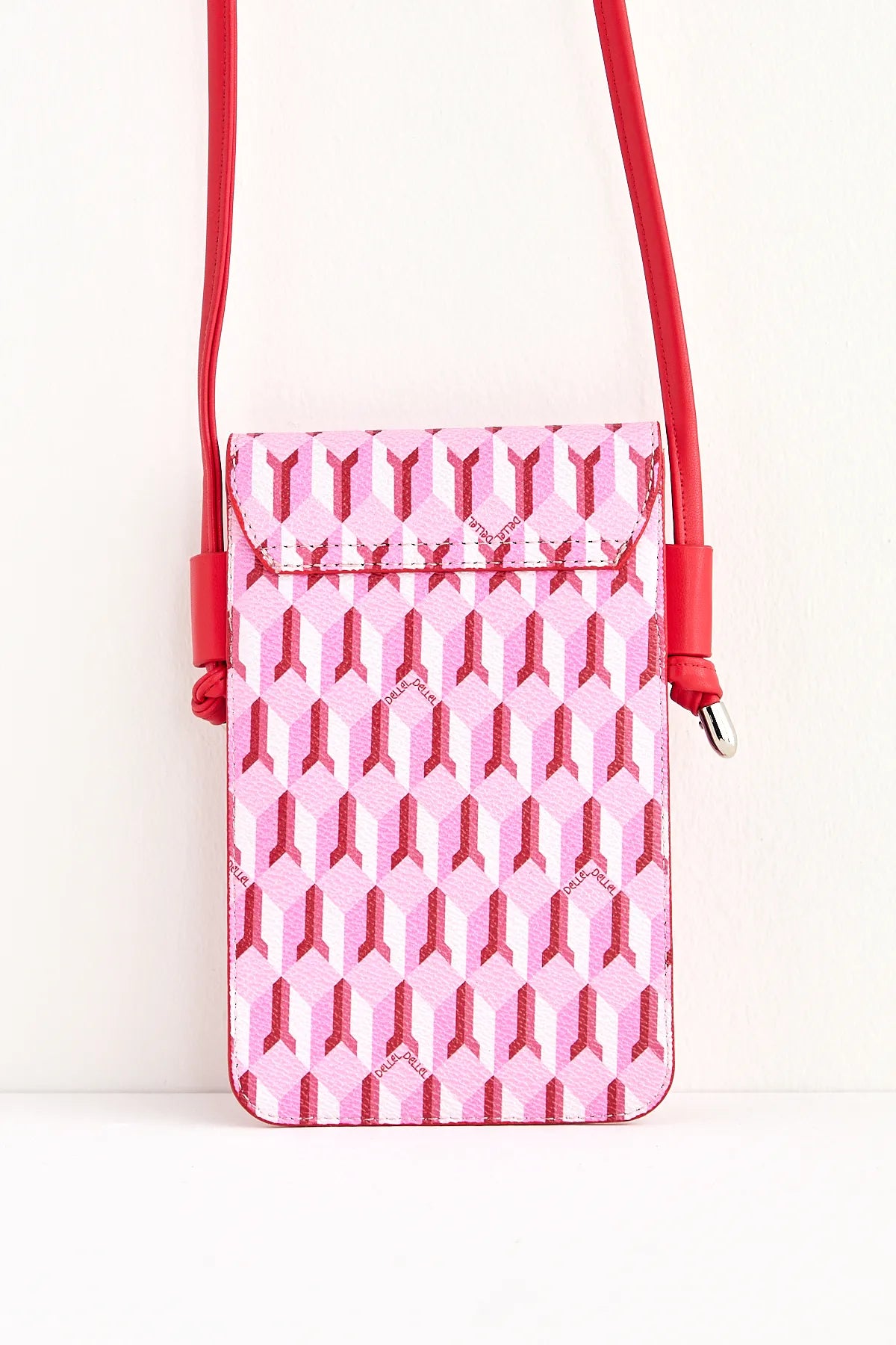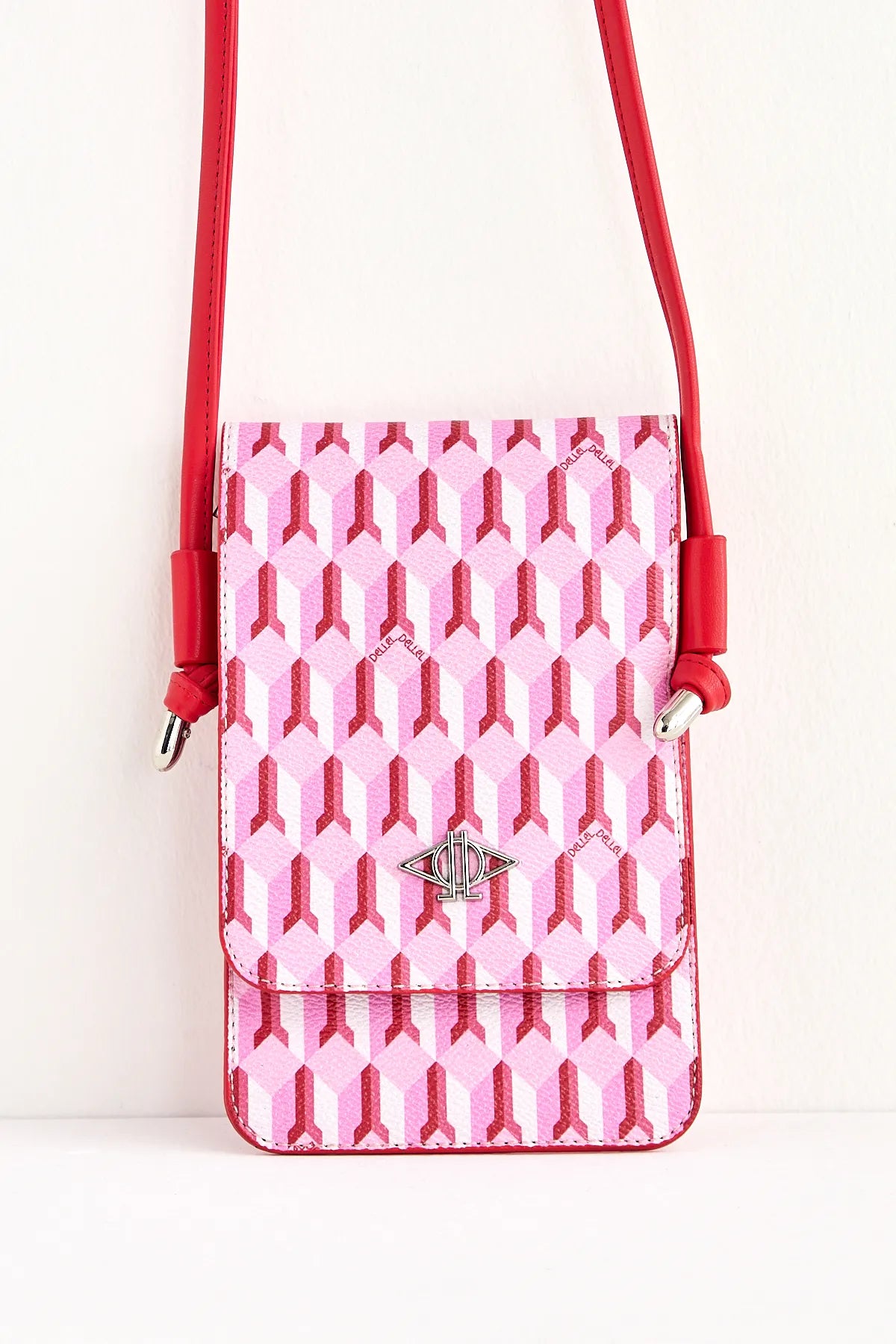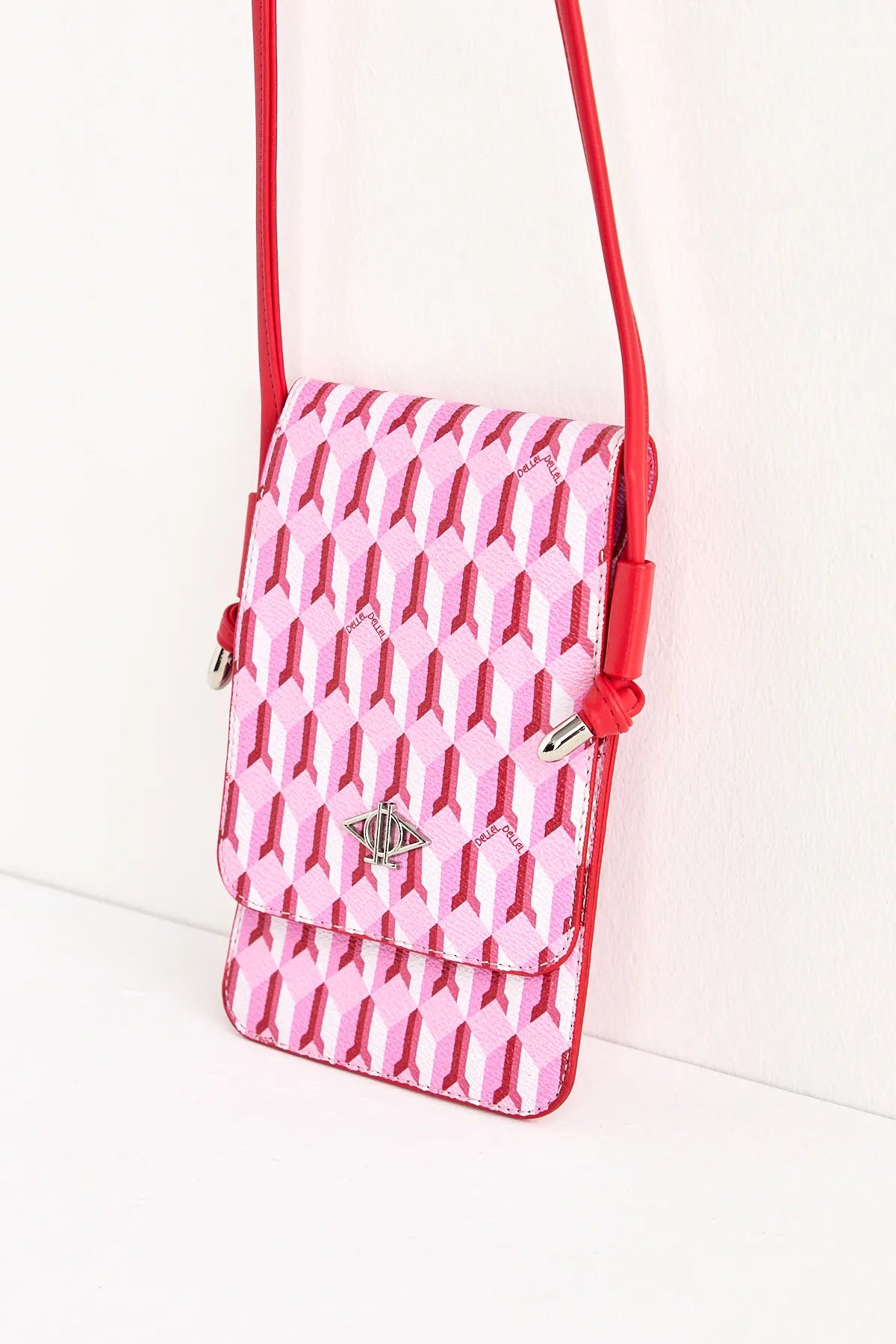 It features an adjustable shoulder strap and a metal snap closure. The bag has a single compartment. The front includes a three-slot cardholder and a zippered pocket.