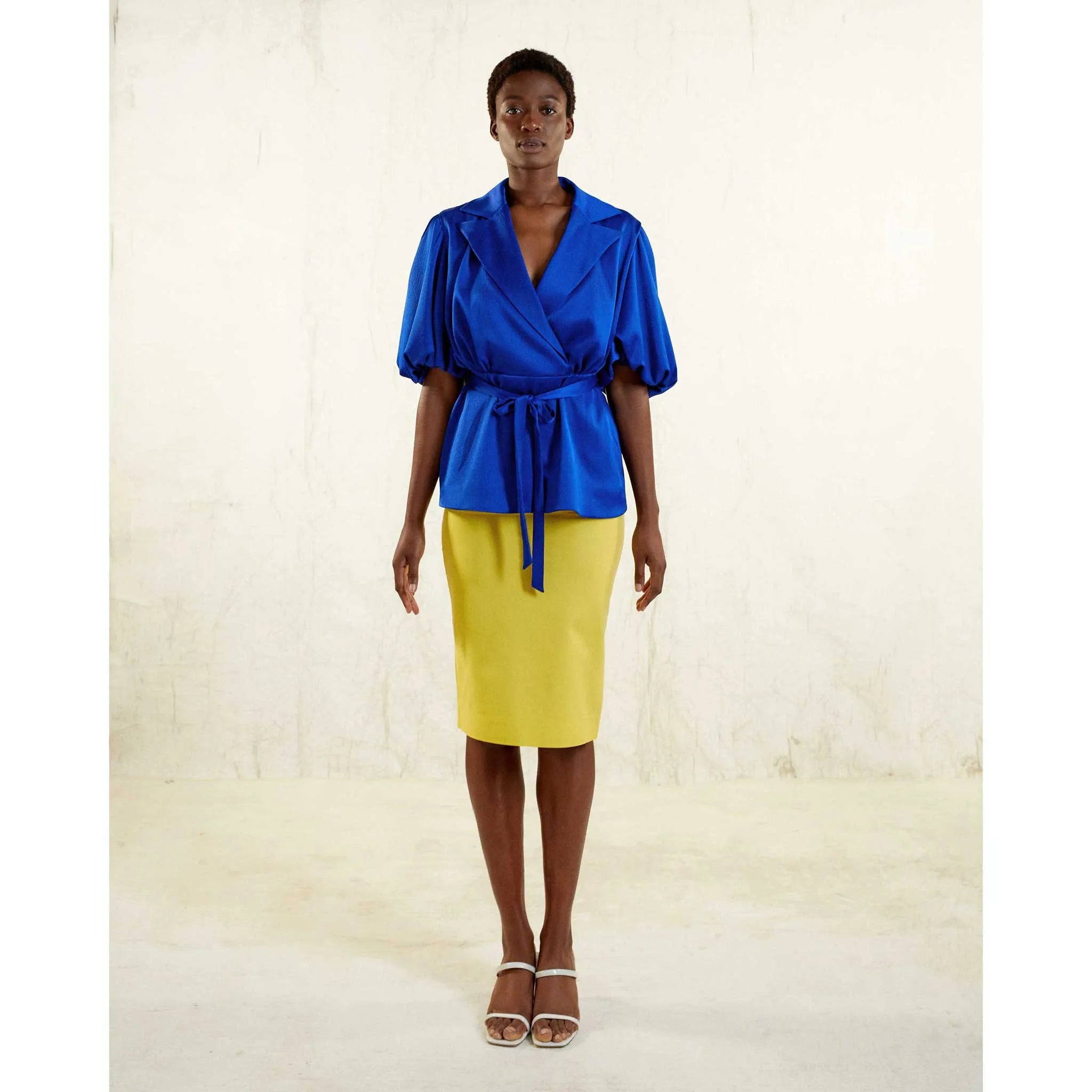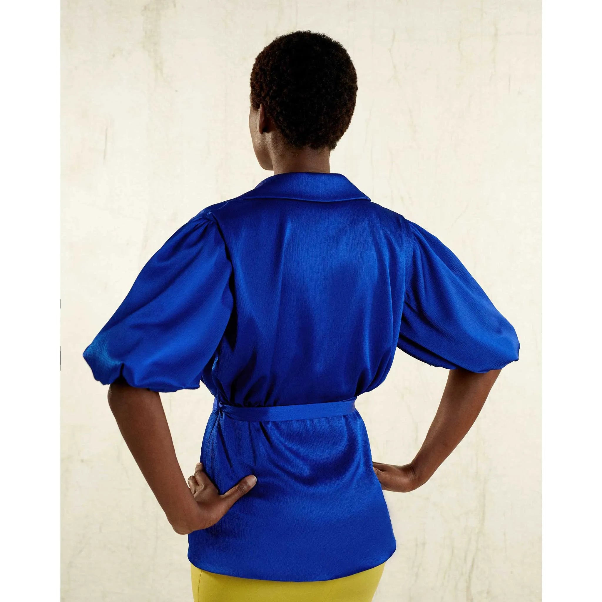 Shaped with dramatic puff sleeves, this tailored satin blouse in royal blue is all you need to make an ultra-sophisticated statement. Featuring a wide notched lapel, side zip fastening, dropped shoulders, a tie waist, peplum hem and relaxed fit.