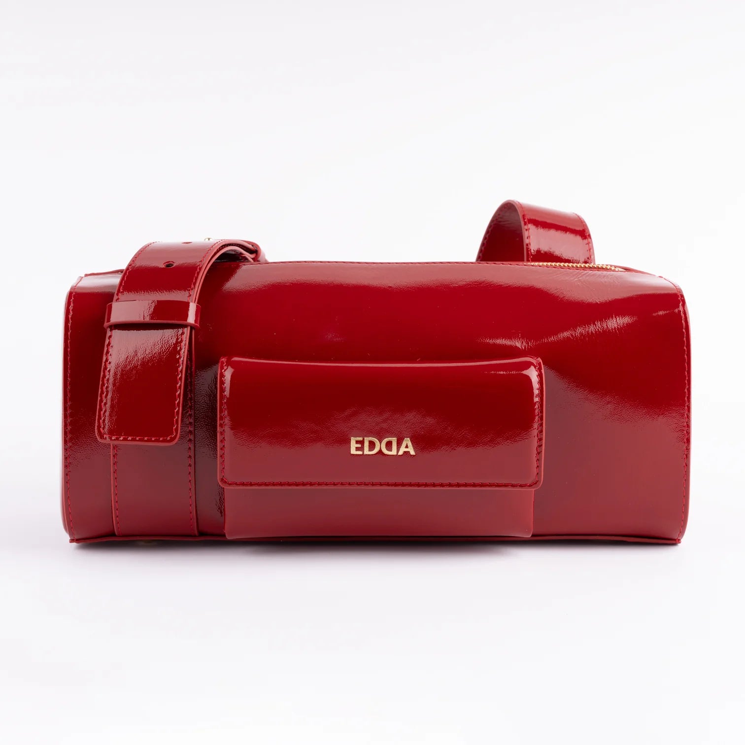 Square prism bag in red vinyl leather with zipper closure and adjustable shoulder strap. One side pocket with magnetic closure and internal pocket with zip. Red stitching and gold logo at front. Internal red velvet lining.