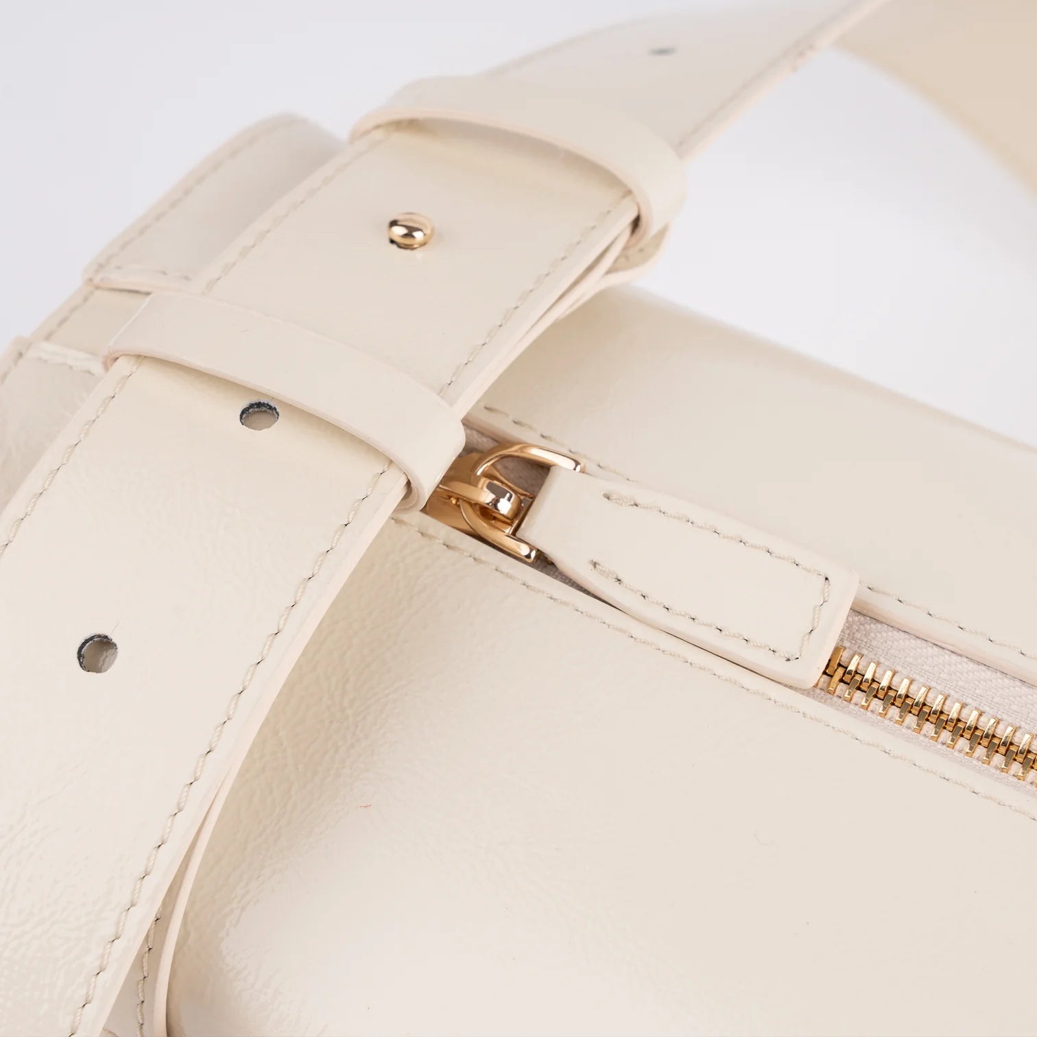 Square prism bag in beige vinyl leather with zipper closure and adjustable shoulder strap. One side pocket with magnetic closure and internal pocket with zip. Beige stitching and gold logo at front. Internal beige velvet lining.