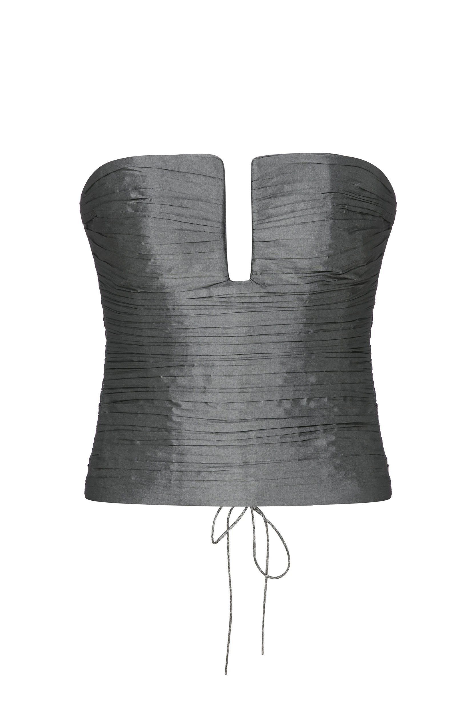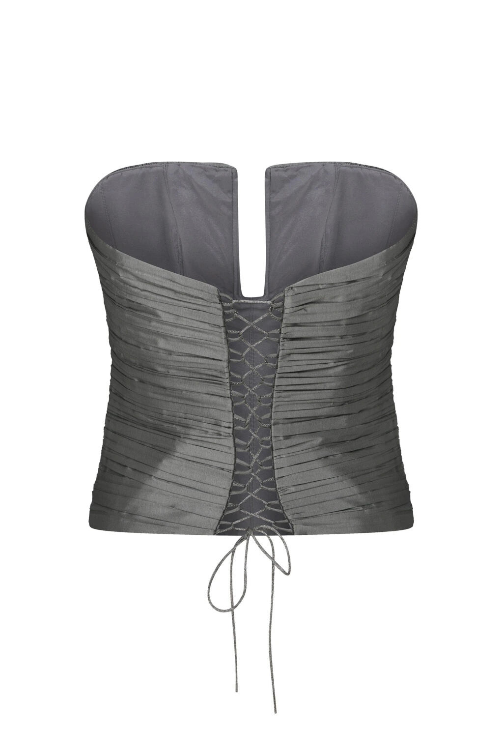 Offering a modern and stylish design, this gray strapless bustier features a U-cut front with subtle horizontal details and an elegant back tie detail.