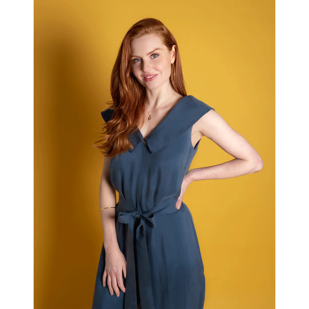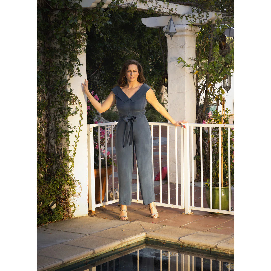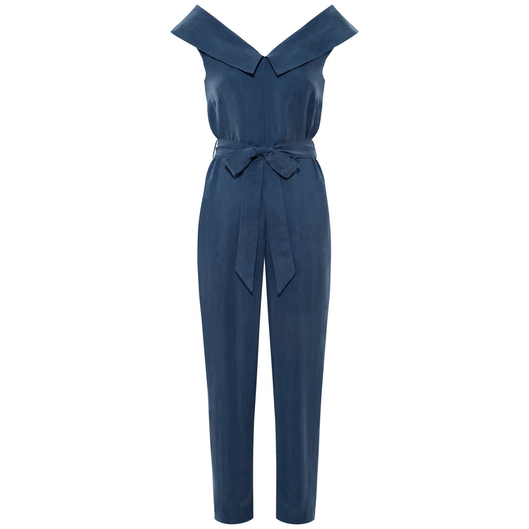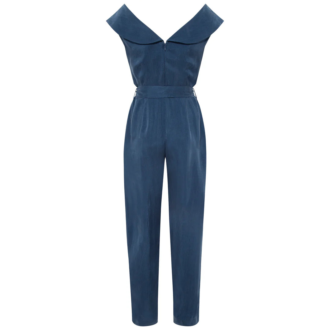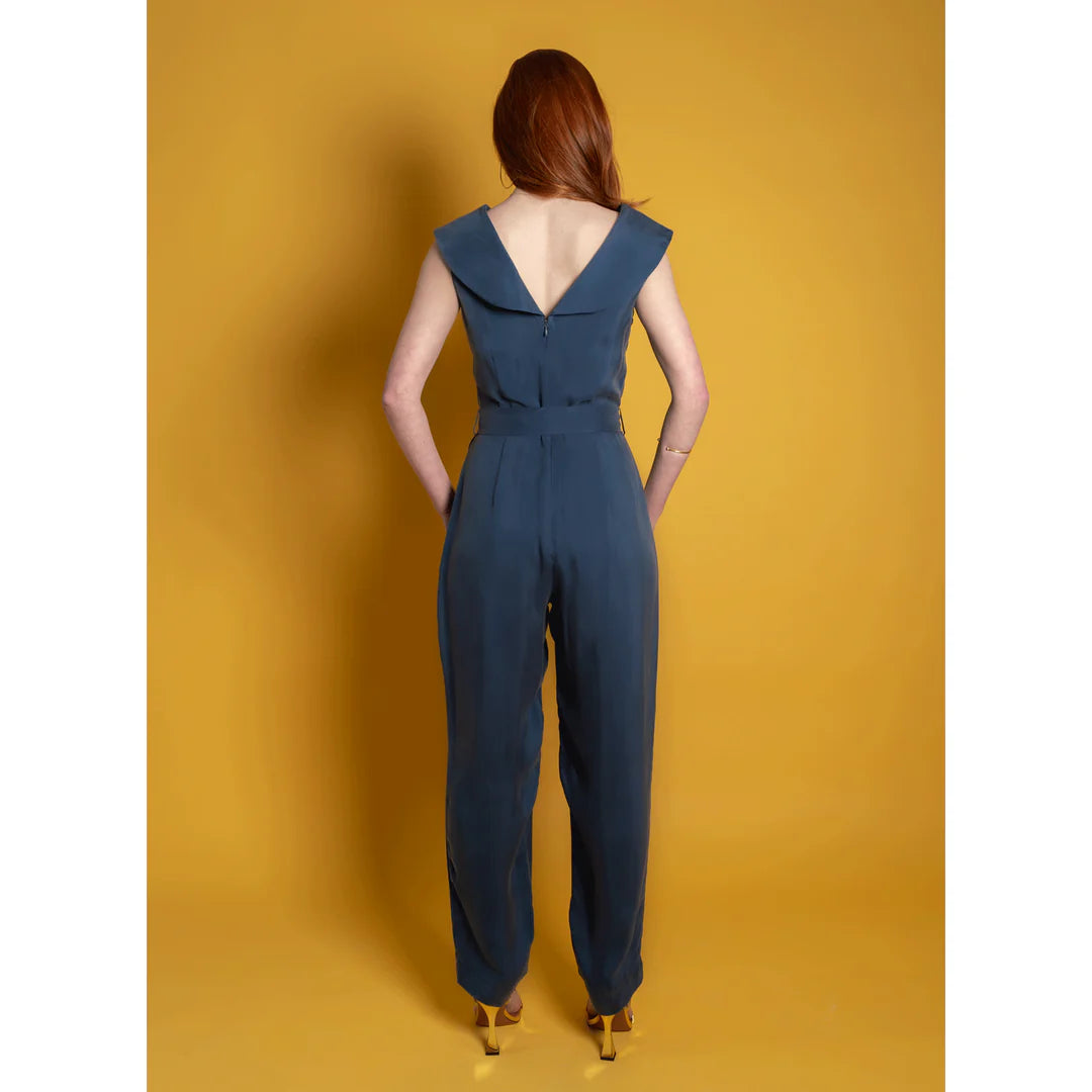 Power dressing has never been easier. Sophisticated, versatile and undeniably comfortable, this tuxedo style jumpsuit will be your most cherished piece in your Spring & Summer wardrobe. Attention to detail is evident, from one side peaked shawl-lapel to the decorative pin tucks on the right side pocket and back left shoulder. Featuring a V-neck, double breasted fabric-covered front fastenings, a flared leg, elasticated back waist, two diagonal pockets and rear welt pockets.
