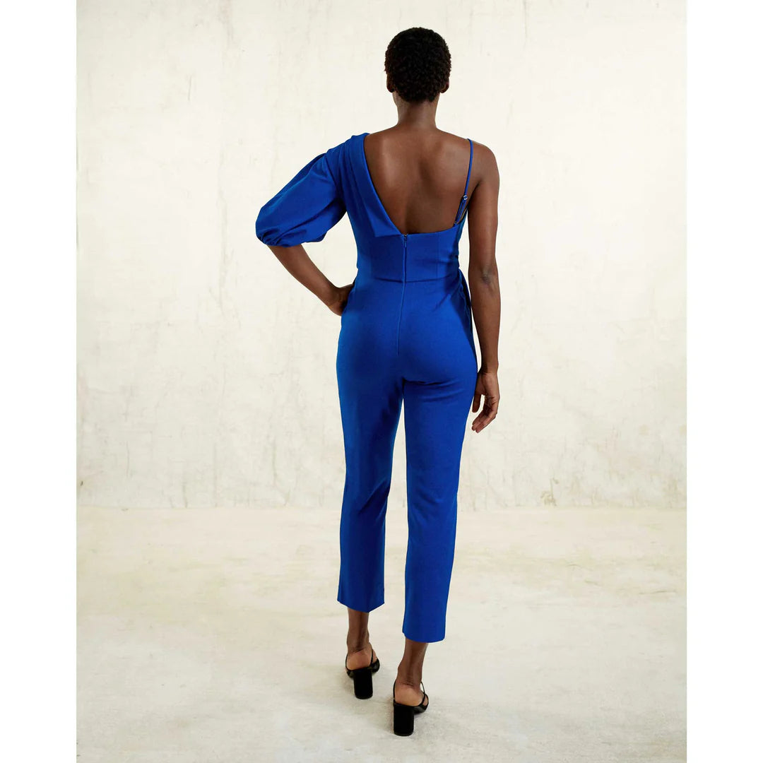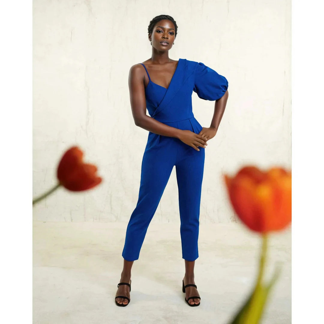 Power dressing has never been easier. Sophisticated, versatile and undeniably comfortable, this tuxedo style jumpsuit will be your most cherished piece in your Spring & Summer wardrobe. Attention to detail is evident, from one side peaked shawl-lapel to the decorative pin tucks on the right side pocket and back left shoulder. Featuring a V-neck, double breasted fabric-covered front fastenings, a flared leg, elasticated back waist, two diagonal pockets and rear welt pockets.