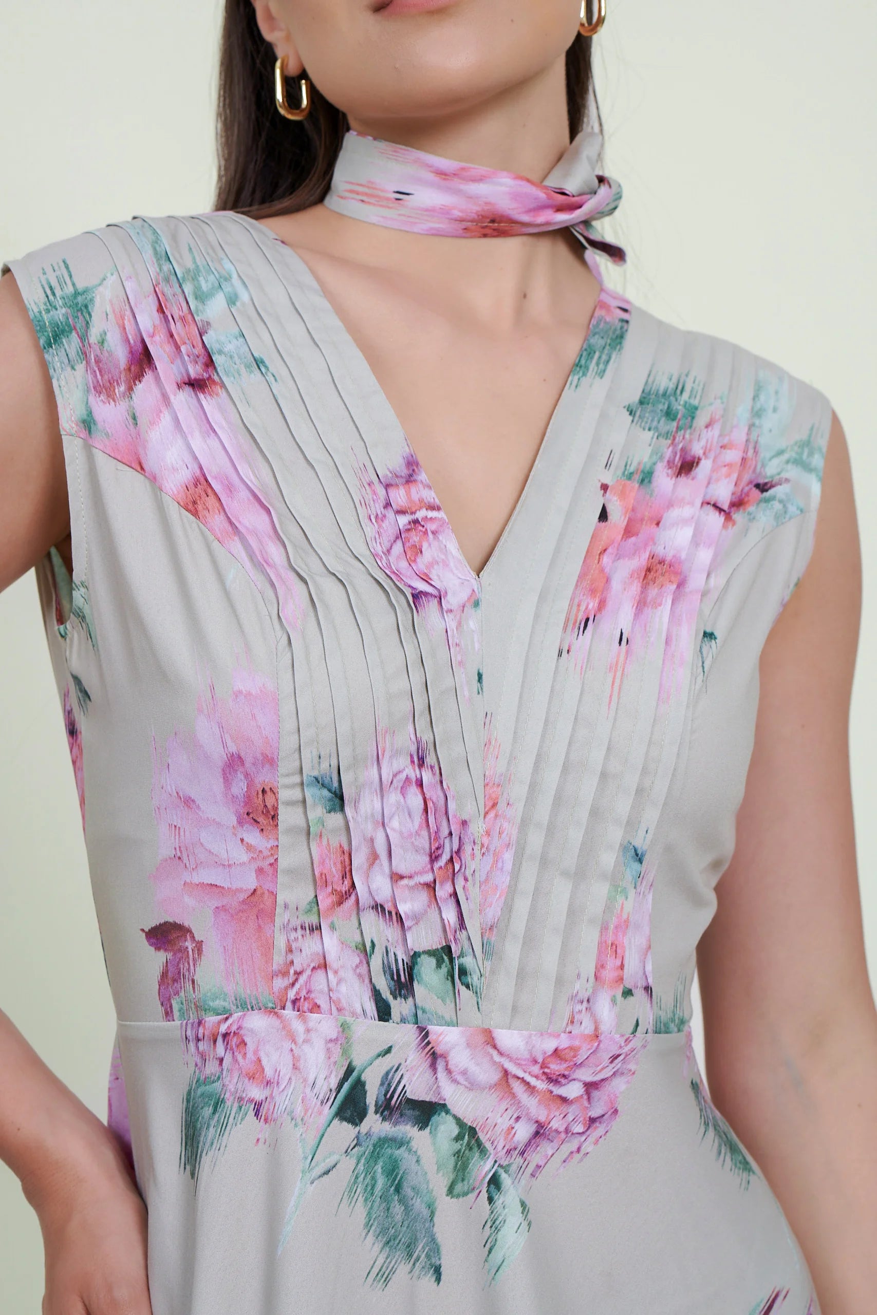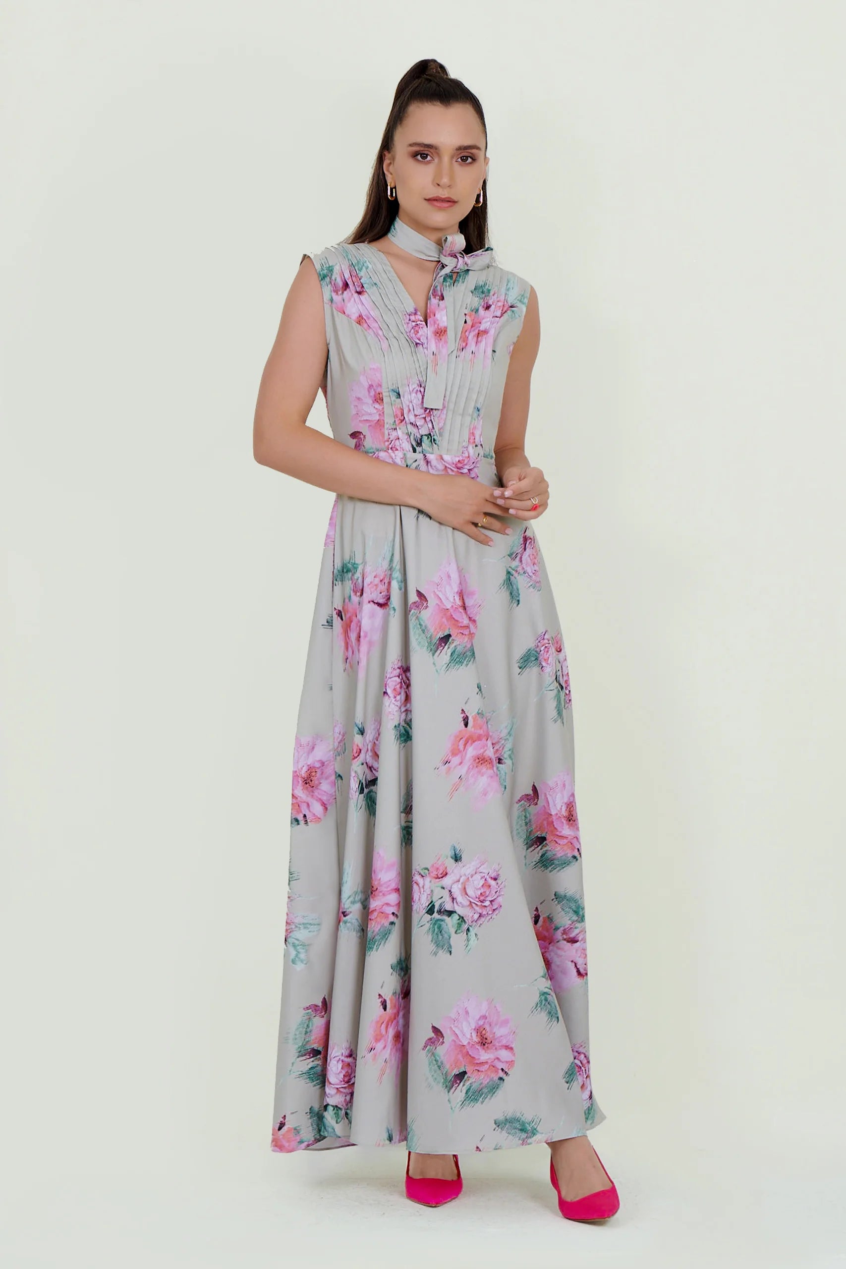 Floral Print V-Neck Maxi Dress with Belt FEDSSM101, a stunning women’s dress designed with intricate red and pink floral details on a powder-colored backdrop. This maxi dress features a flattering V-neckline that adds a touch of sophistication to your look.