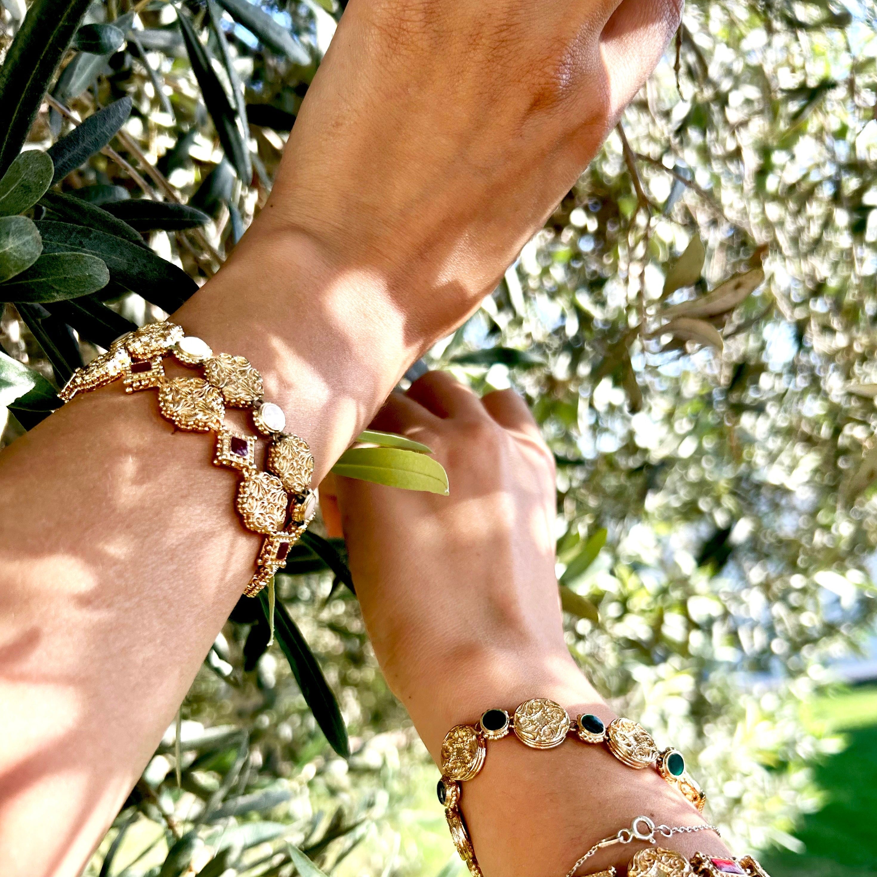 Paying homage to the influential empress, Galla Placidia, known for her grace and patronage of the arts. The Galla Placidia Bracelet features a design inspired by the intricate patterns and motifs of the Byzantine era. Each element is a nod to the empress's refined taste and the opulence of the time.