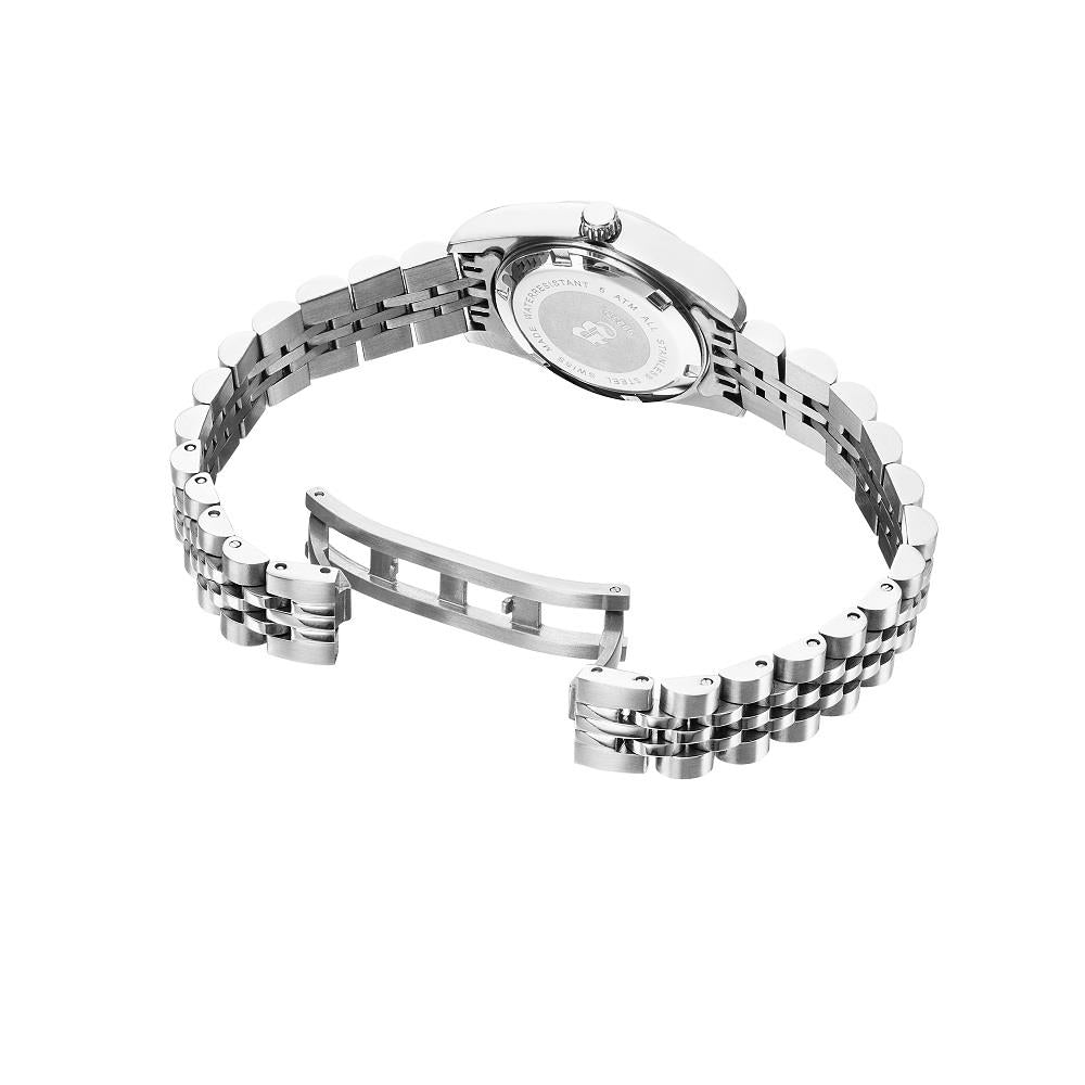 Kasa Çapı: 26 mm - Kasa Şekli: Yuvarlak - Kasa Materyali: Çelik - Kasa Rengi: Metalik Gri - Kordon Materyali: Çelik - Kordon Rengi: Metalik Gri- Kadran Rengi: Gümüş Tonu - Kadran Işığı: Yok - Taş: Var - Çalışma Şekli: Analog - Teknolojisi: Quartz - Takvim: Var - Kronometre: Yok - Alarm: Yok - Cam Özelliği: Mineral - Özellik: Swiss Made - Su Geçirmezlik: 5 ATM - Garanti Süresi: 2 yıl - Cinsiyet: Kadın