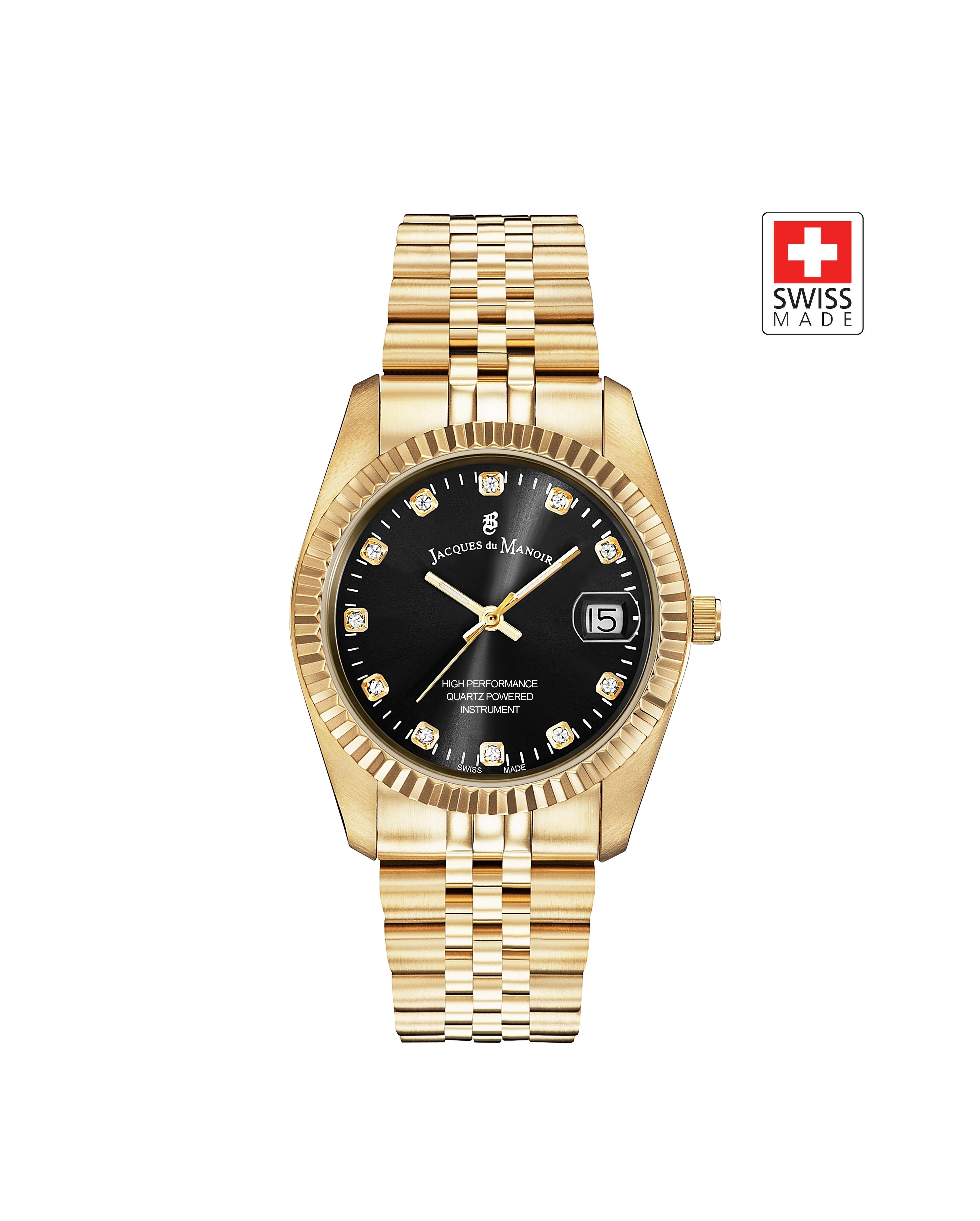 Kasa Çapı: 36 mm - Kasa Şekli: Yuvarlak - Kasa Materyali: Çelik - Kasa Rengi: Altın Rengi - Kordon Materyali: Çelik - Kordon Rengi: Altın Rengi- Kadran Rengi: Siyah - Kadran Işığı: Yok - Taş: Var - Çalışma Şekli: Analog - Teknolojisi: Quartz - Takvim: Var - Kronometre: Yok - Alarm: Yok - Cam Özelliği: Mineral - Özellik: Swiss Made - Su Geçirmezlik: 5 ATM - Garanti Süresi: 2 yıl - Cinsiyet: Kadın