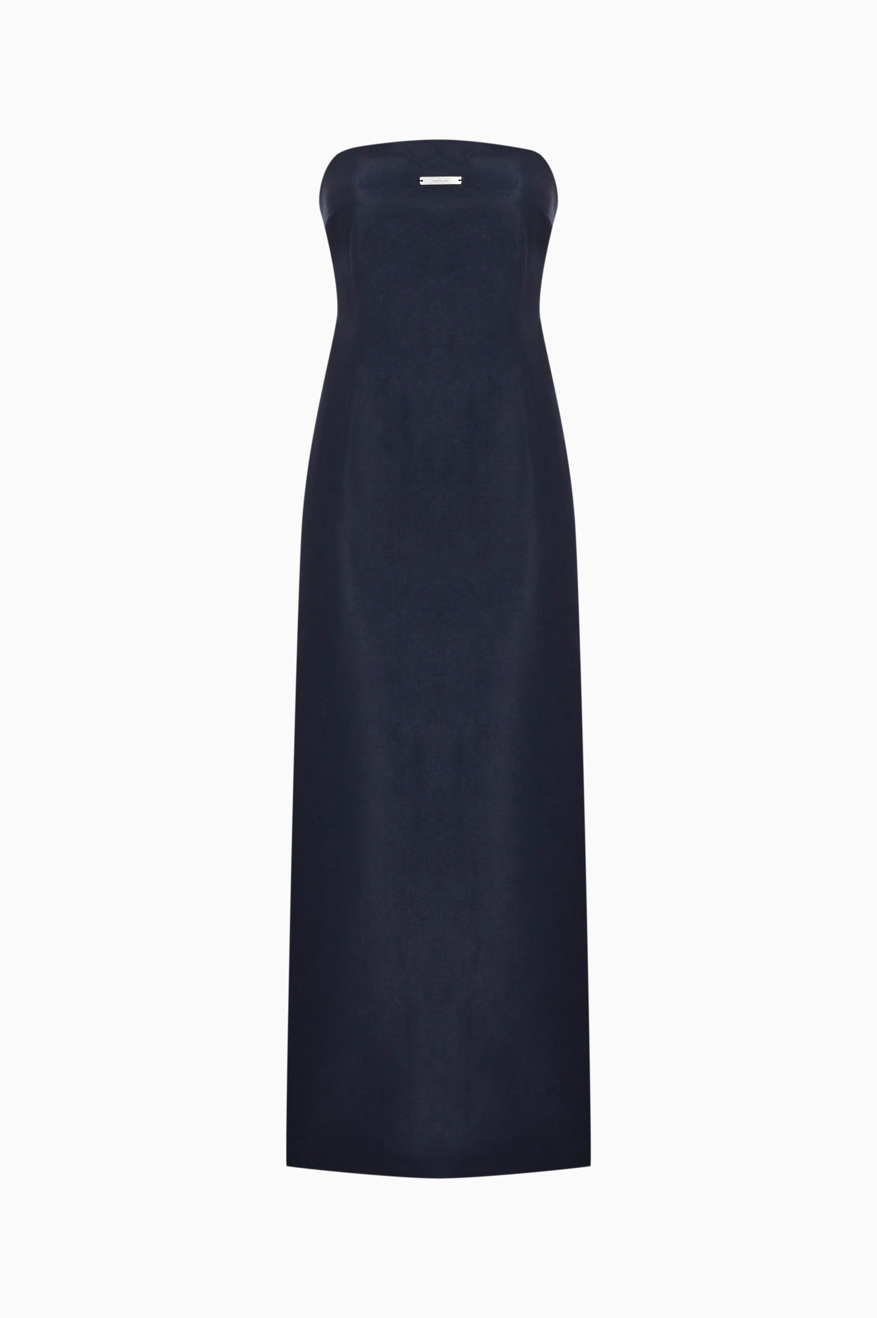 Zipper closure at the back bodice, Strapless, KNTLGY metal plate detail on the front bodice, Navy Blue Denim Dress.