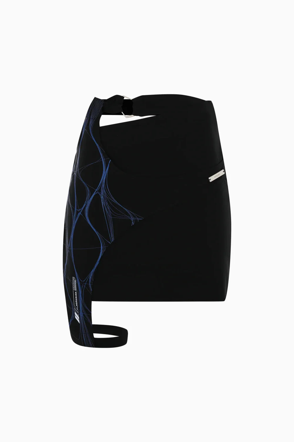 Mini skirt from high-quality bengaline fabric. Hidden zipper on the left. KNTLGY metal accessory on the waistband. Blue Print details on the front. Adjustable leg band on the left side.
