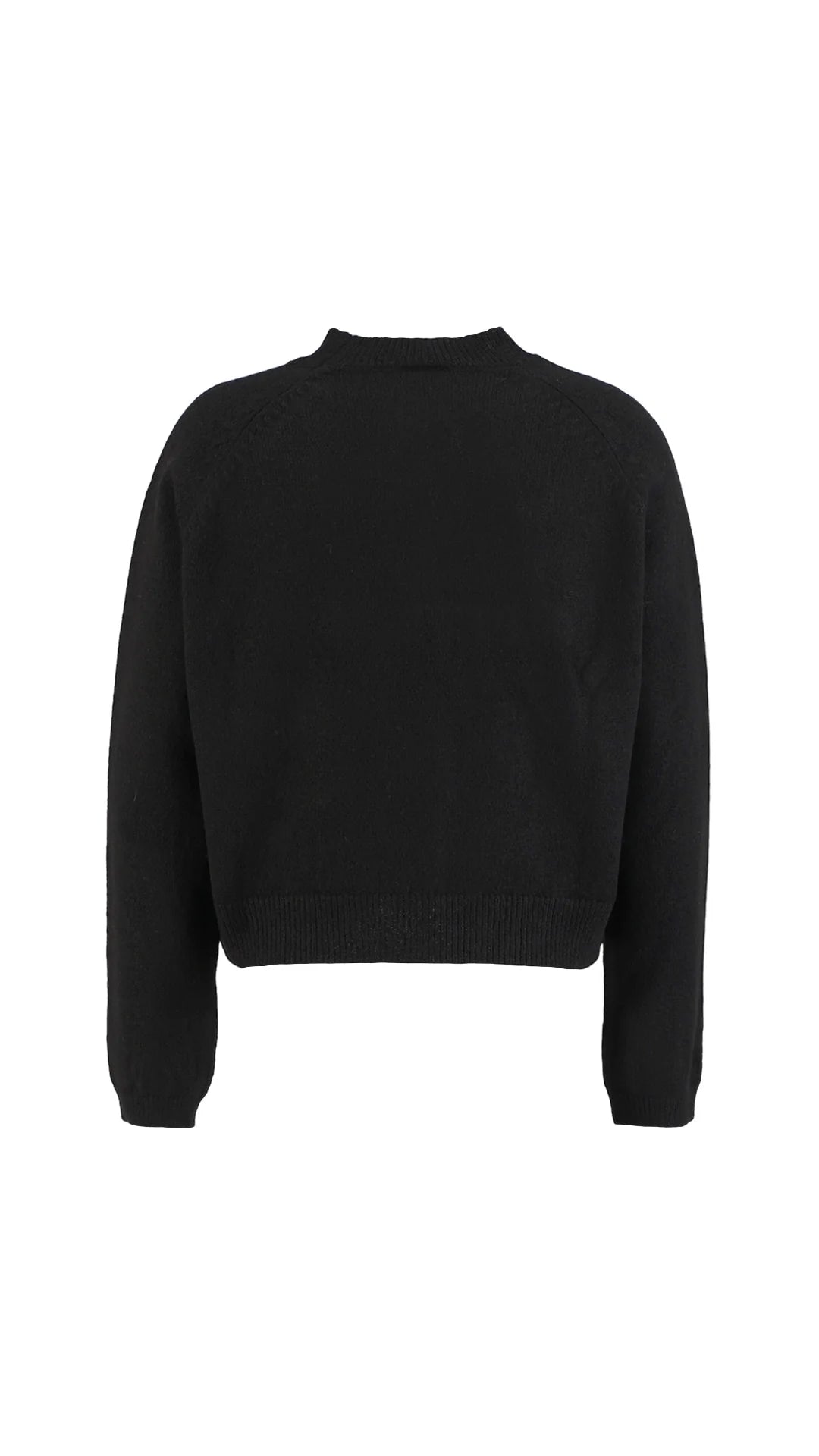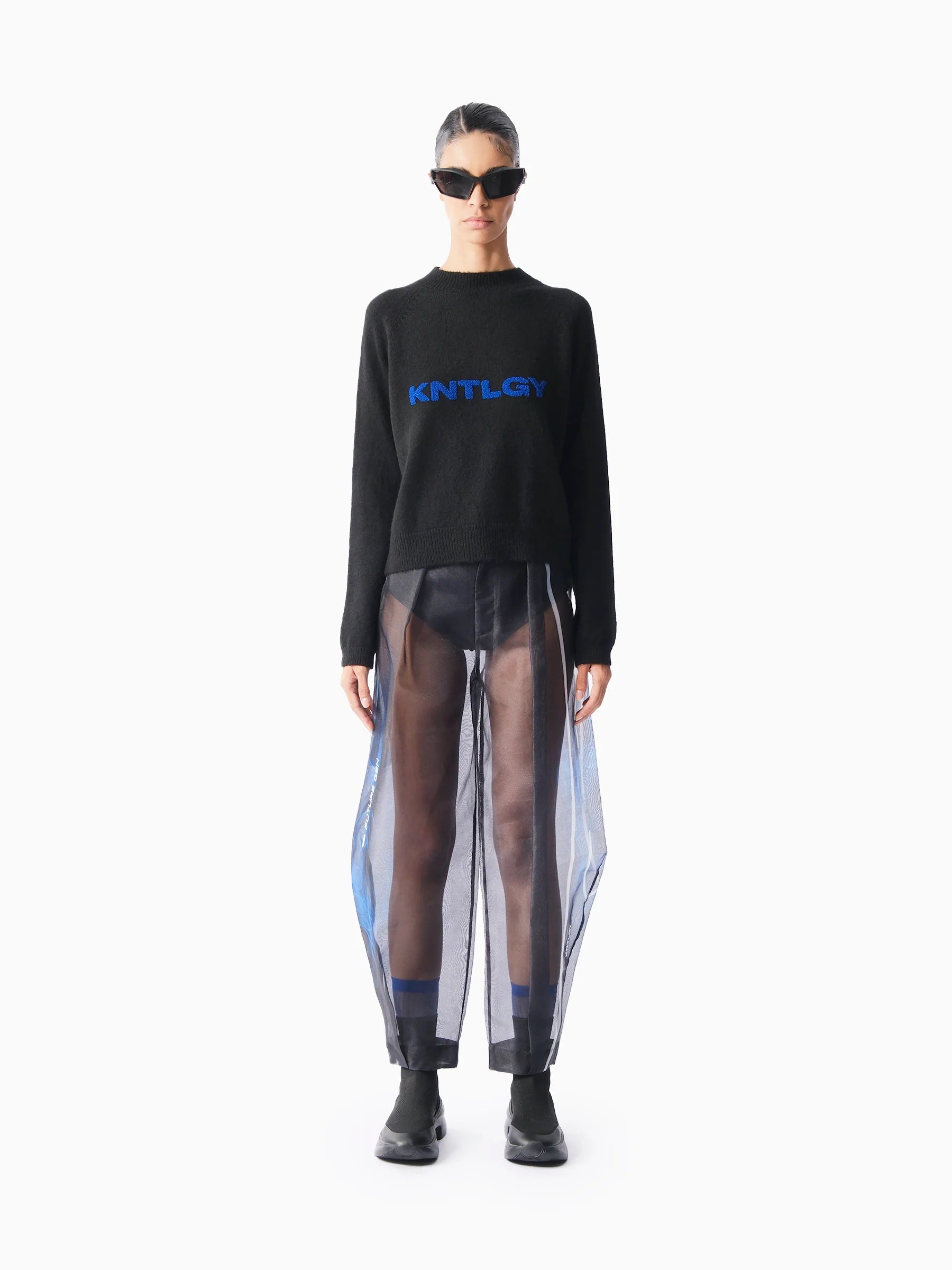 Crew neck, long sleeves, knit sweater with KNTLGY blue logo print on the front.