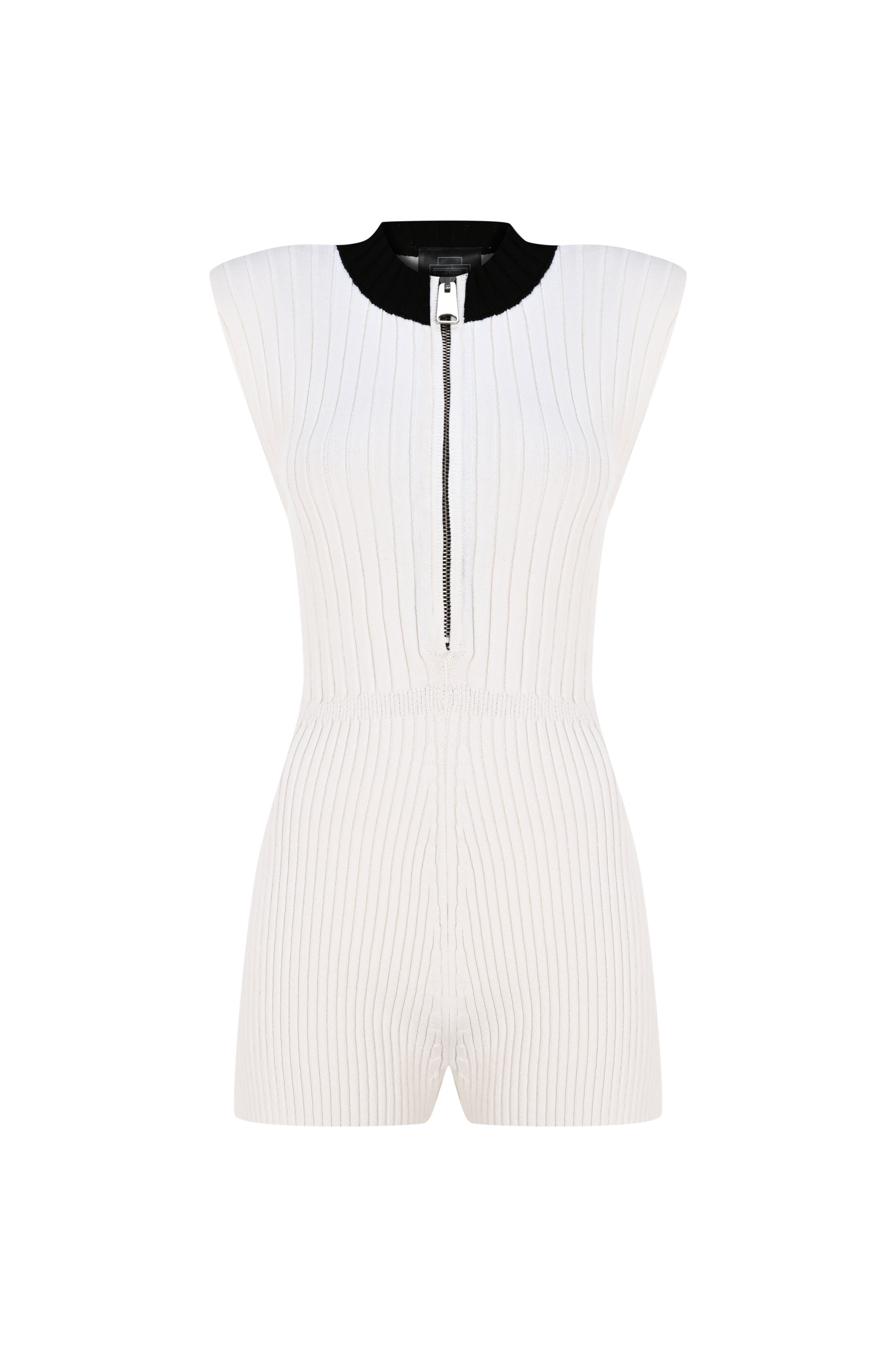 White Ribbed Mini Jumpsuit with Black Collar Detail, Metal Zipper on Front.