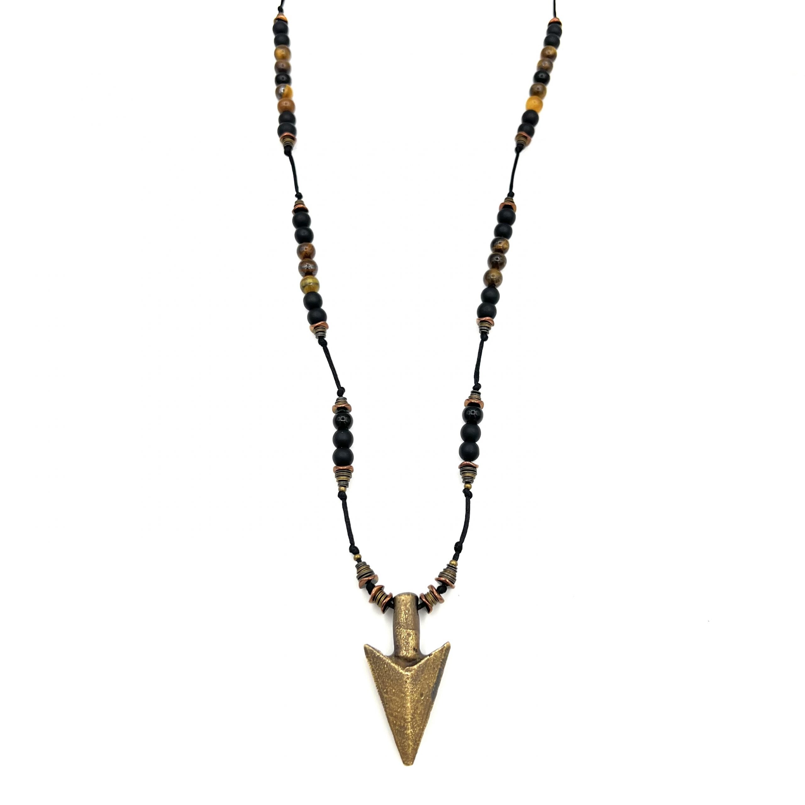 Crafted with an antique arrowhead, tiger eye, hematite, onyx, steel disc, and 925 silver.