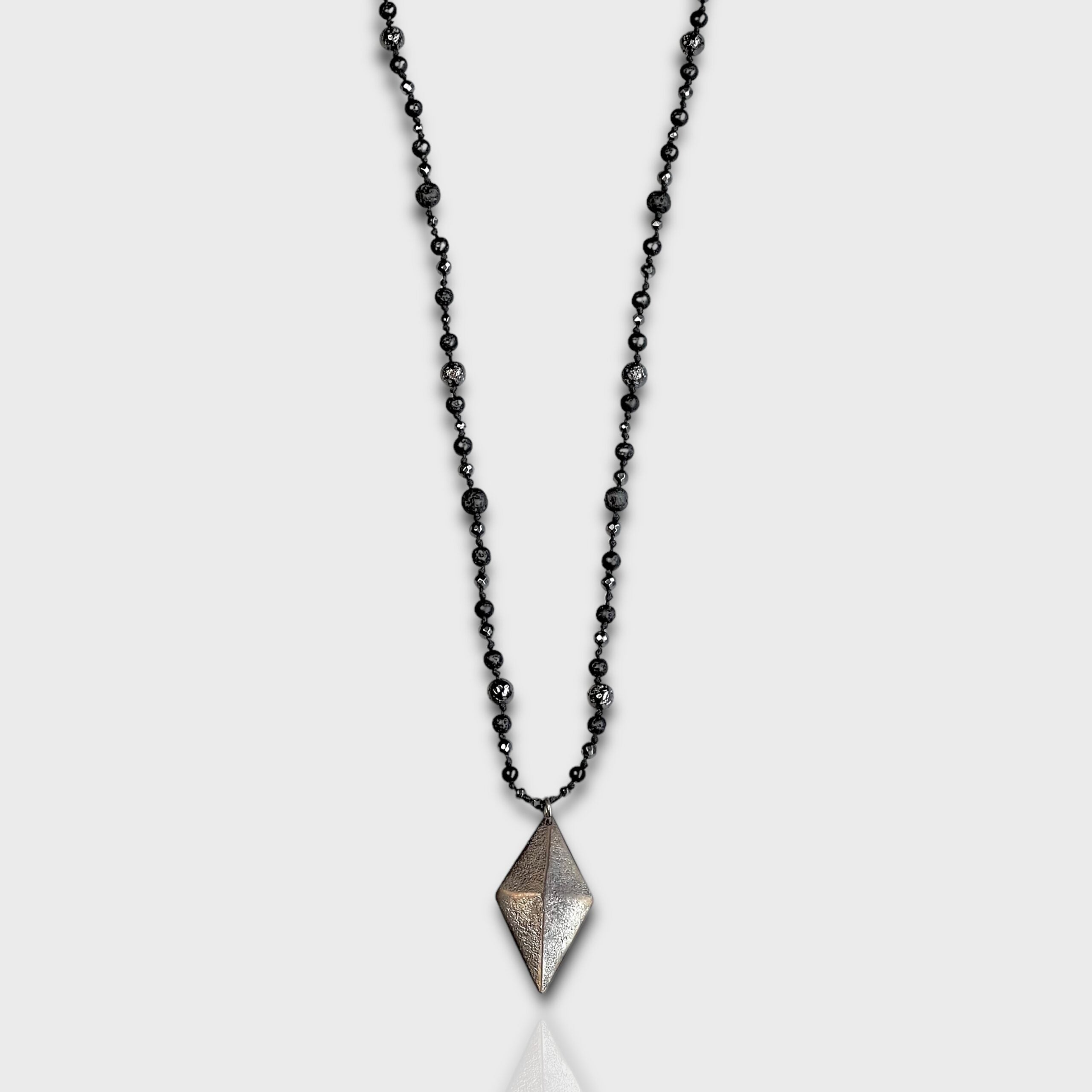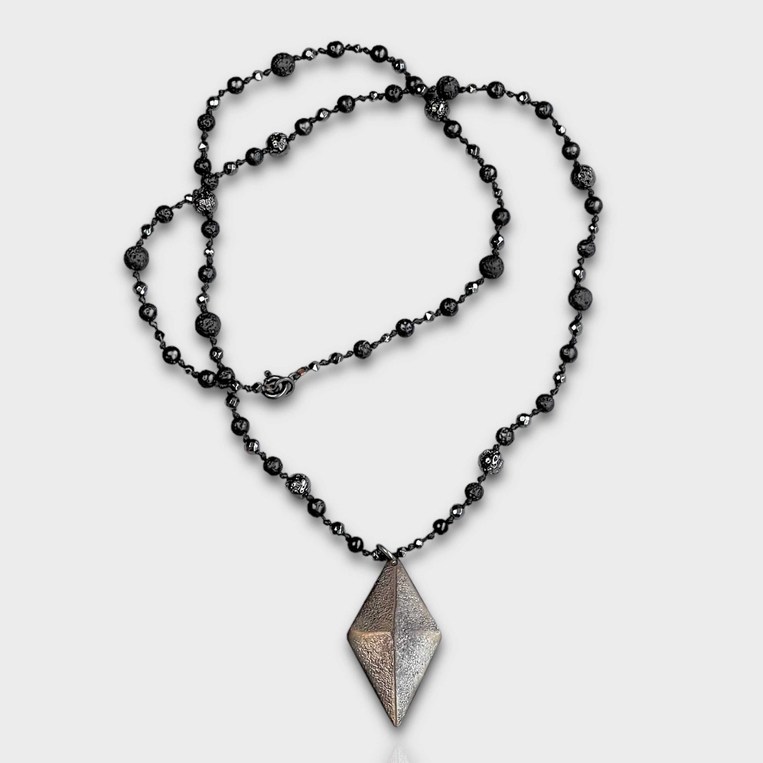 Designed using hematite, onyx, lava stone, oxidized antique bronze cast pendant, and silver.
