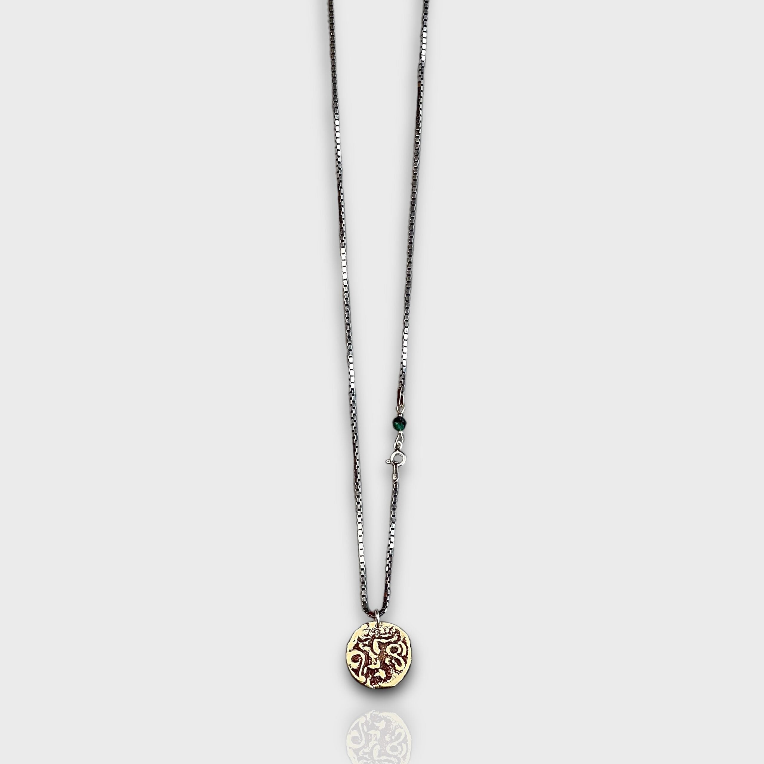 This piece is designed with a bronze Roman coin, sunstone, and silver.