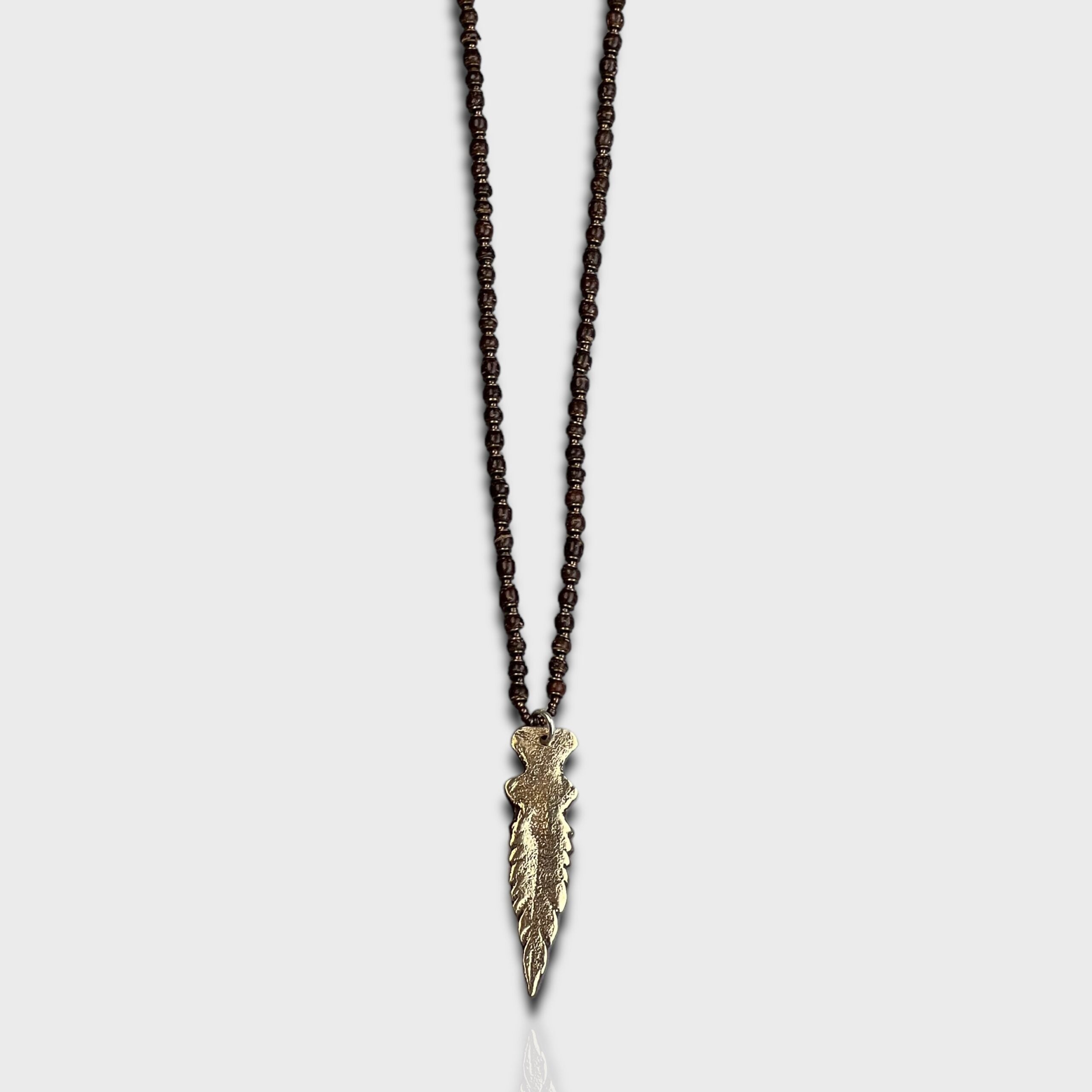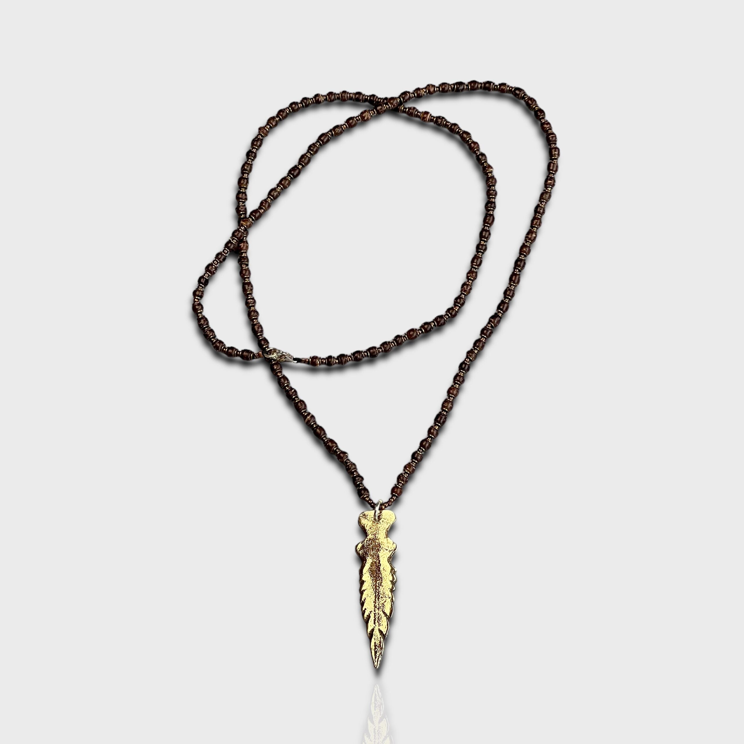 Designed using sandalwood, silver, bronze cast bird feather, and silver.
