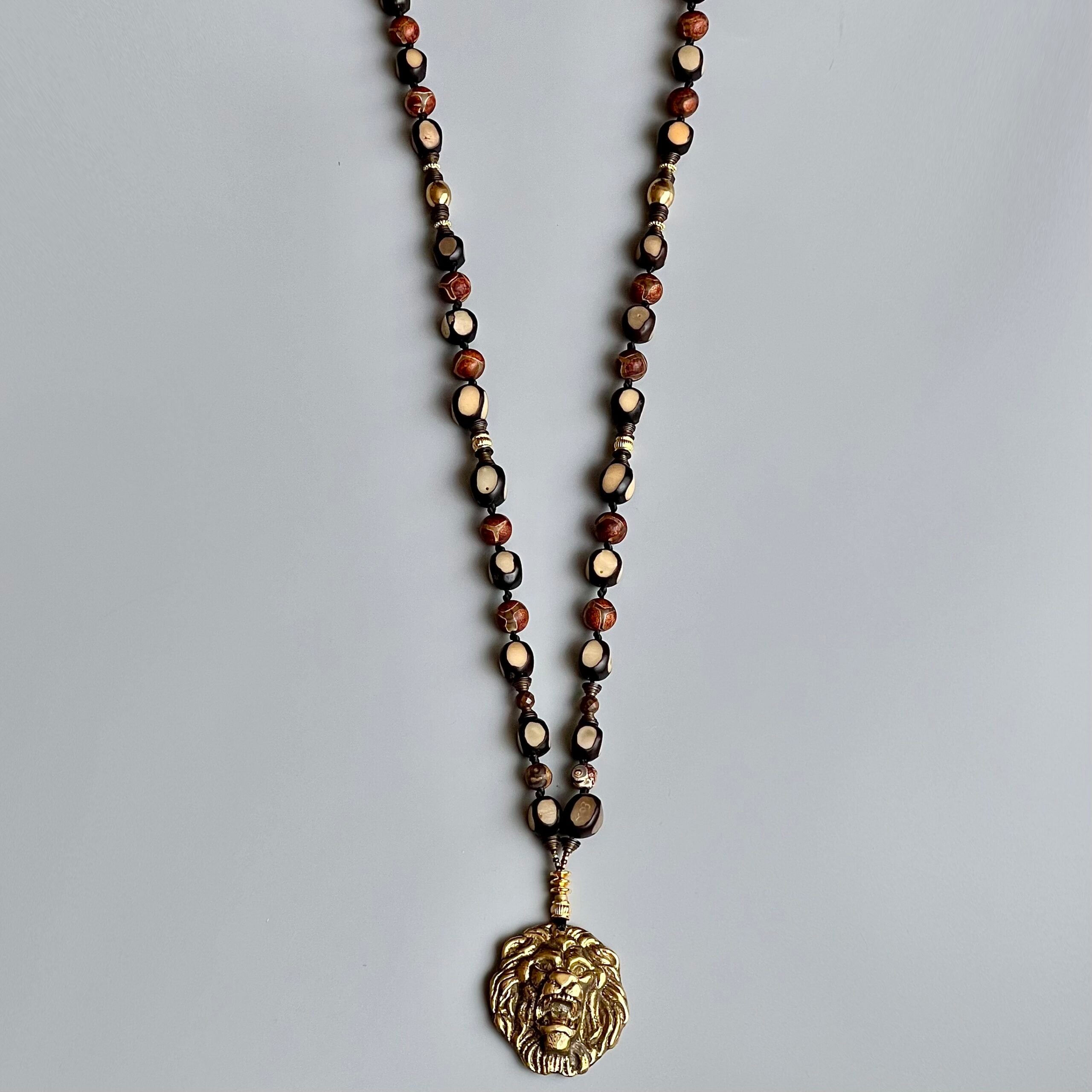 Designed with an antique lion figure, Tibetan tiger's eye, Tibetan agate, bronze, and a 22K gold-plated clasp.