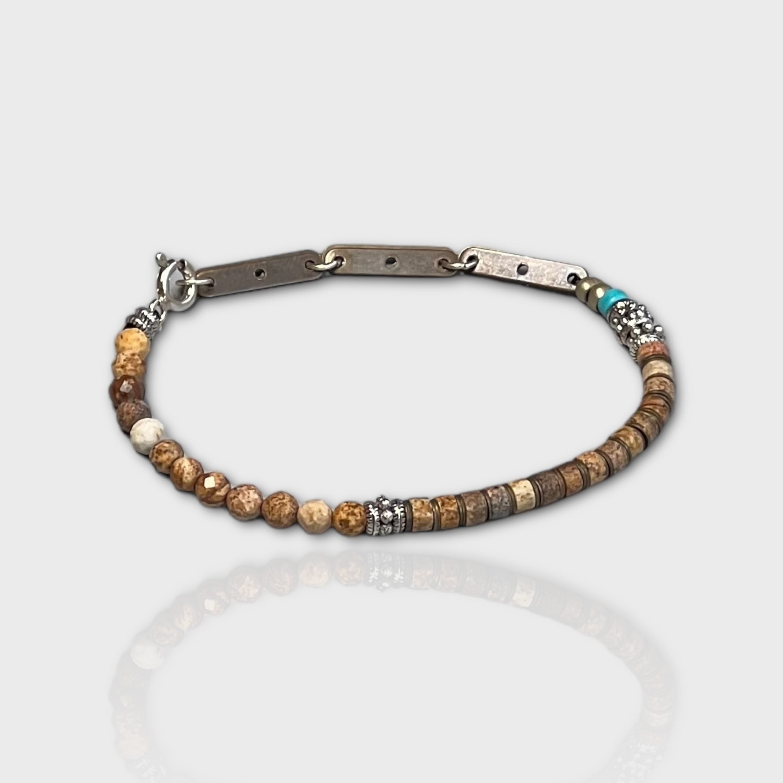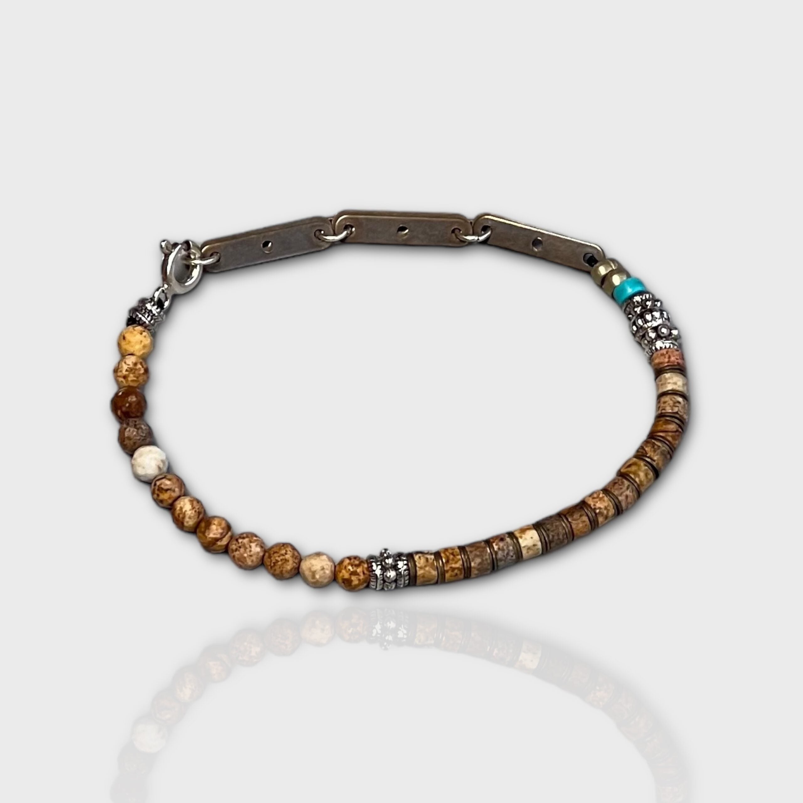 Designed using jasper, turquoise, silver, and bronze.