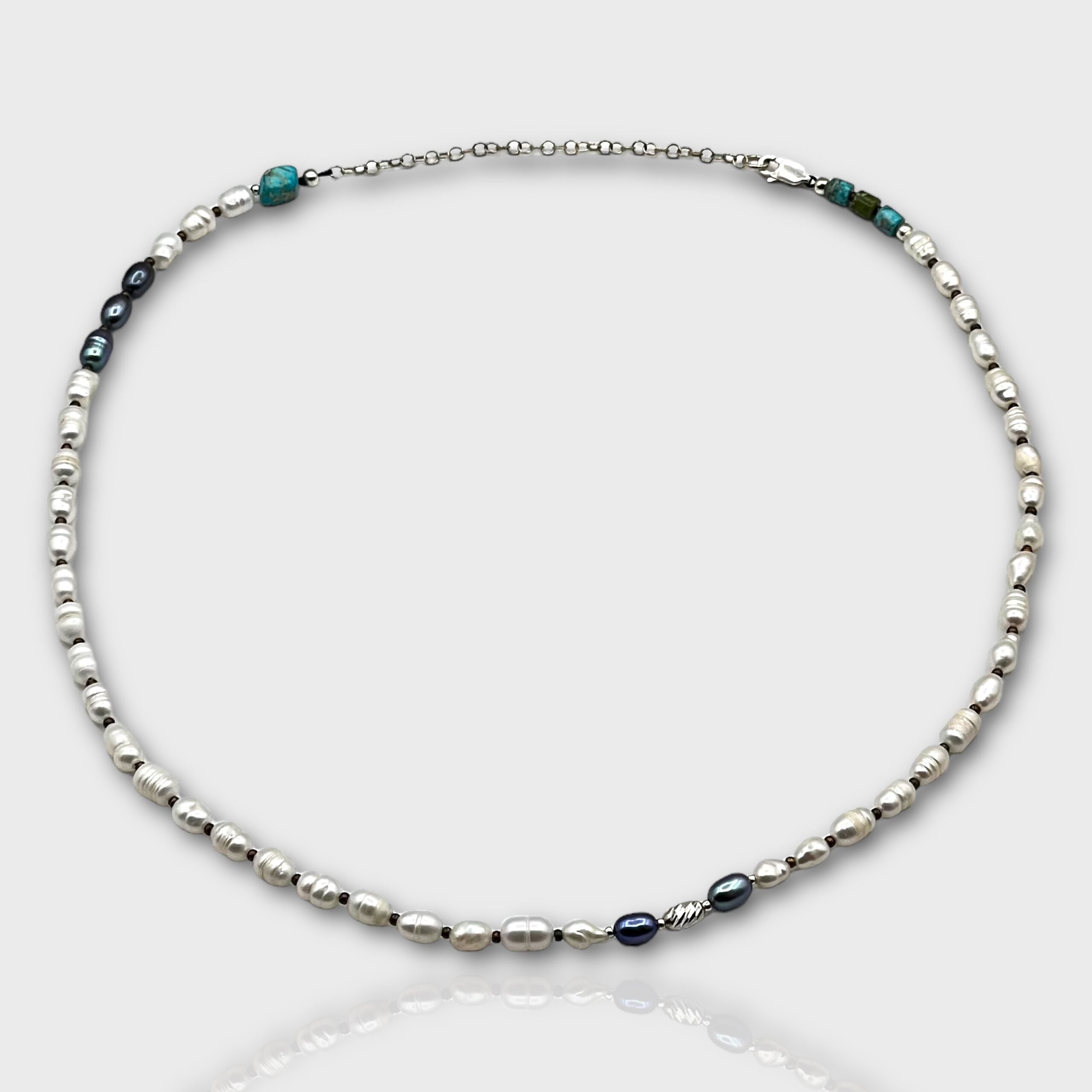 Crafted with 925K silver, black and white freshwater pearls, and turquoise.