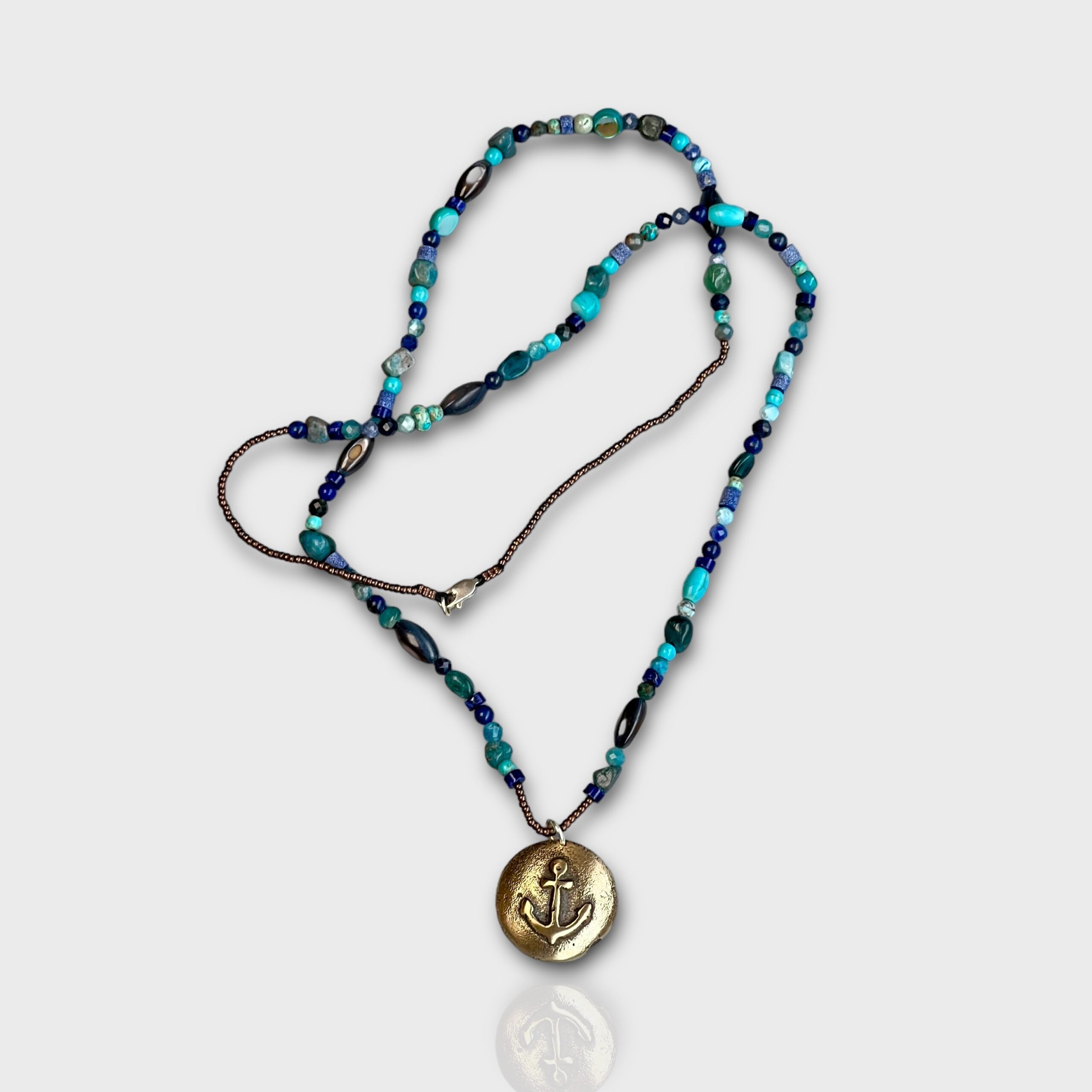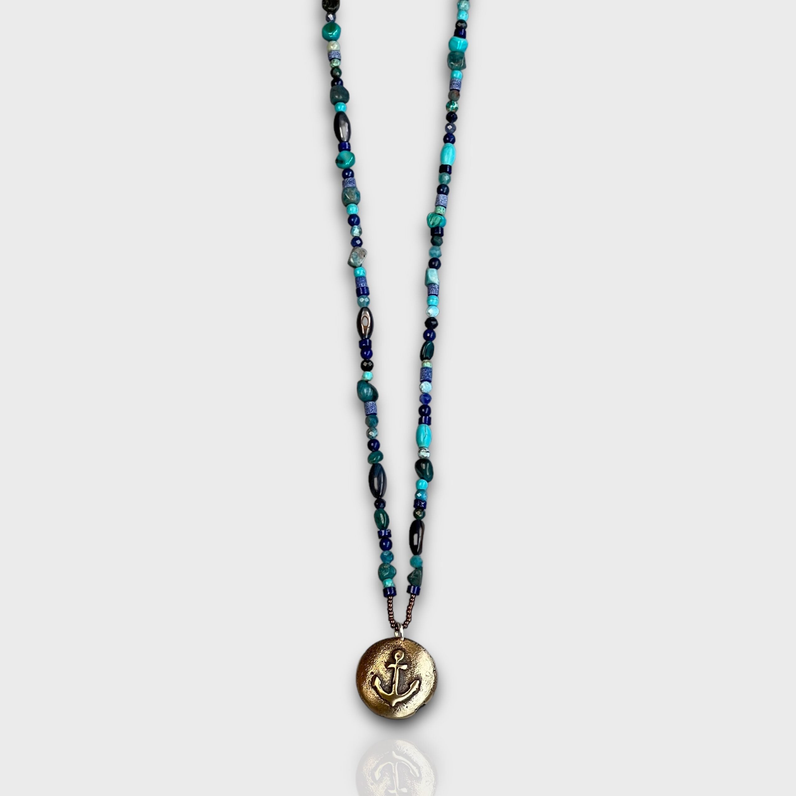 Designed using hematite, onyx, lava stone, oxidized antique bronze cast pendant, and silver.