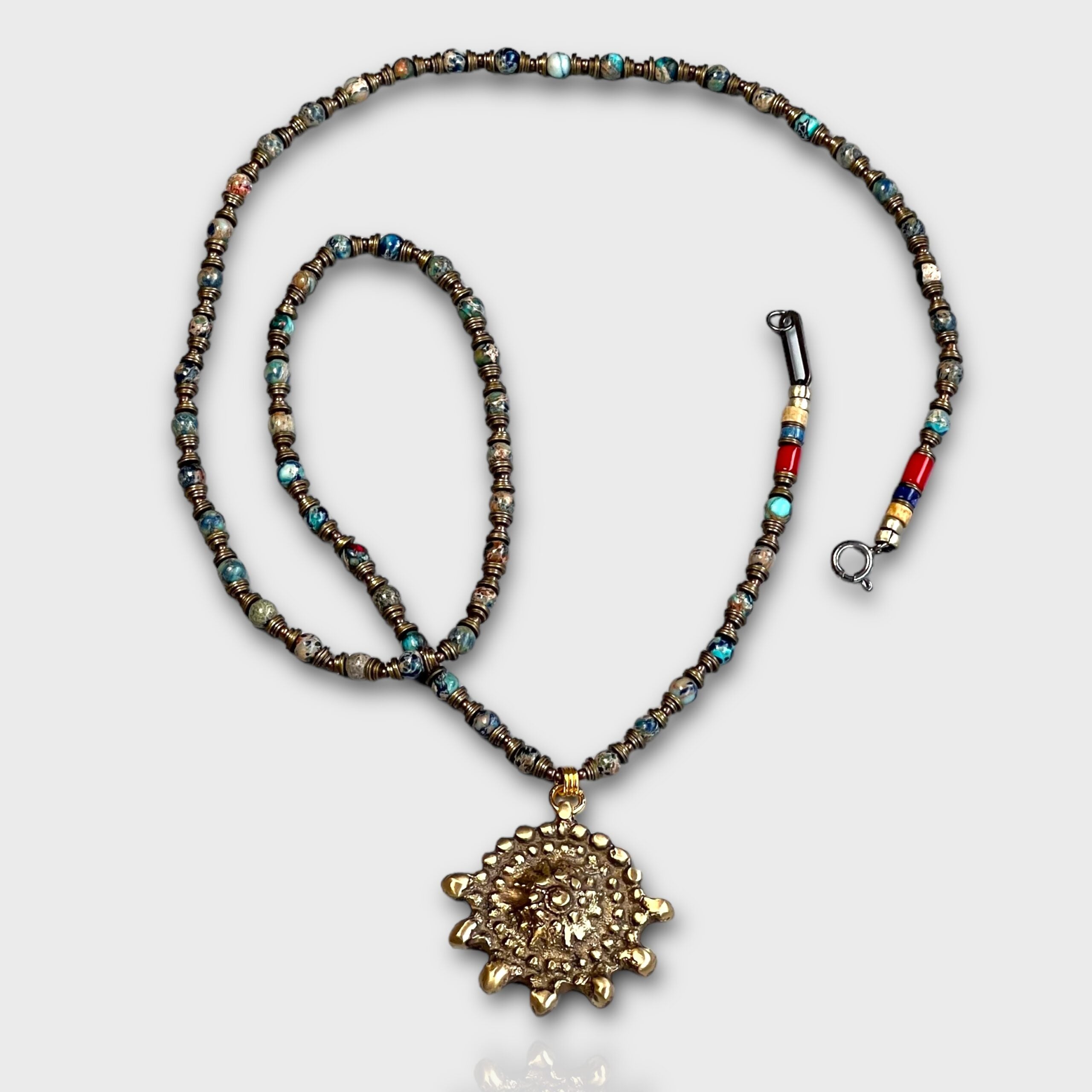 Designed using African turquoise, coral, jasper, lapis, and oxidized silver.