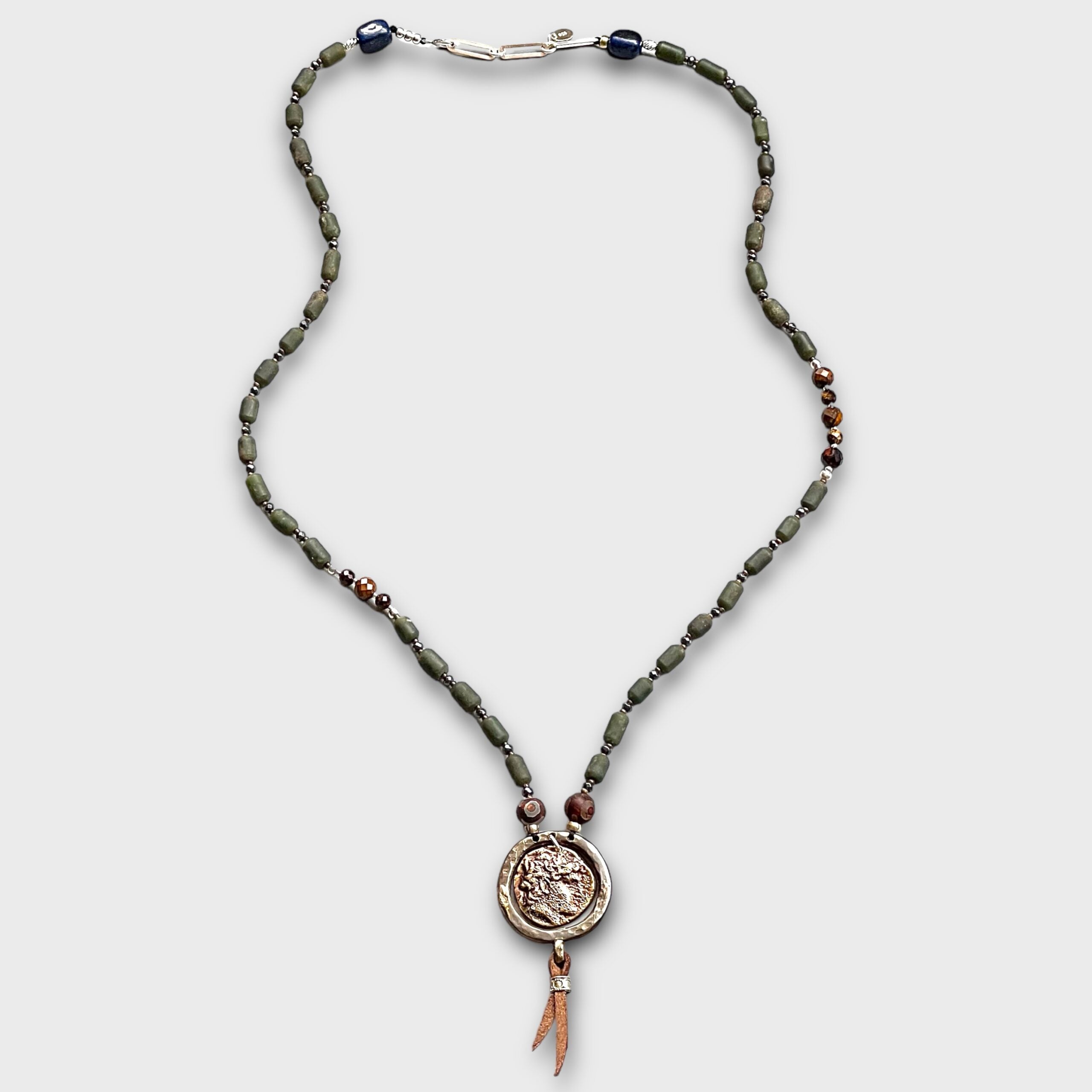 Designed with silver, lapis lazuli, jade (nephrite), tiger eye, hematite, leather, bronze, and Tibetan agate.