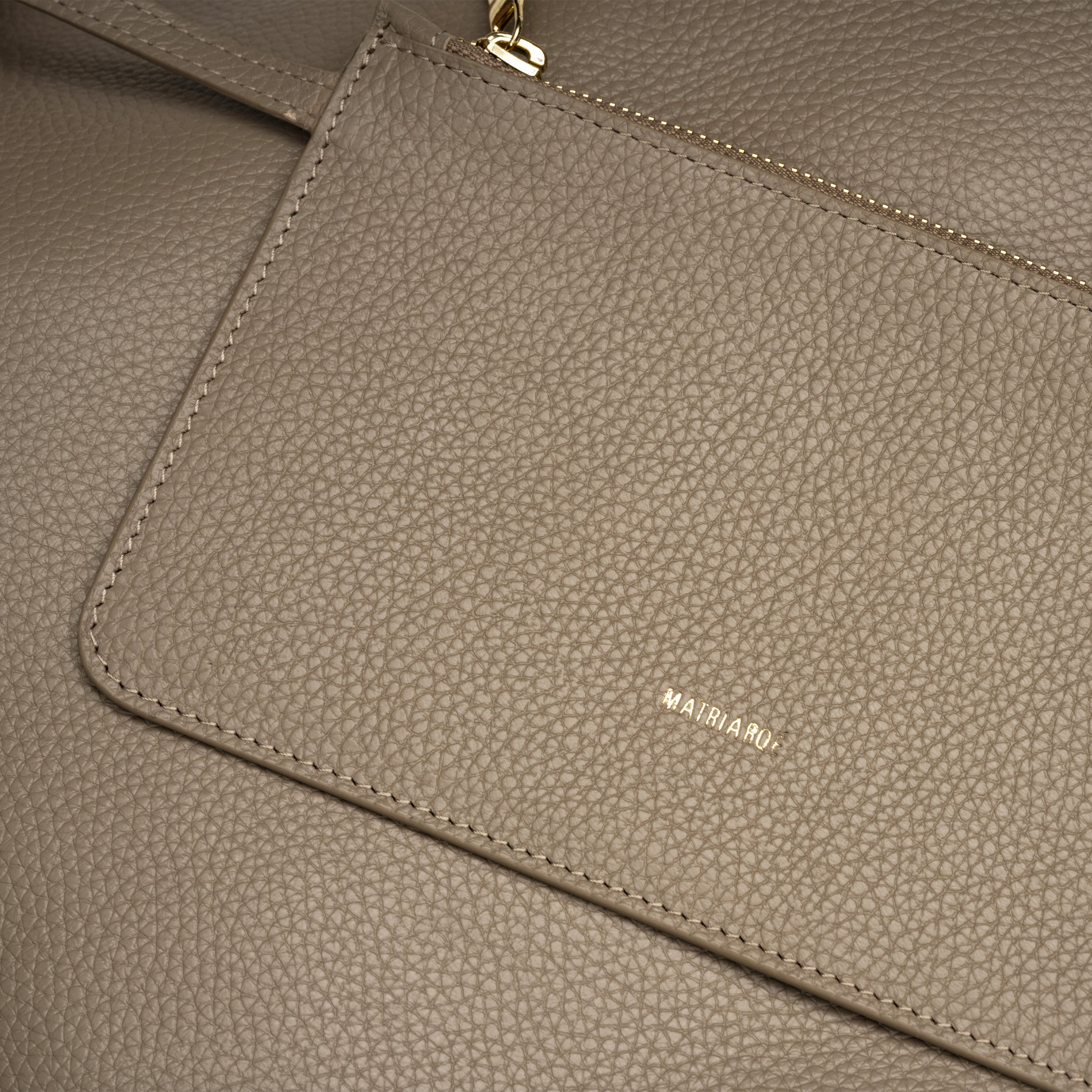 A metal zip with teeth secures the bag, and LWG certified textured calf leather and suede includes a detachable calfskin zip pouch for your essentials.