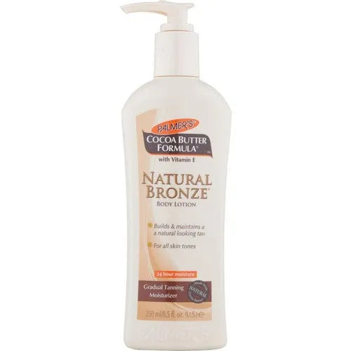 Palmer's Cocoa Butter Naturel Bronze Body Lotion 250 mlBu Kakao Yağı ve E Vitamini ile zenginleştirilmiş kademeli bronzlaştırıcı ile hafif bir ışıltı oluşturunBirkaç gün içinde sağlıklı görünen bir bronzluk yaratır24 saat nem Saf Kakao Yağı ve Vitamin E'nin özel bir kombinasyonuna sahip bu kremsi, nemlendirici losyon, cildinizi doğal görünümlü bir ışıltı ile güzel ve sağlıklı tutmanın mükemmel bir yoludur. Palmer's Cocoa Butter Formula Natural Bronze, sadece bir dokunuşla bronzlaştırıcı bir dokunuşla tüm yıl boyunca hassas, güneş öpücüğü veren bir yaz ışıltısı yaratır. Cildinizi derinlemesine nemlendirirken, birkaç gün içinde yavaş yavaş hafif bir bronzluk oluşturur. Açıktan orta koyuya, cilt tonunuzun yoğunluğunu yıl boyunca kontrol edin.