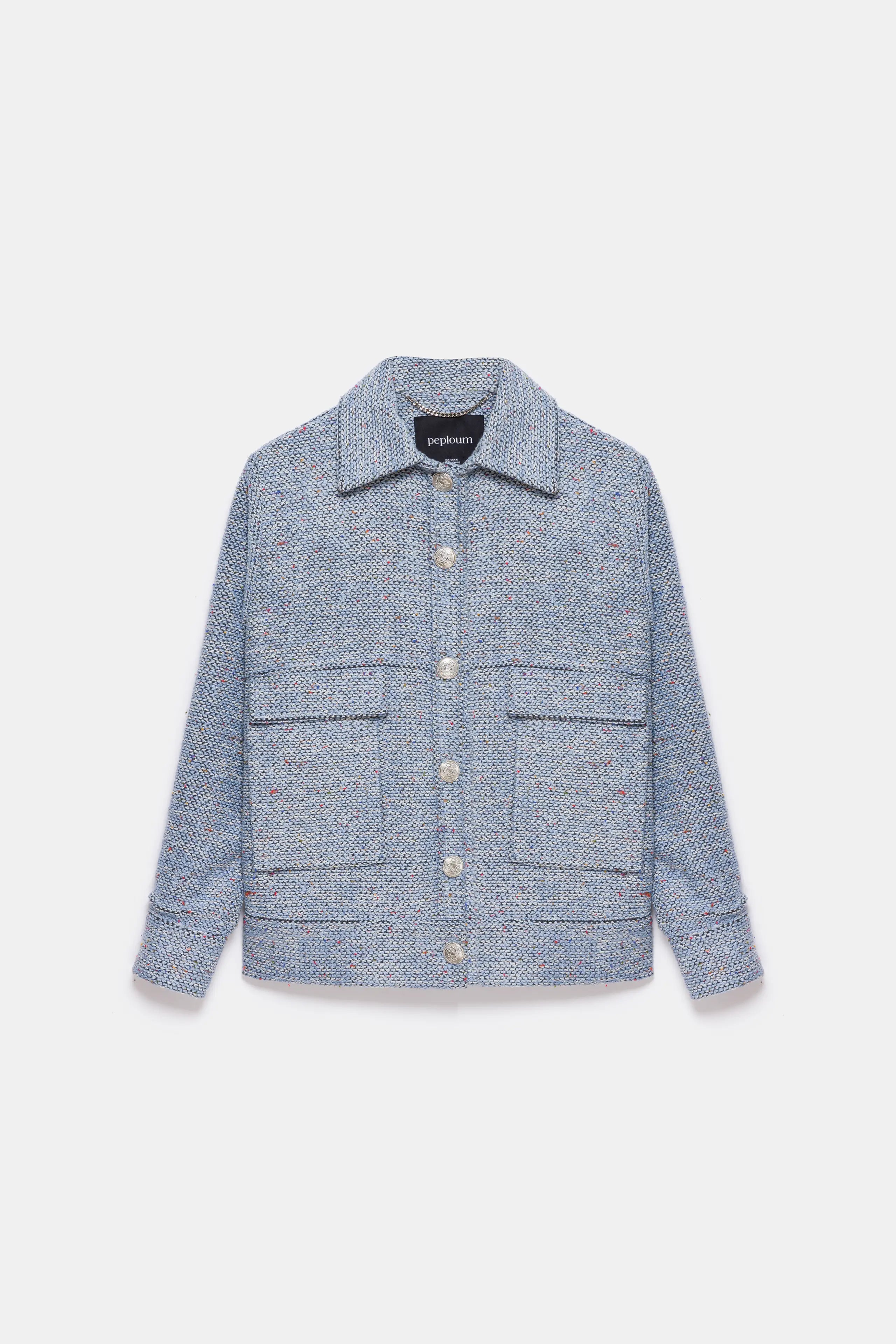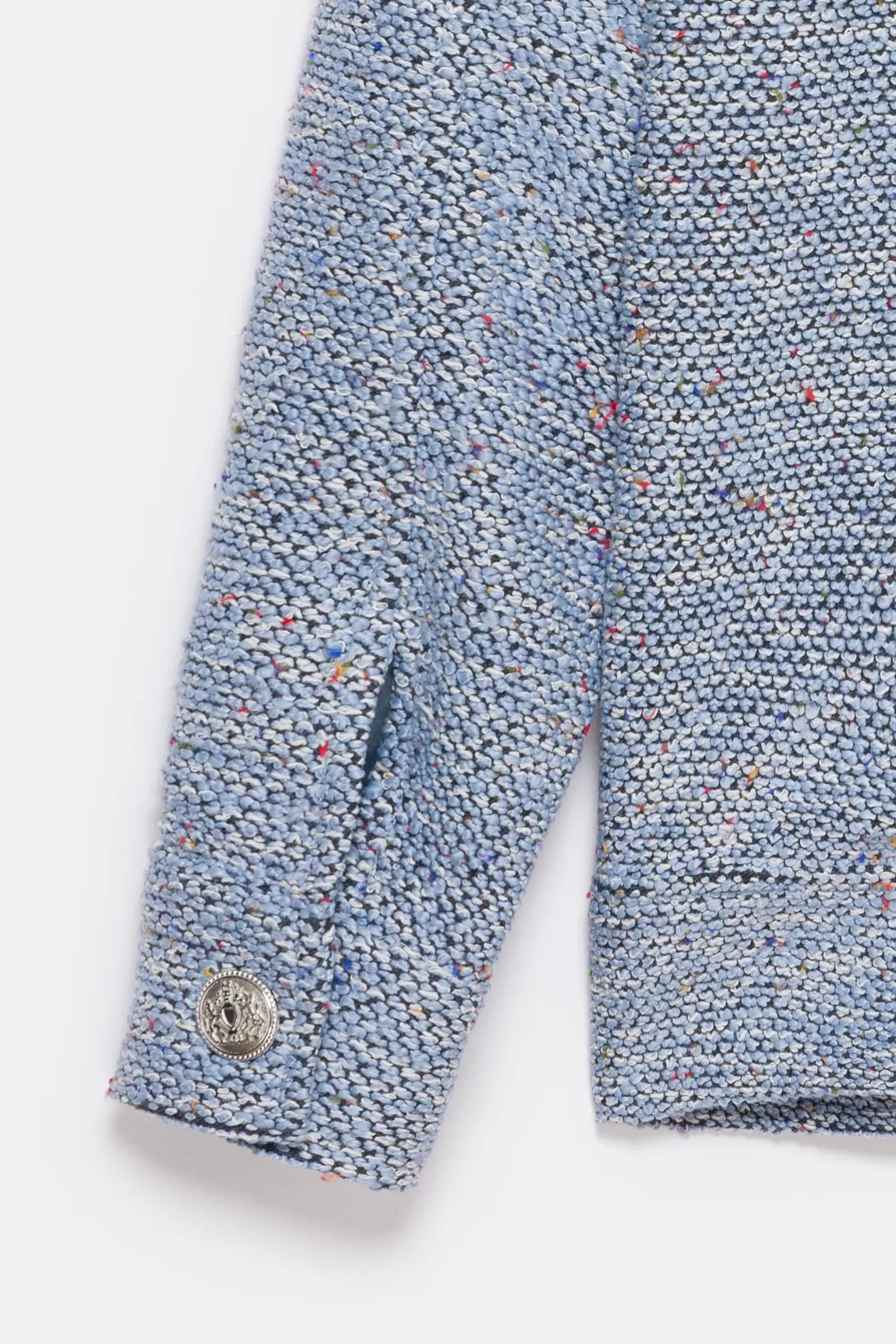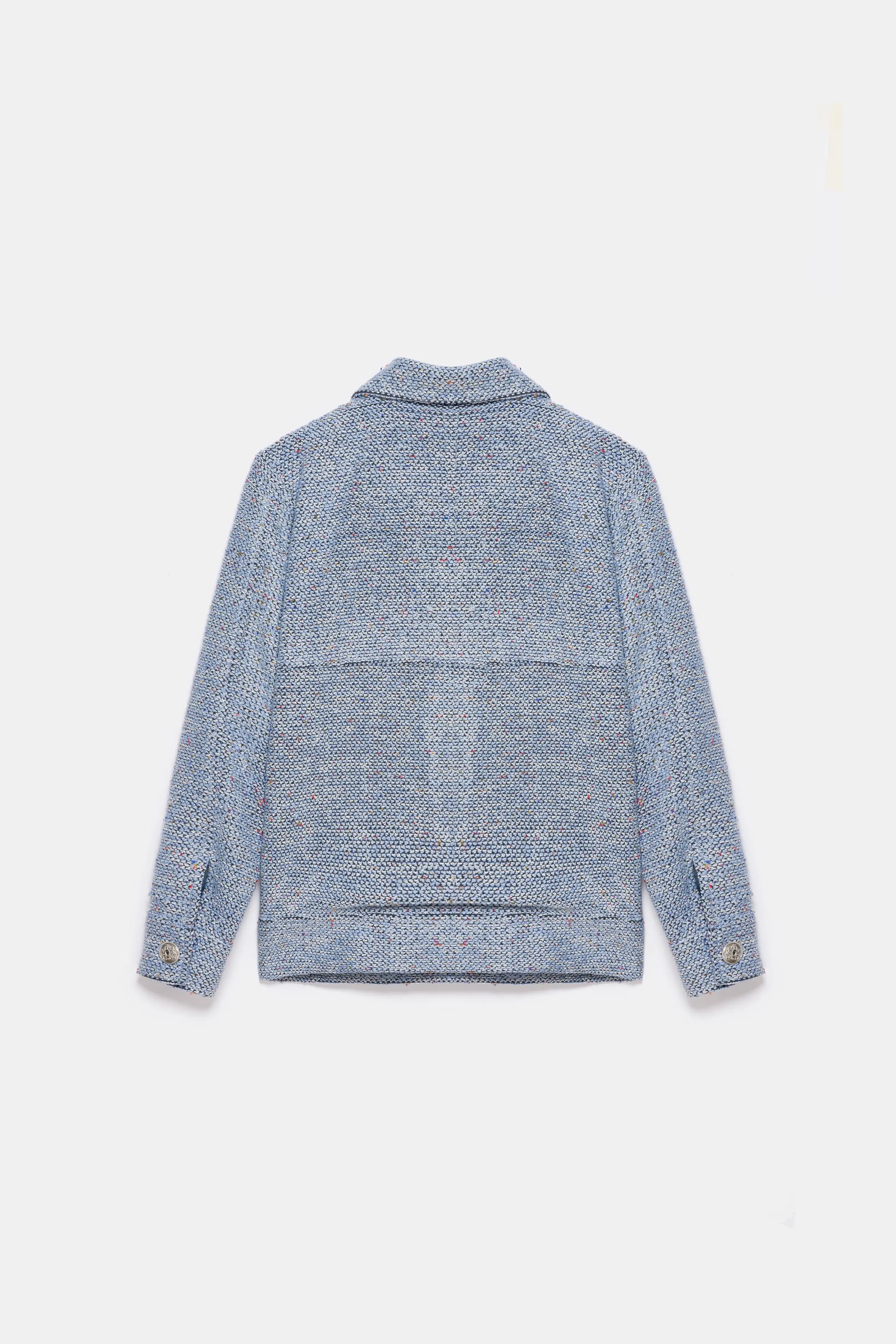 Thanks to its special knitted fabric, the jacket gains a handwoven appearance. Two flap pockets enhance functionality, while buttoned cuffs and a shirt collar provide design harmony. The metal button choice emphasizes the fabric, creating a modern and dynamic look. There are two different color options available.