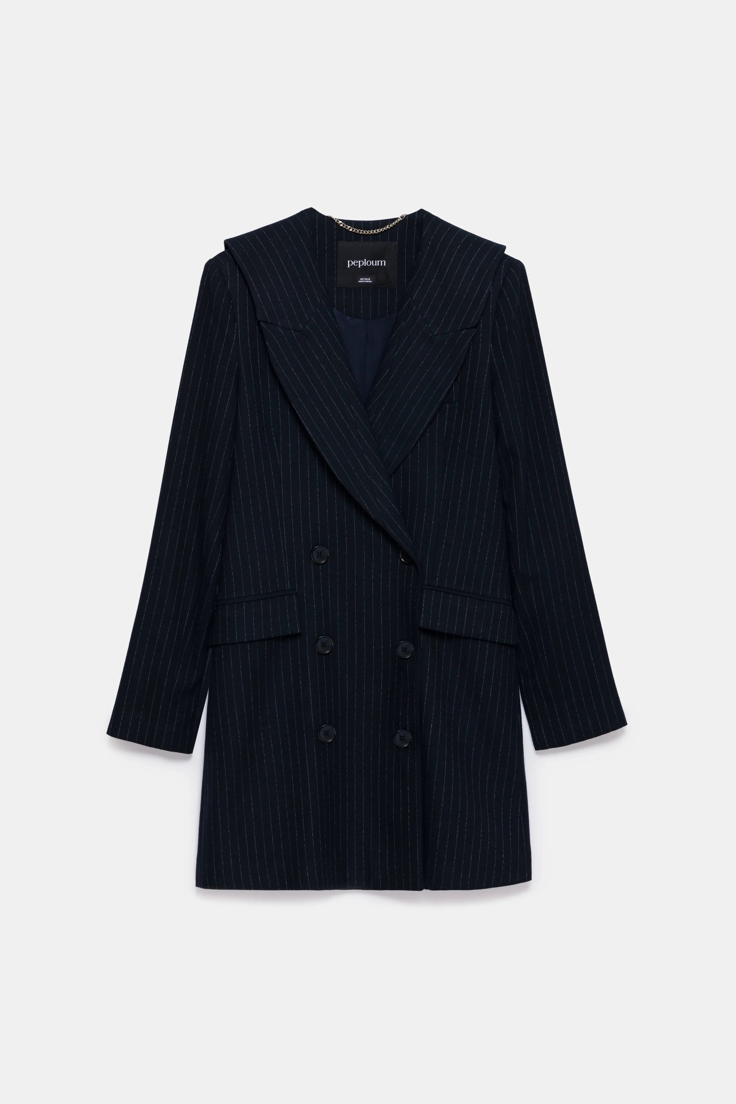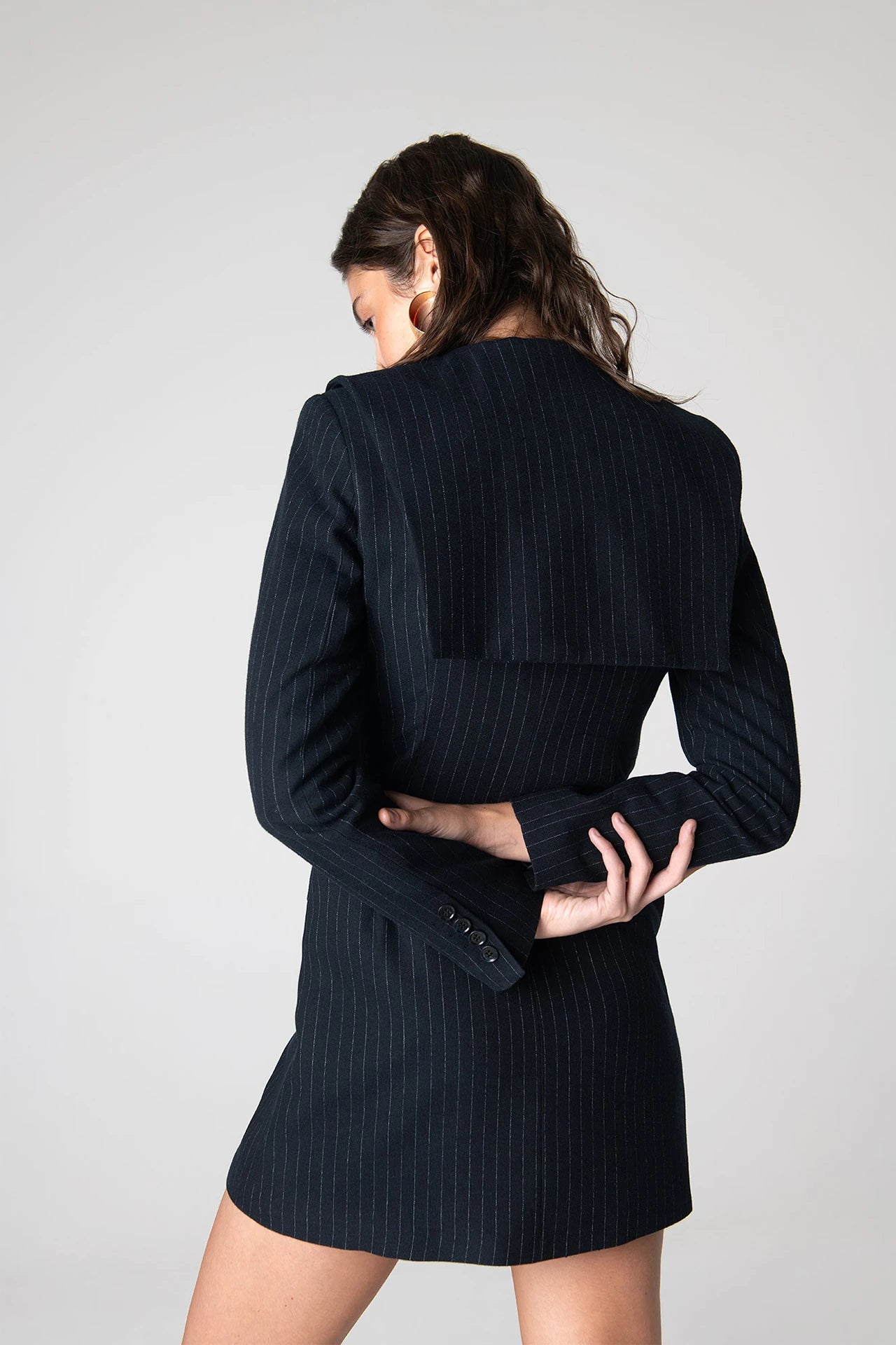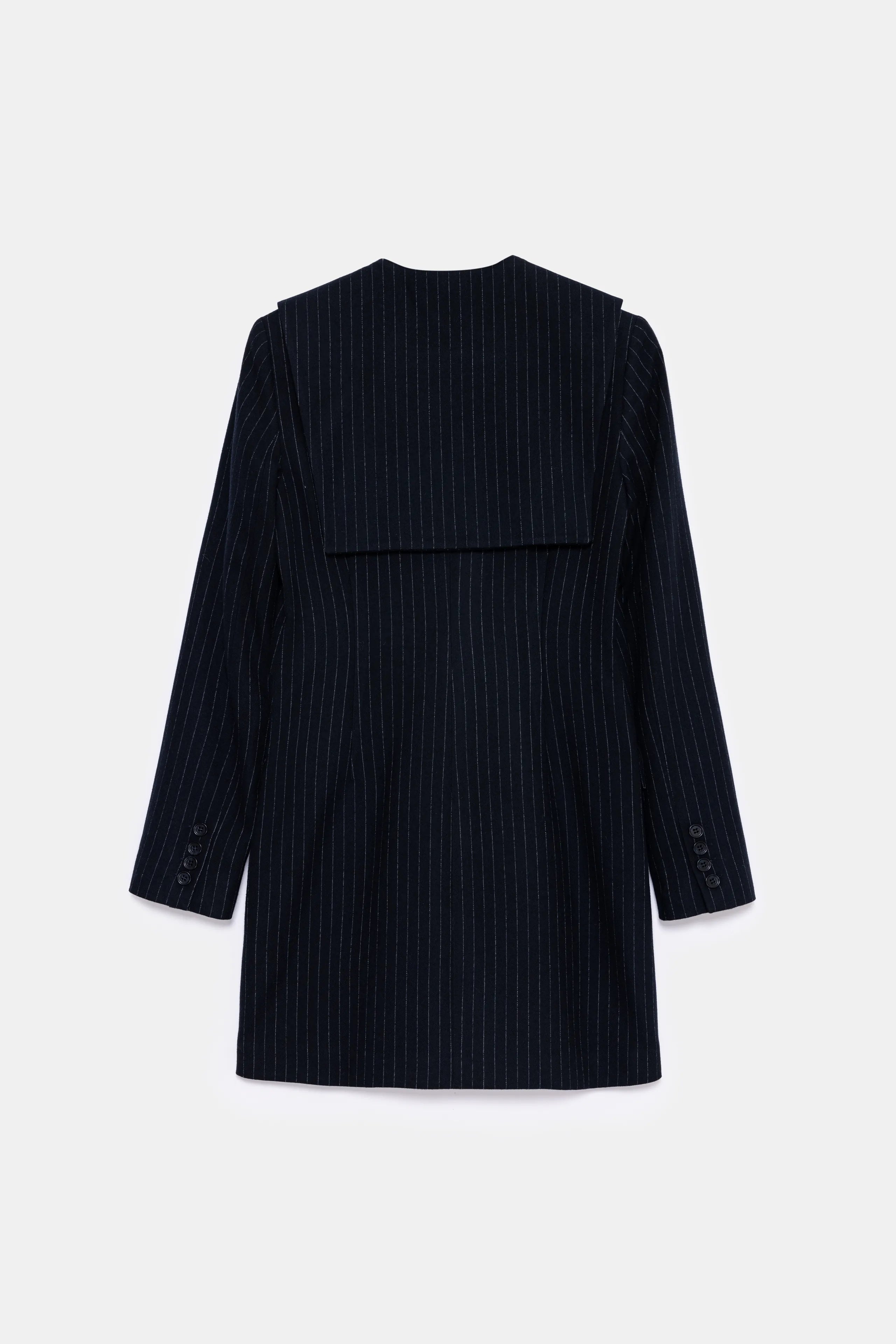The double-breasted jacket dress is designed to be worn both as a dress and a jacket, prioritizing functionality. Its body-hugging silhouette, which provides a feminine look, is completed with a half-swan neck and transforms into a sailor collar at the back. The striped fabric choice aligns with the theme of the collection, and it is available in two different color options.