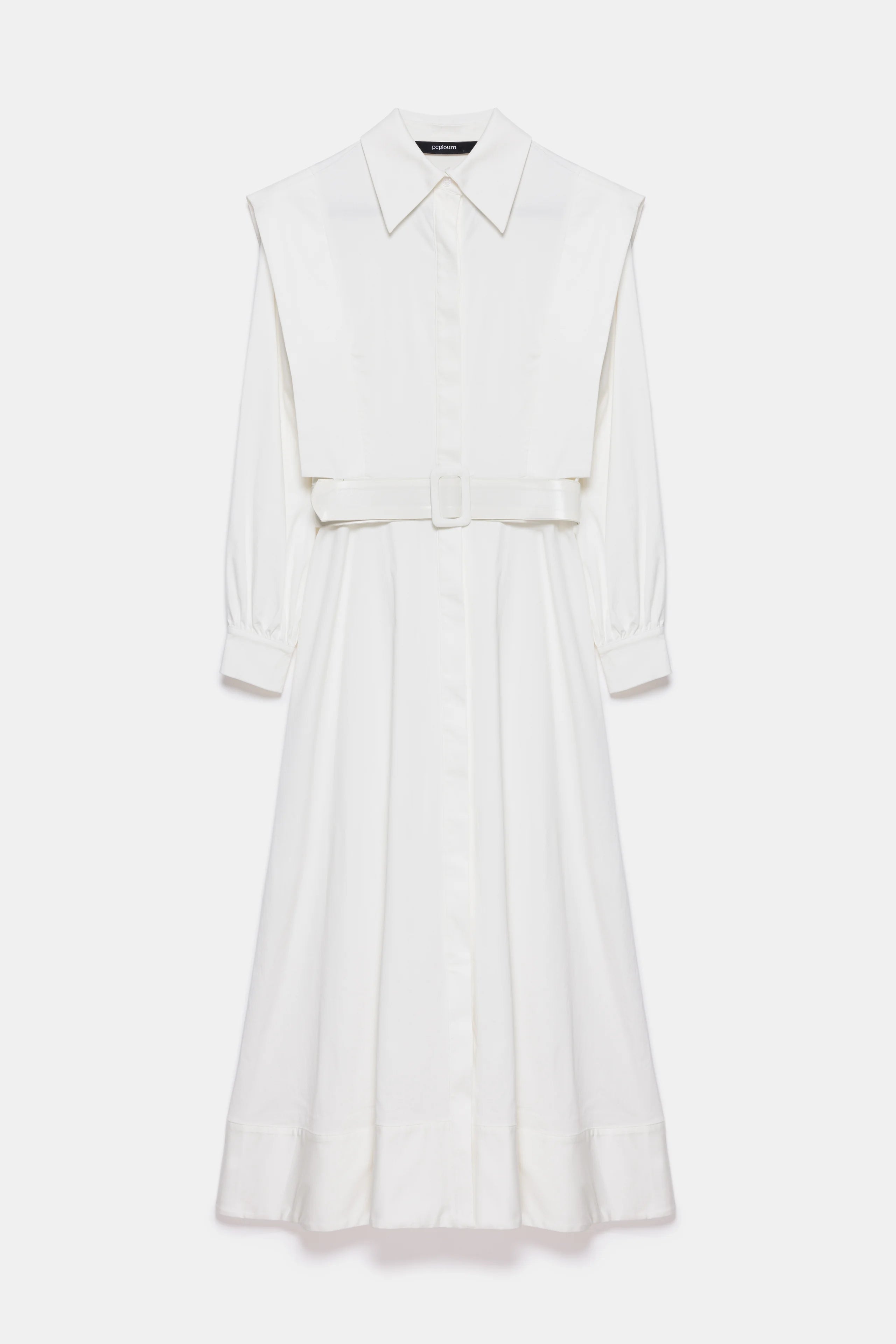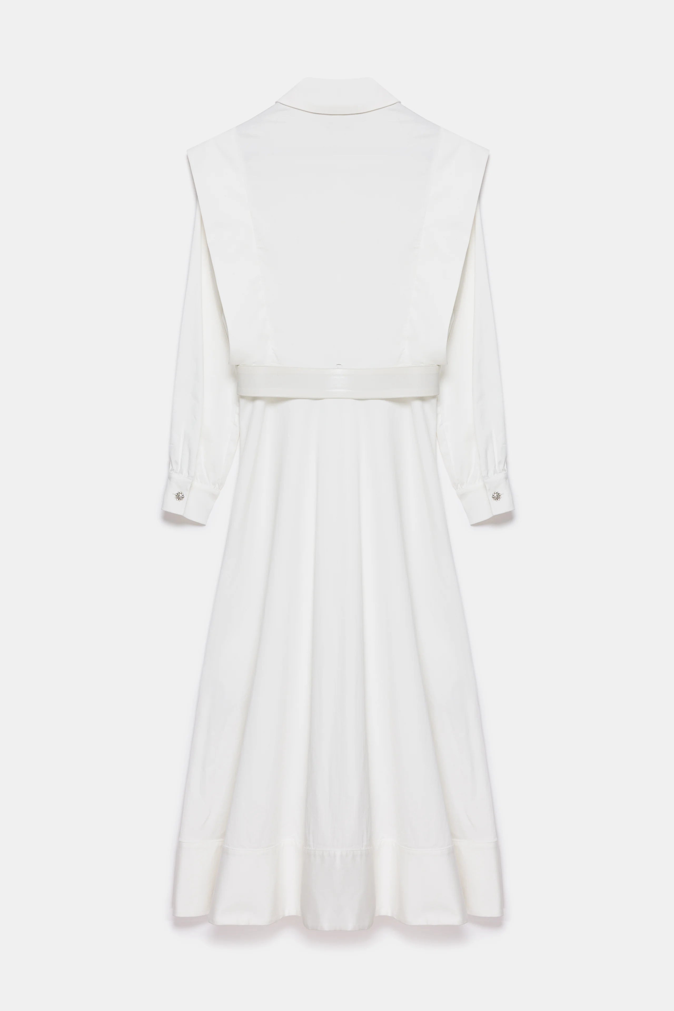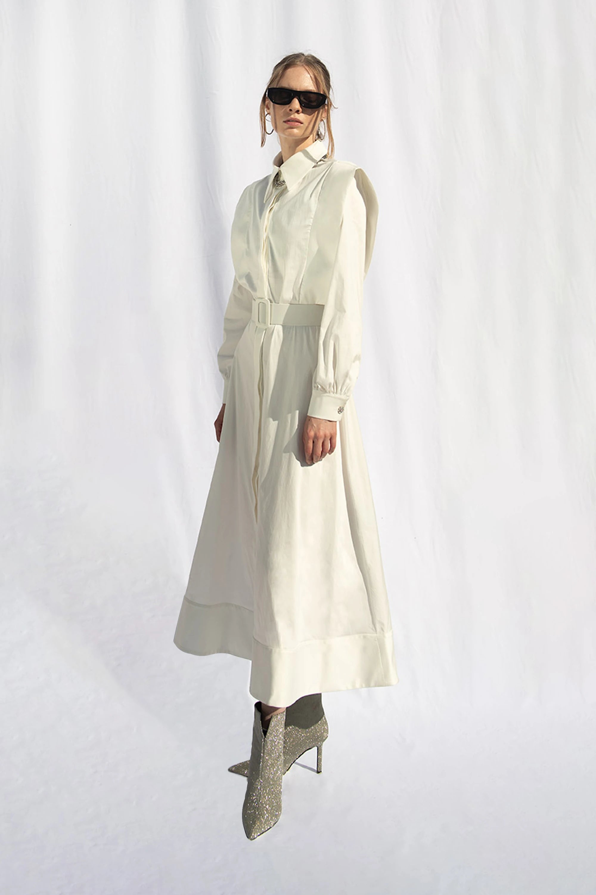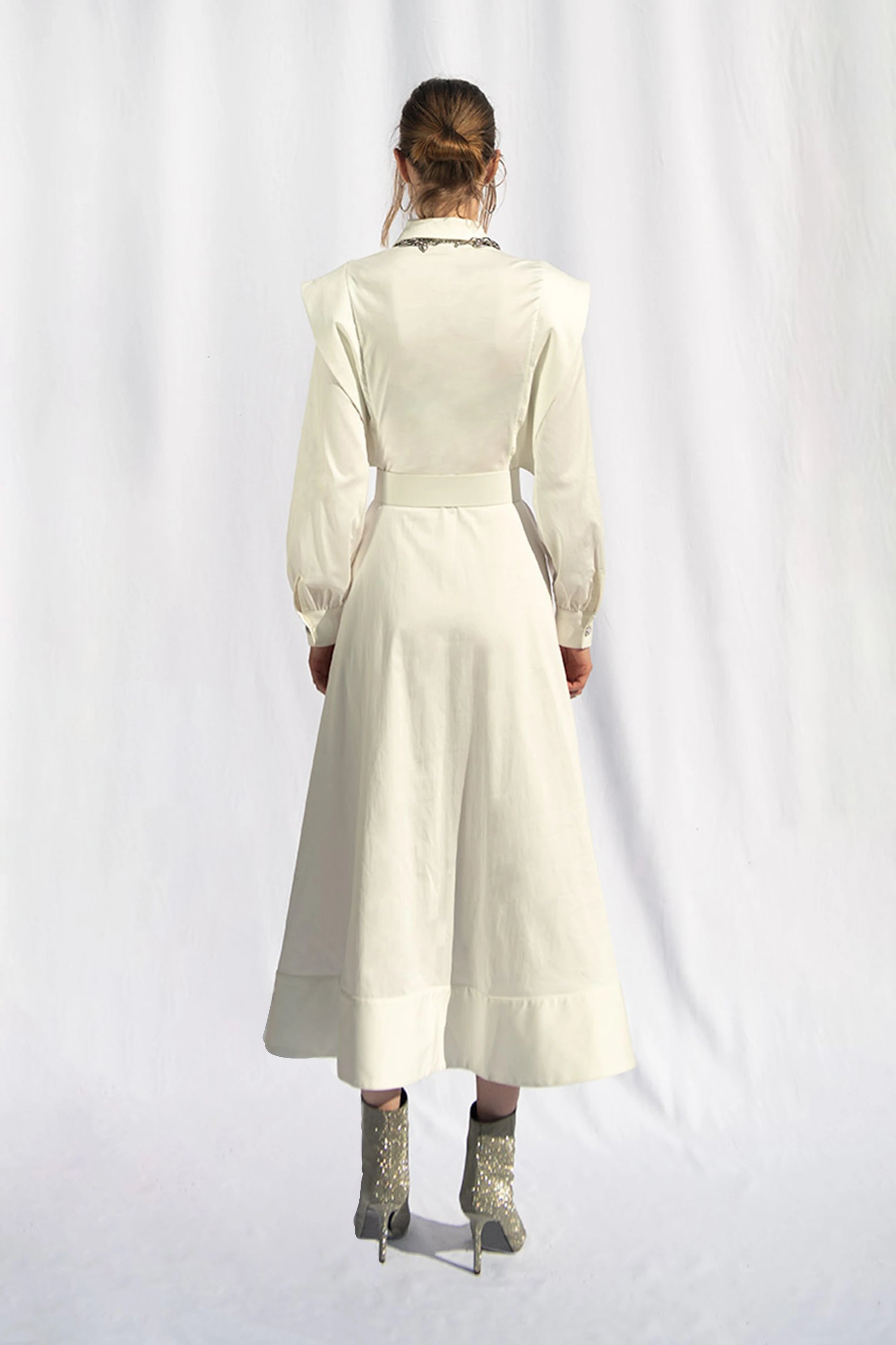 This A-line shirt dress offers a striking look with its shoulder details. The additional piece at the hem enhances the richness of the dress. Suitable for both everyday wear and special occasions, it is incredibly practical. The jeweled buttons on the cuffs complete the dress's design. It also includes a detachable belt.