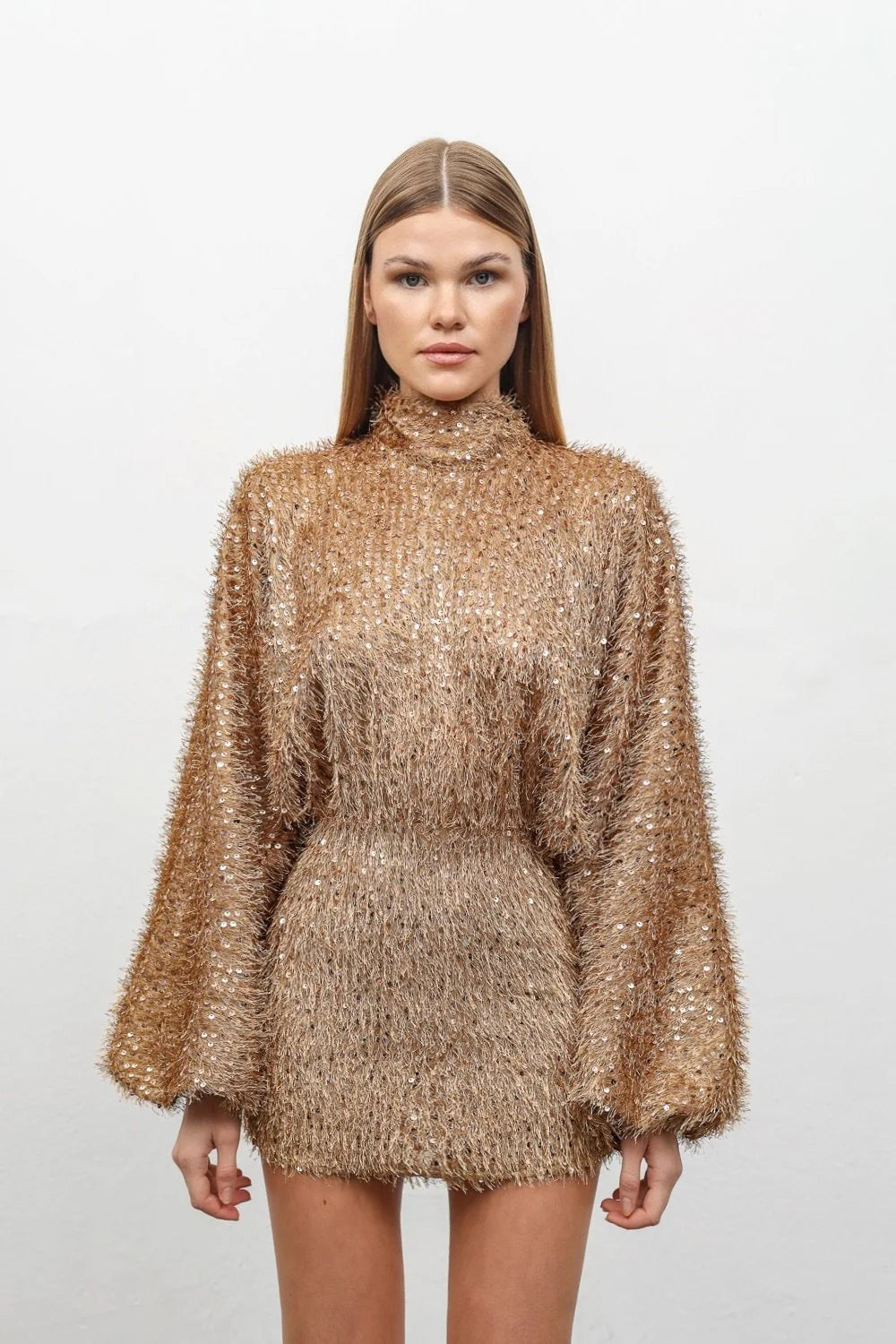 Mini length dress with shiny sequined fabric, shiny neck tie detail, balloon sleeves.