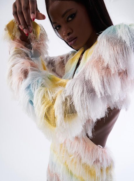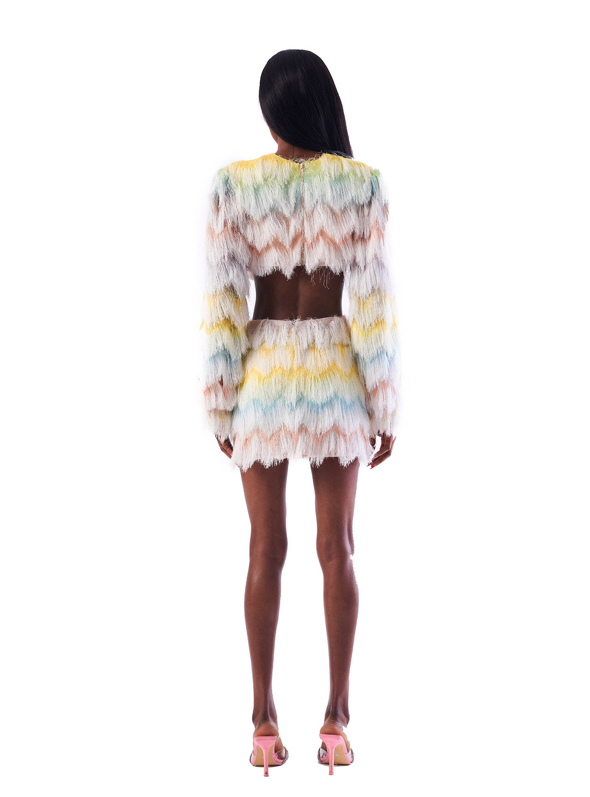 Balloon Sleeve Deep V-Neck Mini Fringed Multicolored Dress