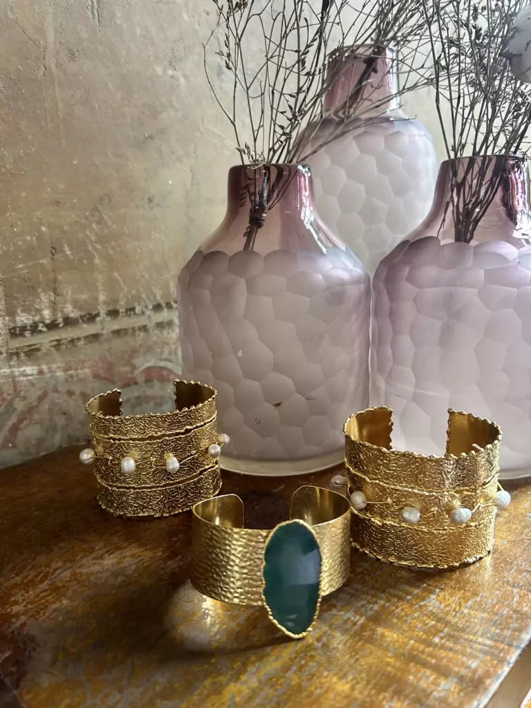 A handmade hammered gold finished chunky cuff embellished with Green Onyx gemstone, luxuriously crafted in 18K gold plated over brass. The Aphrodite Cuff is designed by artisans with traditional Anatolian motifs manufactured in The Old Town District ateliers.