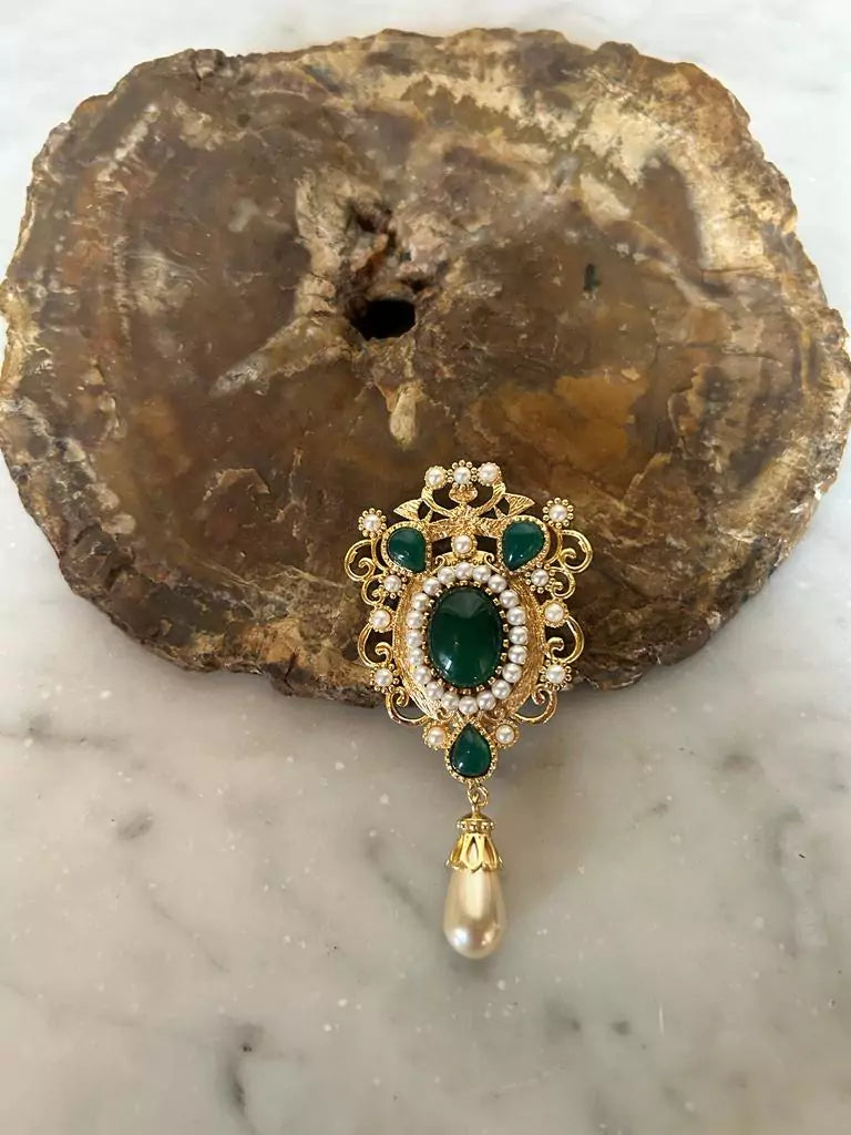 A handmade regal brooch designed with different colors of semi-precious gemstones, luxuriously crafted in 18K gold plated over brass. Elizabeth Brooch is designed by artisans with traditional Anatolian motifs manufactured in The Old Town District ateliers.