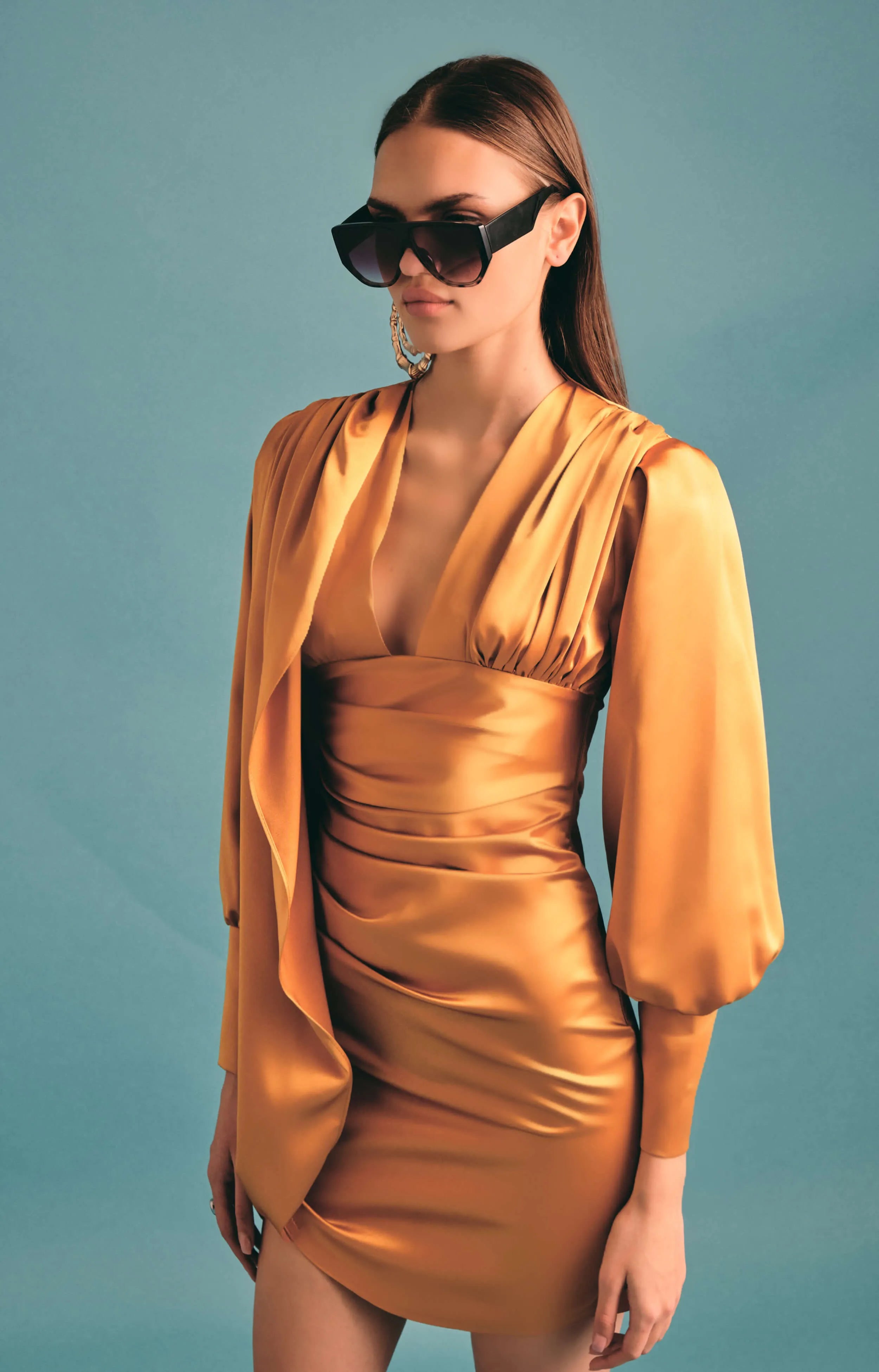 Product features: Mini dress with padded shoulders and ruffle detail, pleated waist, balloon sleeves, asymmetrical skirt detail.,