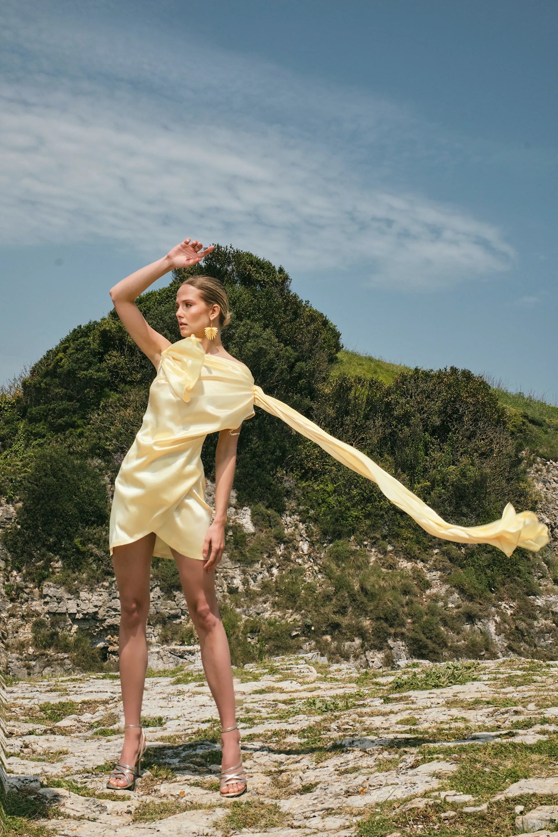 Product Features: Body-fitting pleated and gathered degaje collar, one shoulder low, shoulder-length sash detailed mini dress. Dress length can be adjusted.