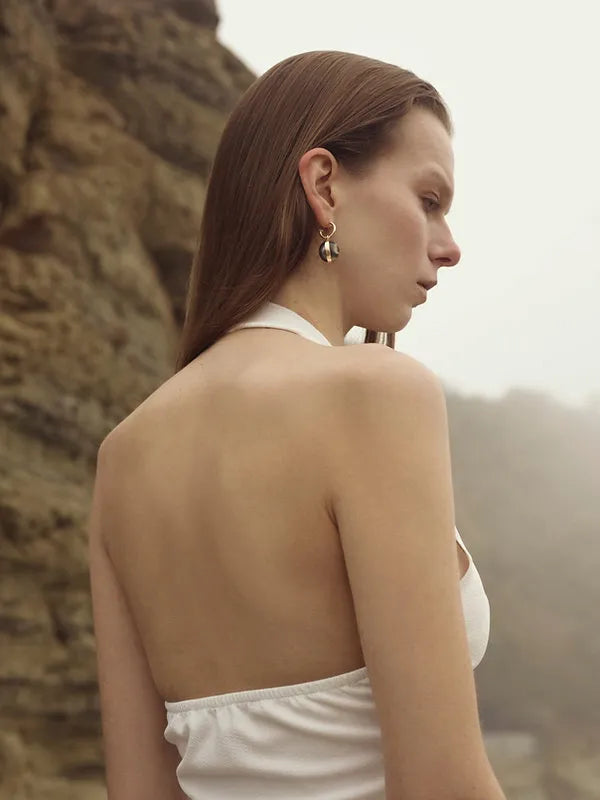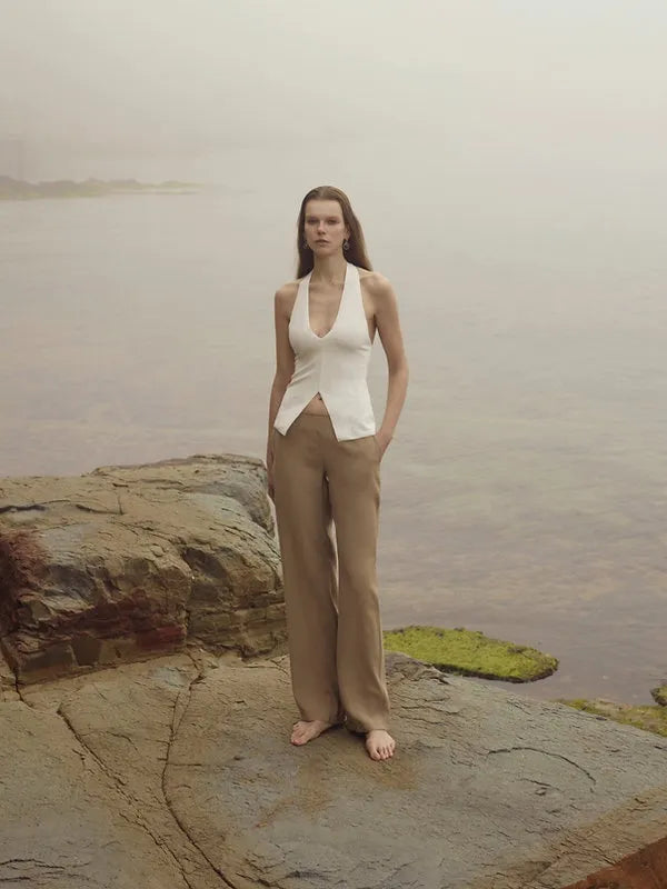 Body-hugging halter neck top. Deep V cut. Open back detail. V-shaped front finish. Stretchy back detail.