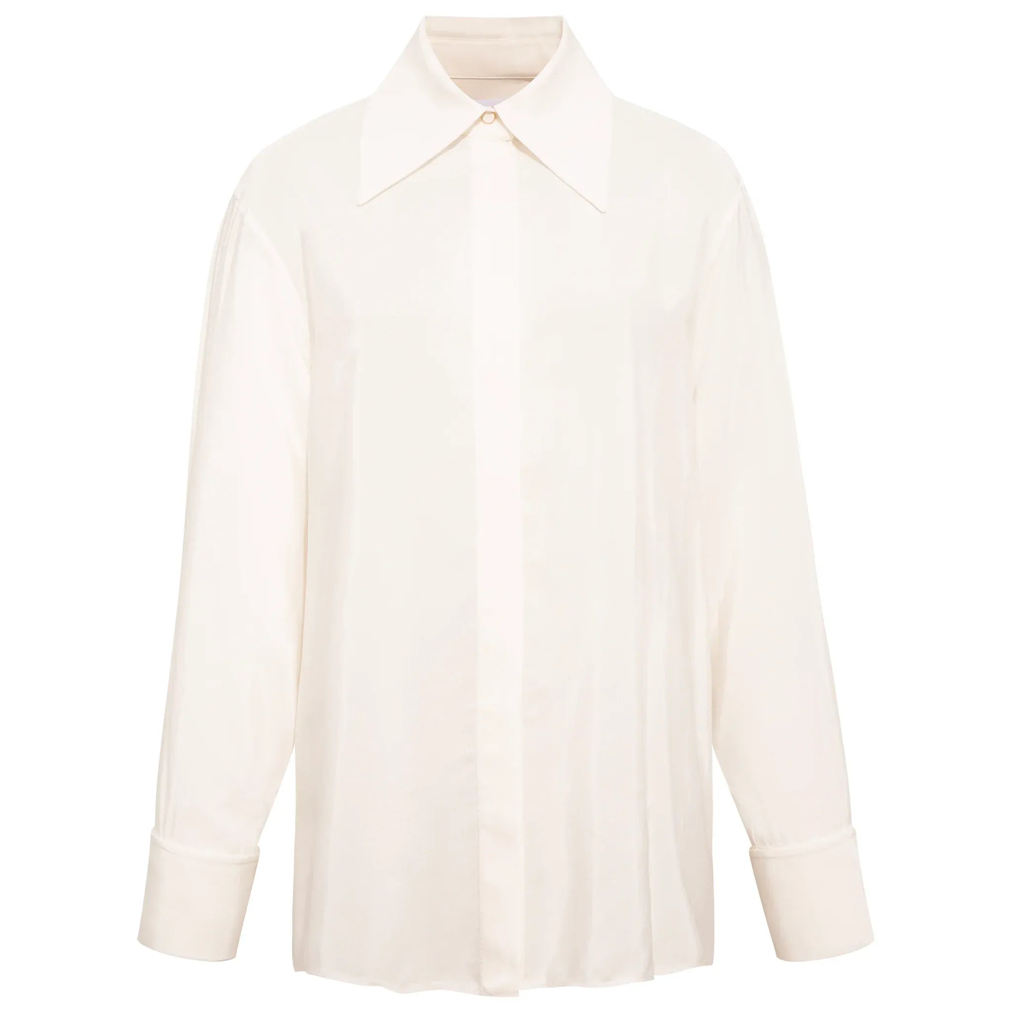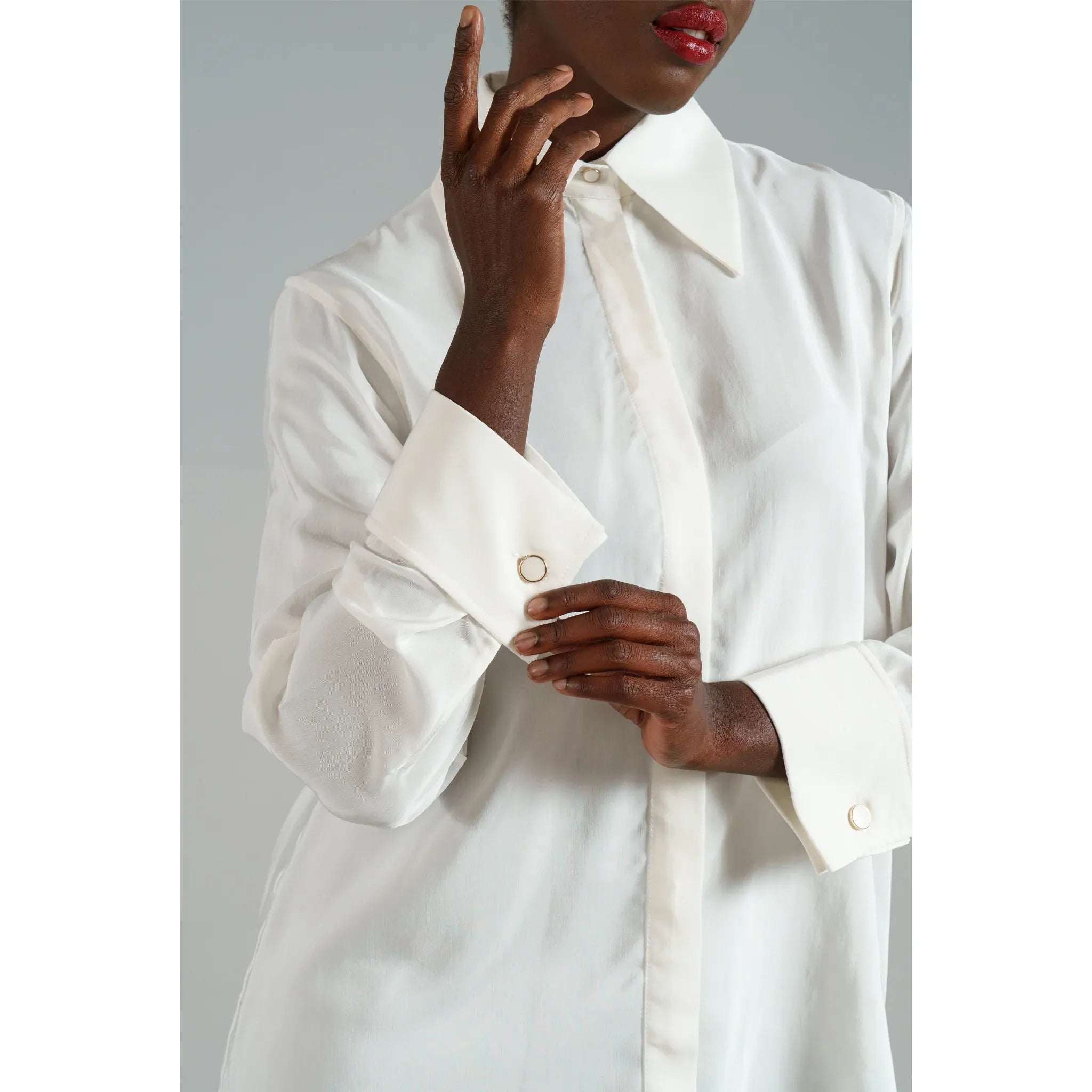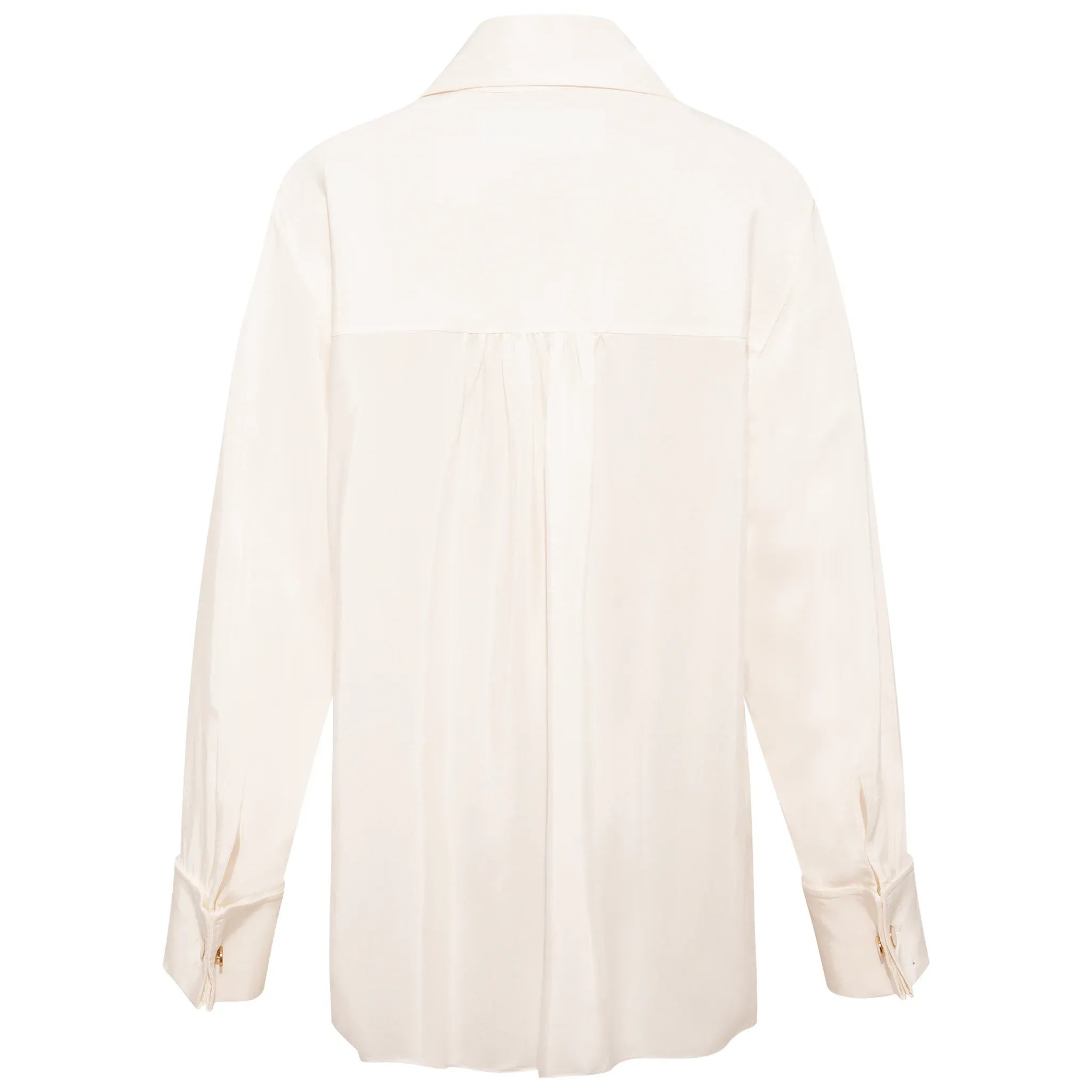 Introducing the Femponiq Ivory Long Sleeve Shirt, a perfect blend of style and versatility. Crafted in London from lightweight viscose rayon, this shirt offers a luxurious feel and polished look with the glossy surface and can be styled with tailoring, jeans or skirts. Featuring a relaxed shape with a gathered back detail, neat collar, double French cuffs adorned with two buttons, concealed button fastening through front and hip length. Finished with internal French seams.