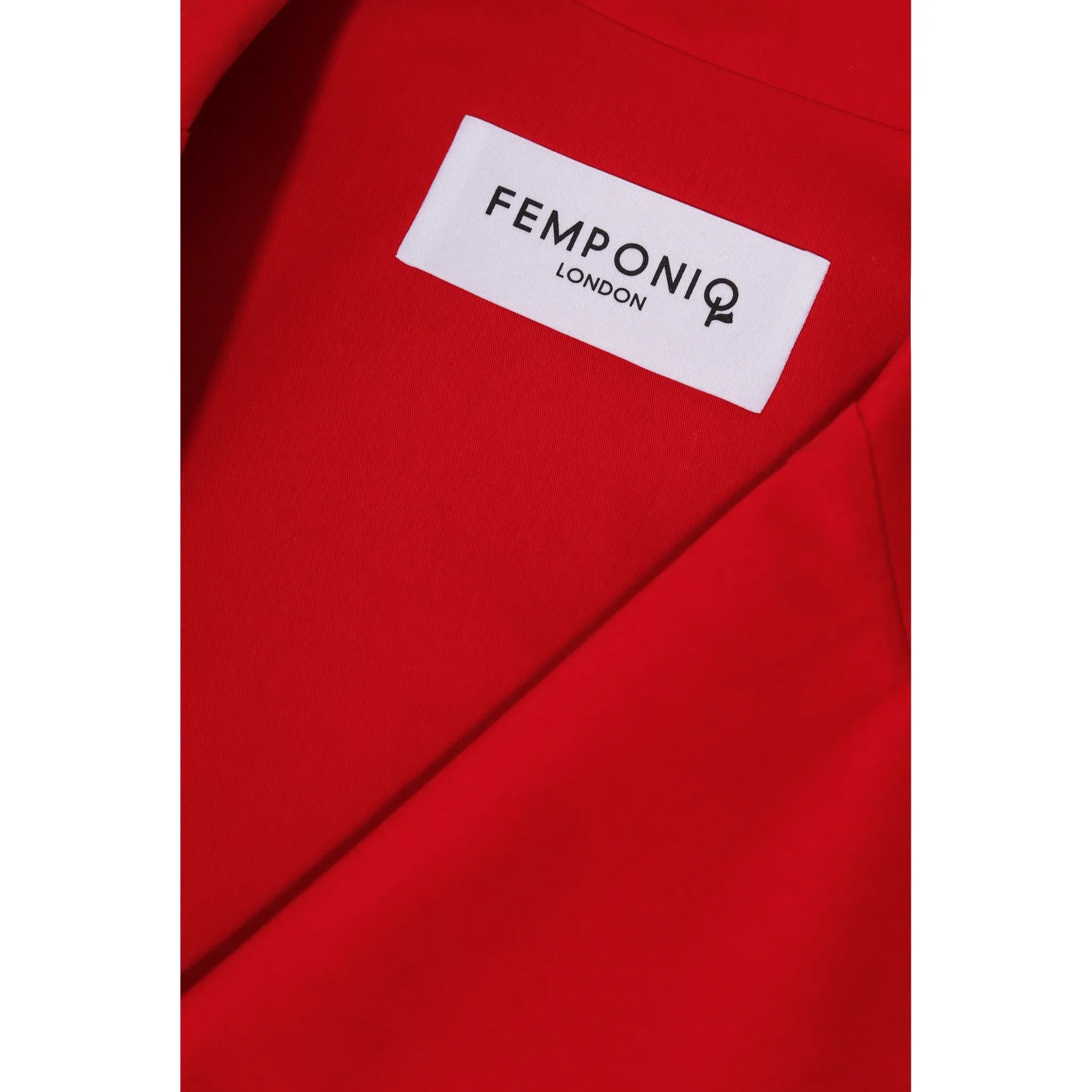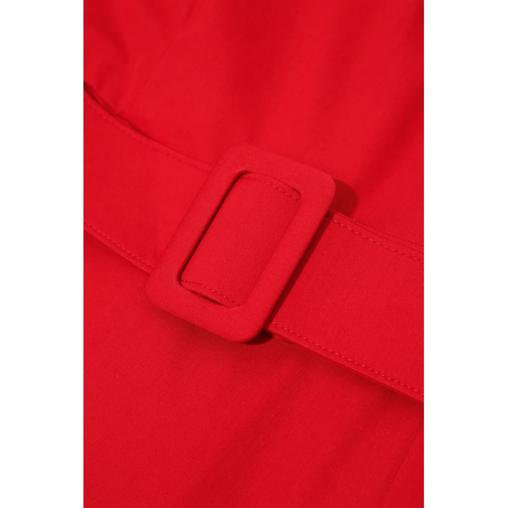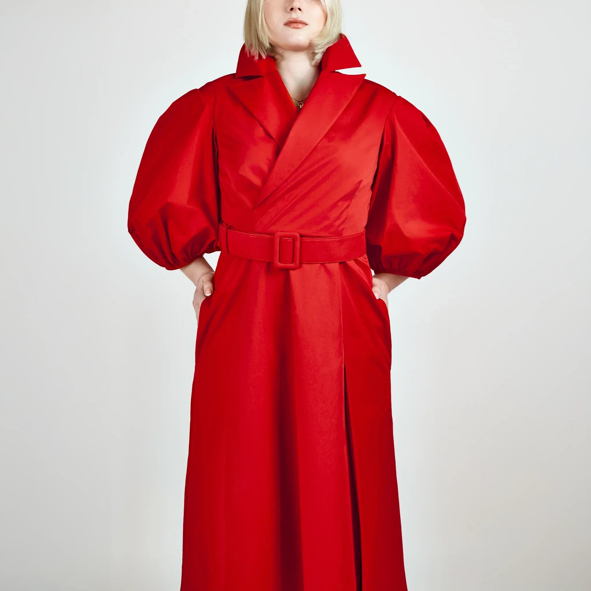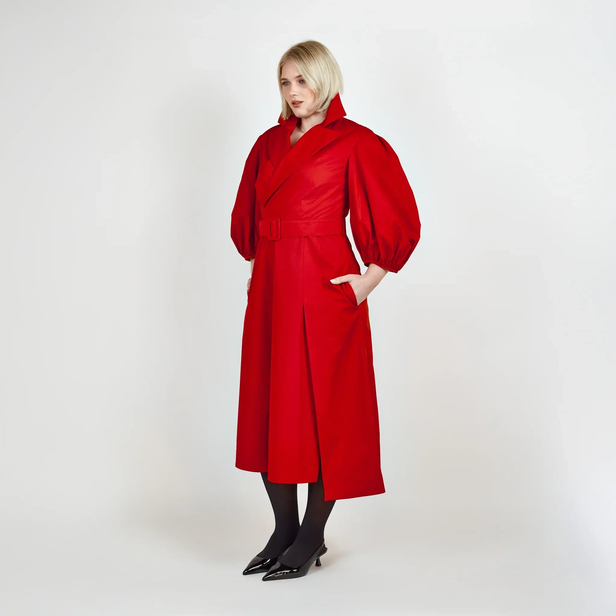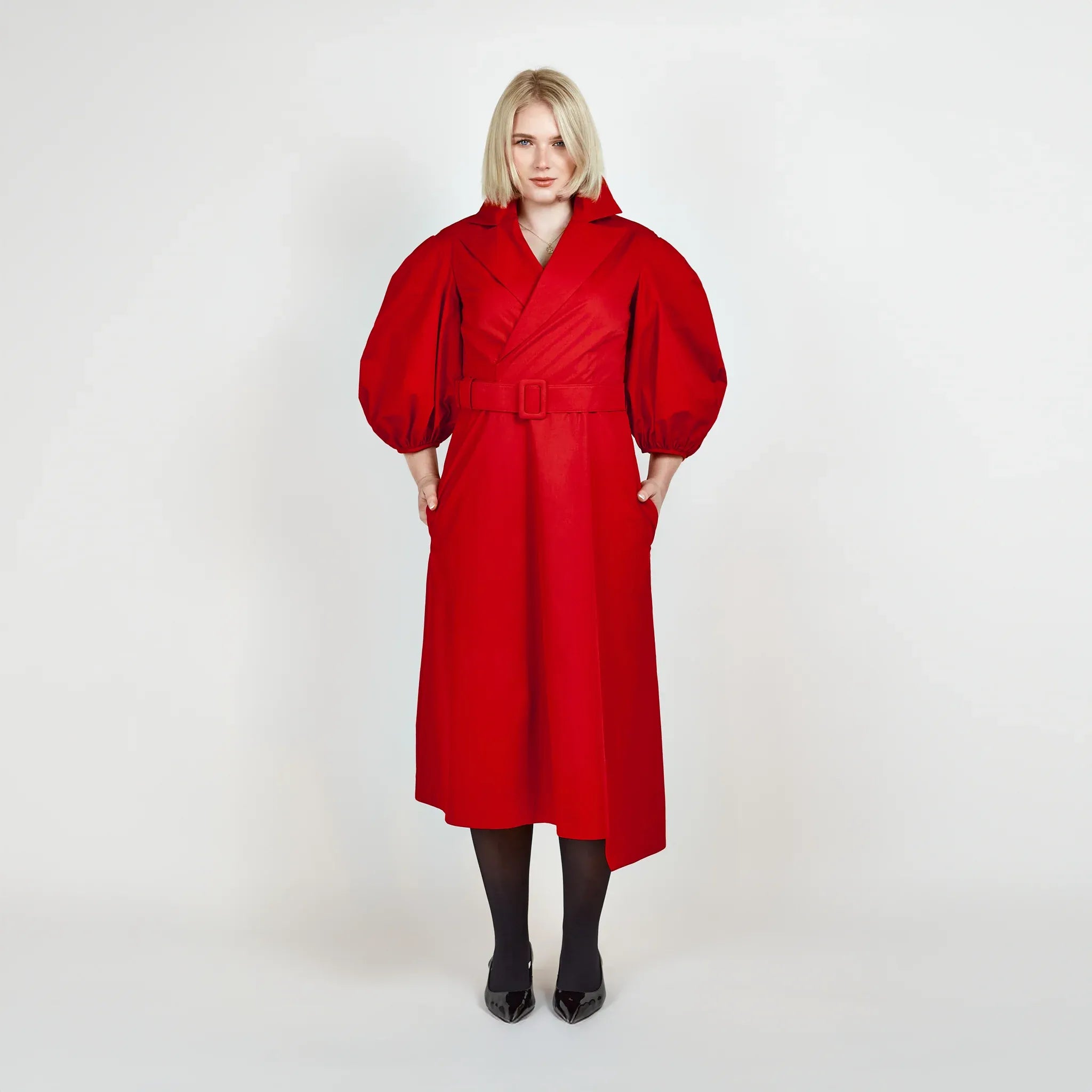 Introducing Femponiq's Wide Lapel Cotton Belted Dress in Red, now with enhanced features. This statement-making dress showcases a wide lapel collar, wrap-style V-neck, and belted waist, creating a flattering silhouette for any body type. Key features include a notched wide collar, cropped puff sleeves, concealed side zip fastening, and a mid-length A-line skirt with slits hidden in elongated side panels. Made from high-quality, medium-weight cotton, it offers exceptional comfort and breathability. The improved design includes reinforced stitching for added durability. Embrace confidence and style with this bold red cotton dress.