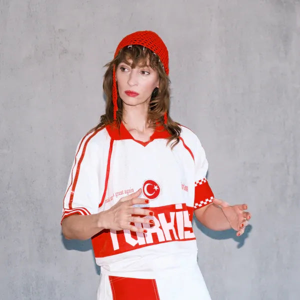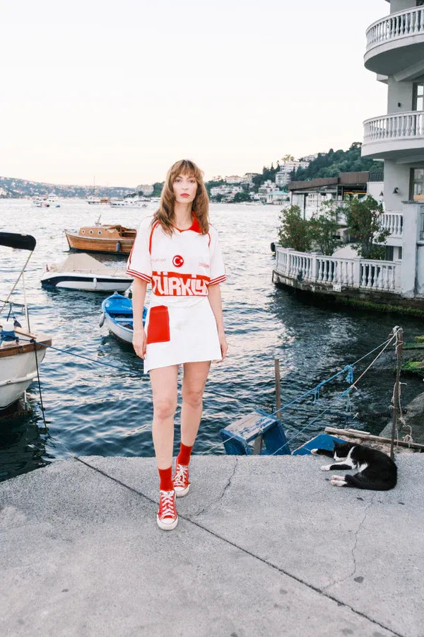 Kappa jersey fabric, Sequins on Shoulder Embroidery Stripe, Embroidery 'Pitrak' carpet motif on back, Turkey on the front, Printed on the chest 'Make Anatolia Great Again' motto, Cache Istanbul on the left chest, Turkish Flag-felt polo-turgerize, Oversize.